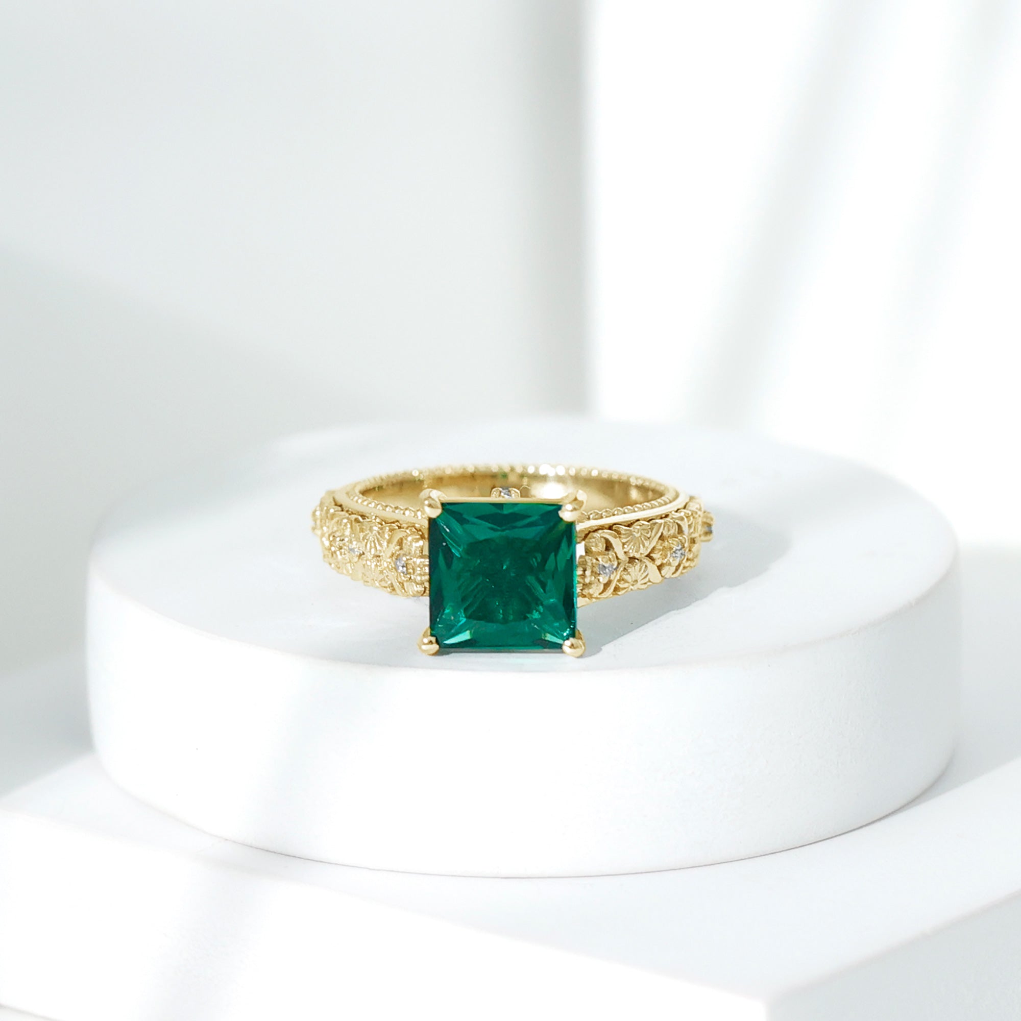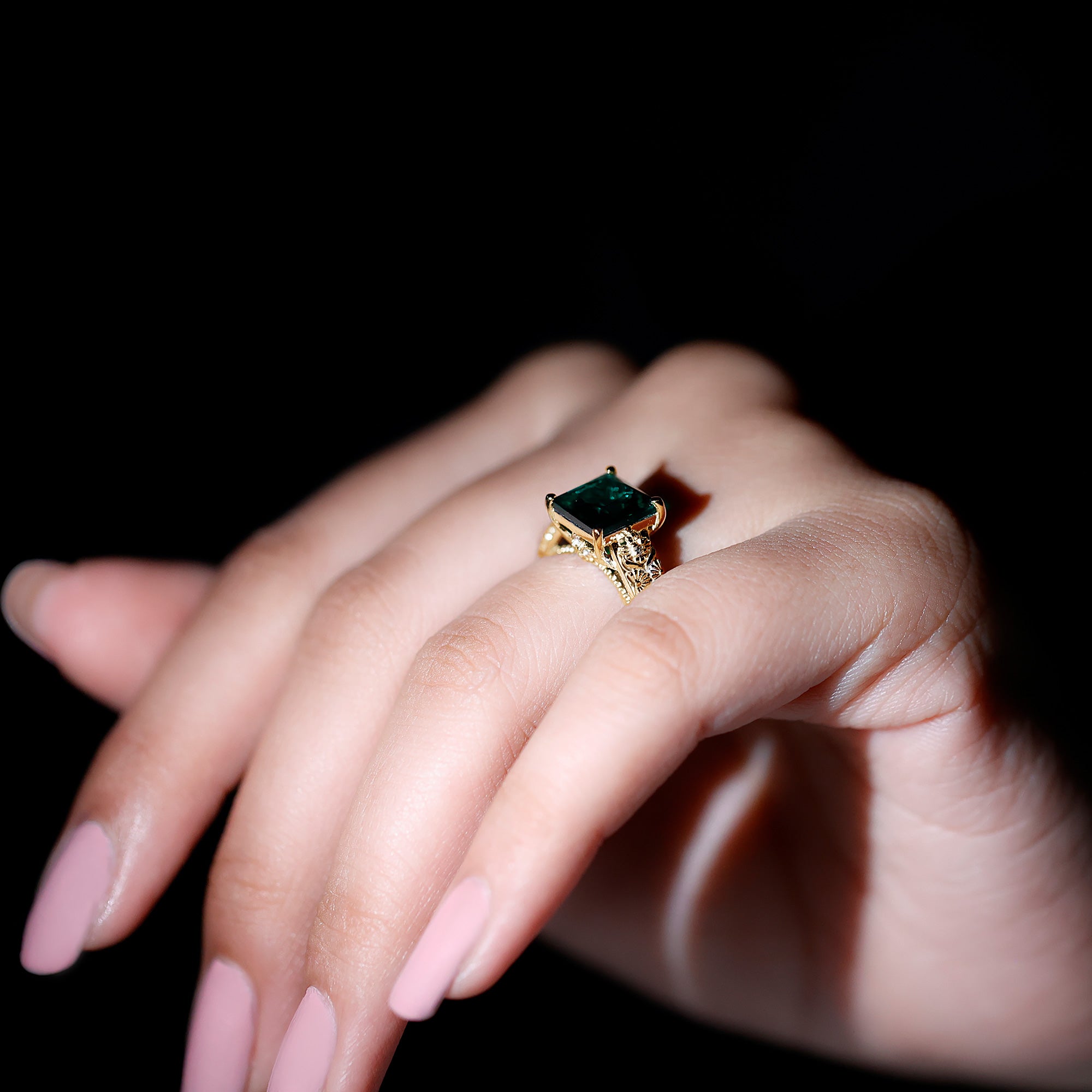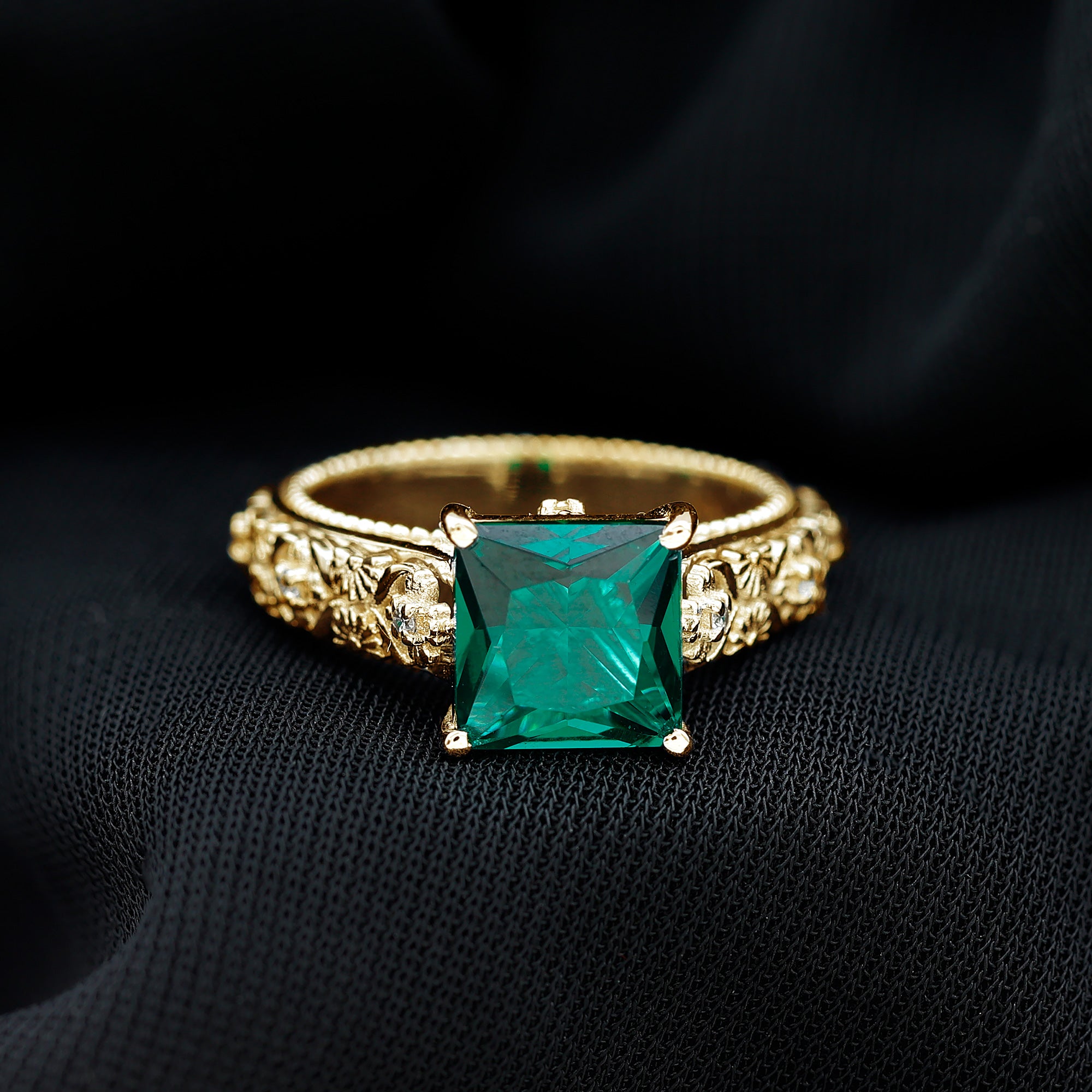 This gorgeous Lab Created Emerald Solitaire Ring makes for a statement accessory for women. Filigree Details are engraved on the band with Round Brilliant Diamond gemstones on the sides. This Vintage Engagement Ring is crafted in Gold. Gift this classic ring to your mother or wife.