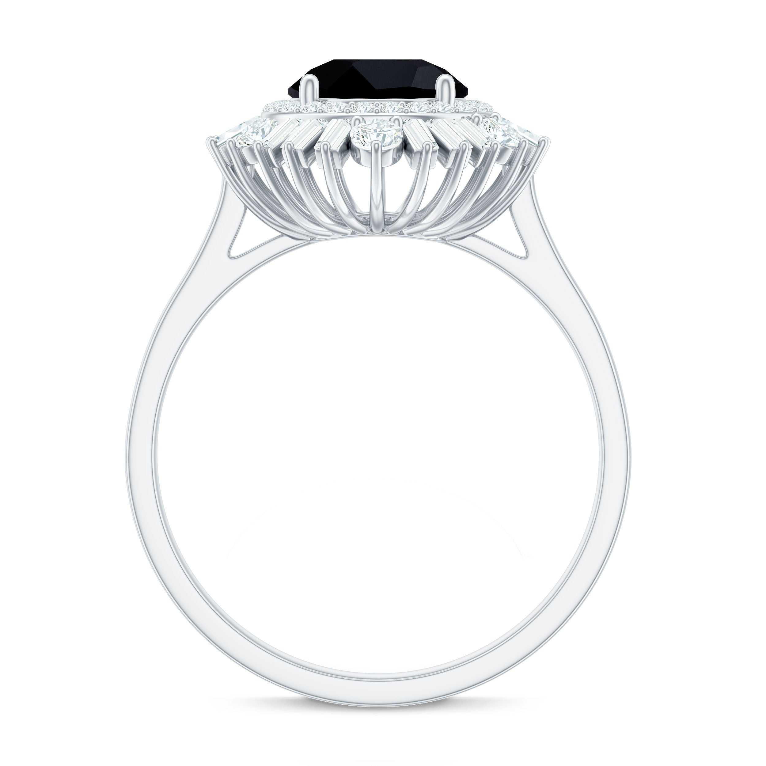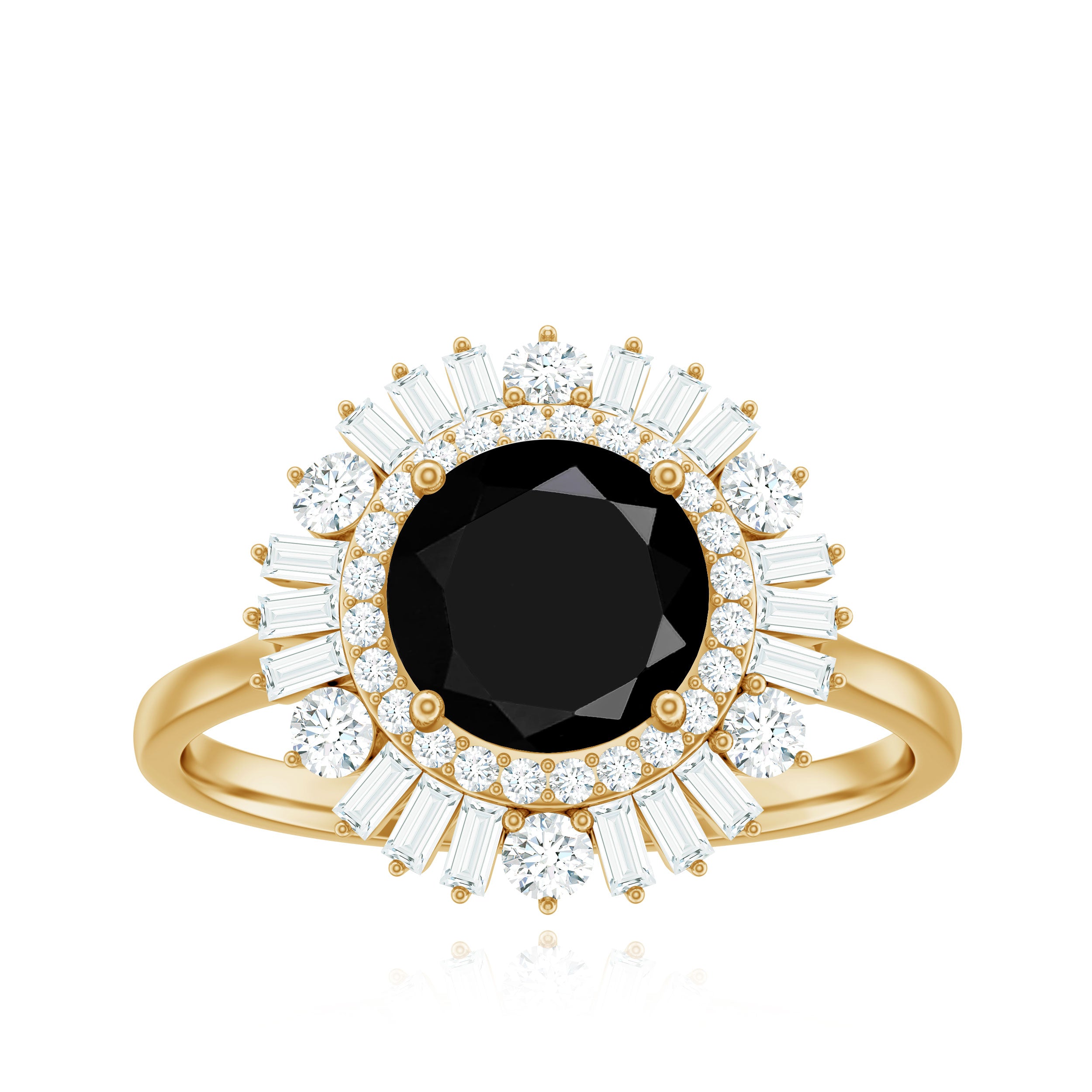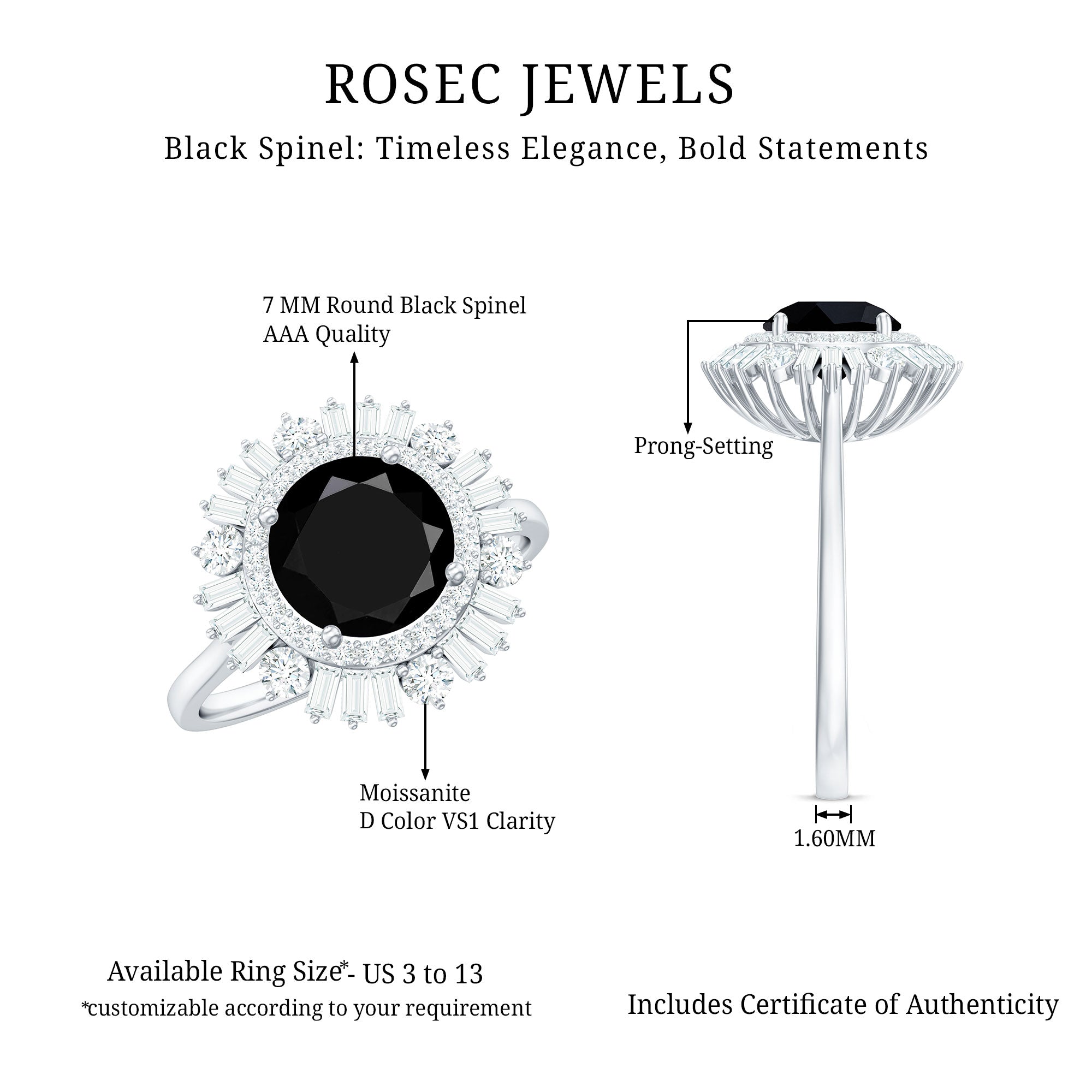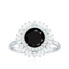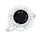 Style yourself with this exquisite cocktail ring featuring a round black spinel center stone set in prong setting. The bold black hue of the spinel is accentuated by the double halo of dazzling baguette and round shape moissanite gemstones that encircle it, creating a mesmerizing effect. Whether worn as an accessory for a special occasion or as an everyday accessory, this ring is a must-have for any fashion-forward individual looking to add some drama to their jewelry collection.