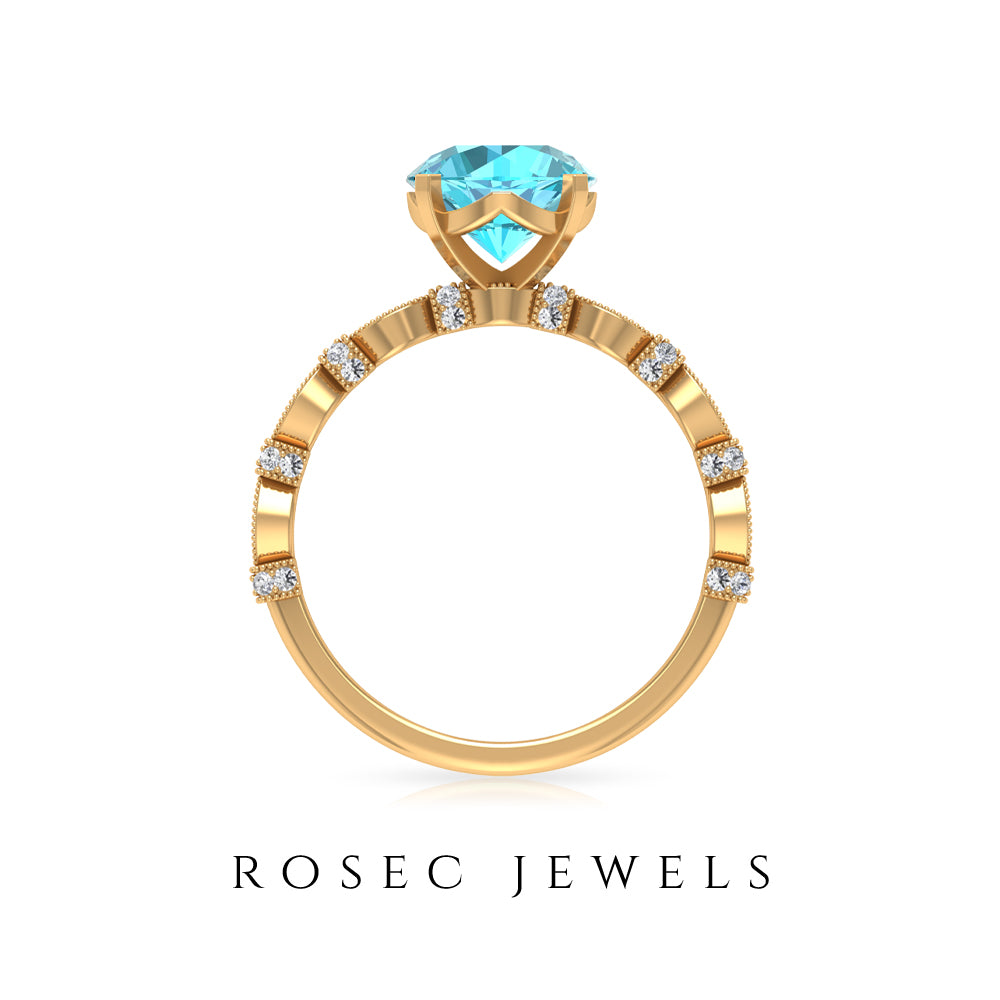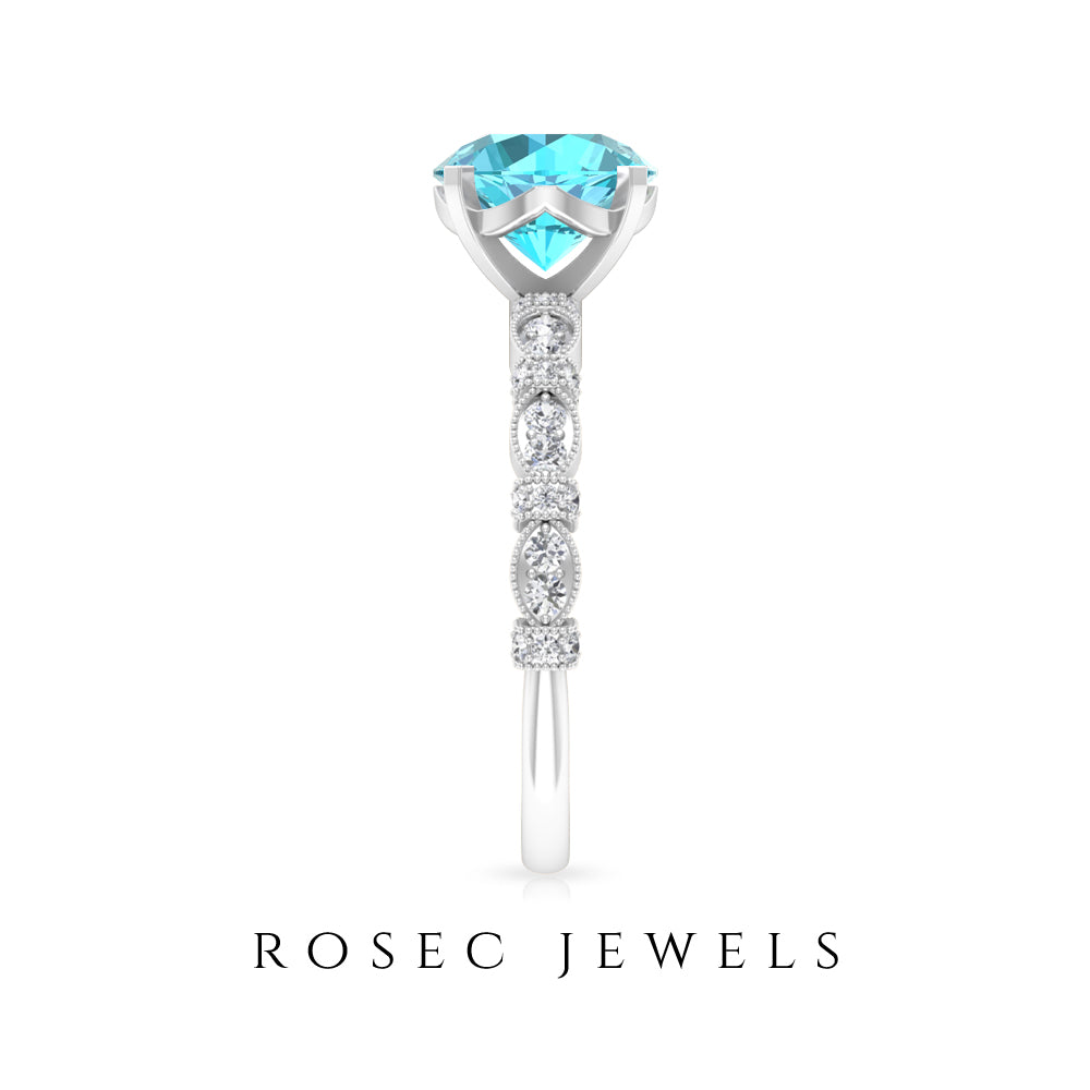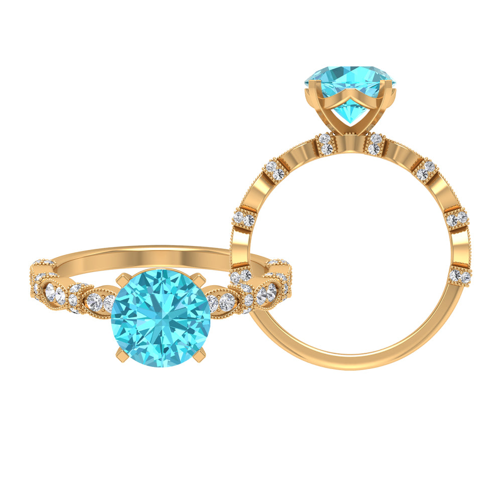 This Solitaire Engagement Ring is embellished with Round Shape Swiss Blue Topaz and Diamond Accent. The 8 MM Swiss Blue Topaz Solitaire Ring in Milgrain Accents will be a perfect Engagement Ring for a woman.