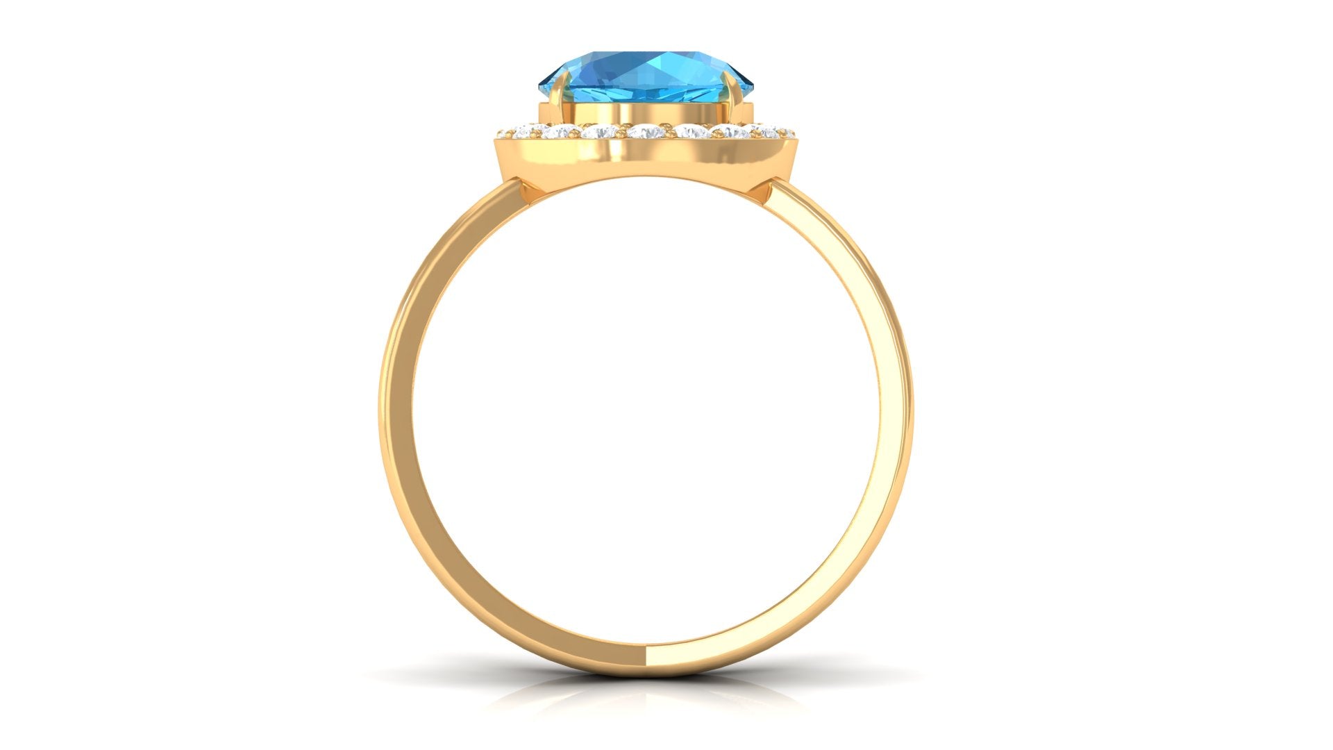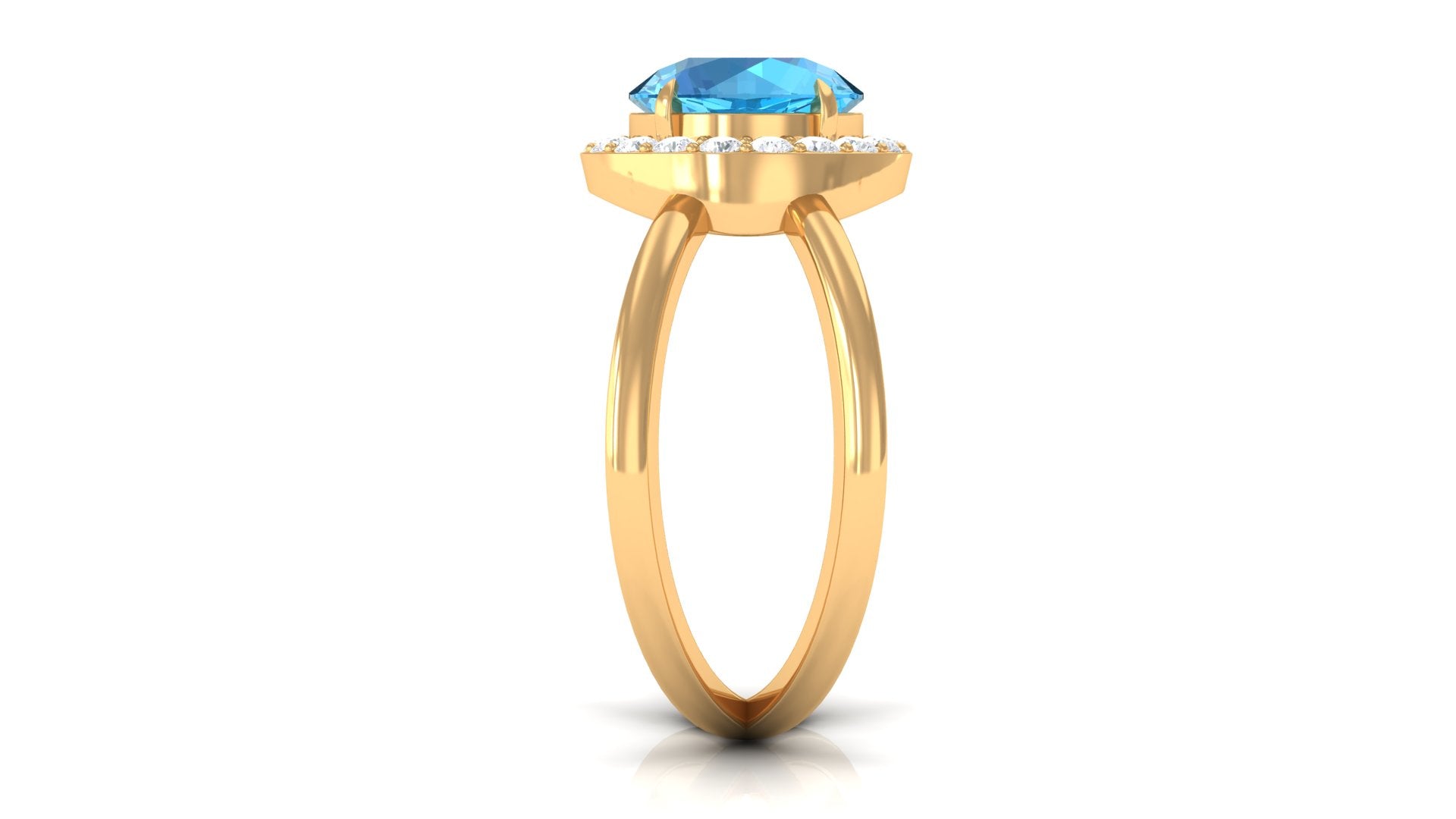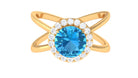 It is a Split Shank Ring adorned in Gold for Women featuring Round Shape Swiss Blue Topaz as Solitaire embellished in Prong Setting with Round Brilliant Diamond embellished in Pave Setting for you.