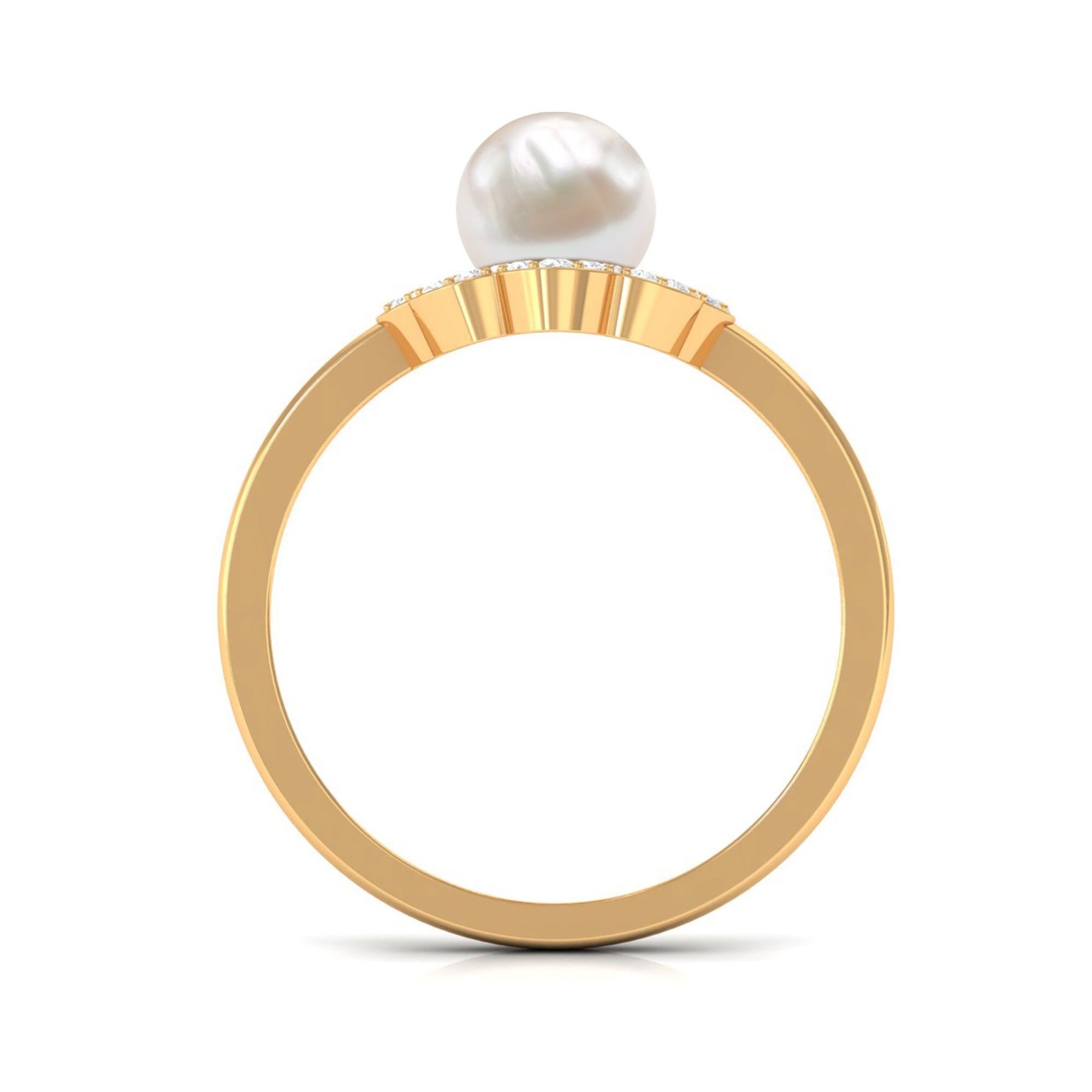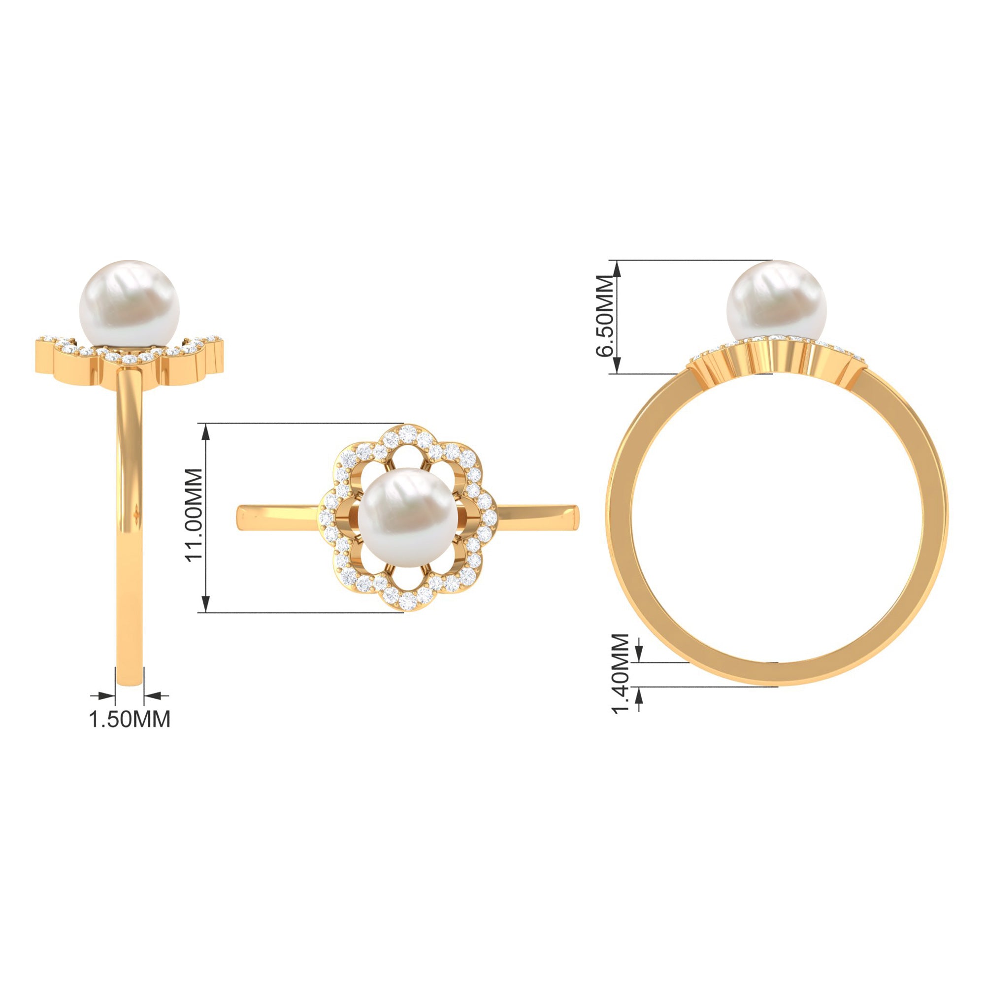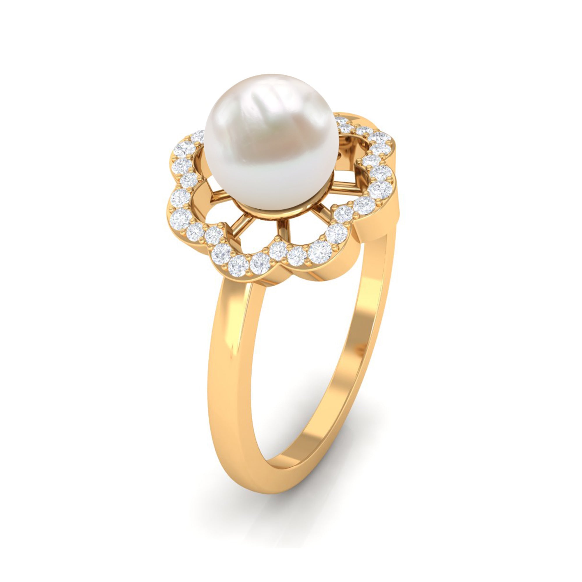 A Simply amazing and Classic Freshwater Pearl Diamond Engagement Ring embellished with Round Shape Freshwater Pearl is studded as Solitaire with Round Shape Diamond Studded Beautifully as a floral halo in Surface Prong Setting. This beautiful Freshwater Pearl Engagement Ring is composed of Gold to make it a piece of womens fine jewelry.