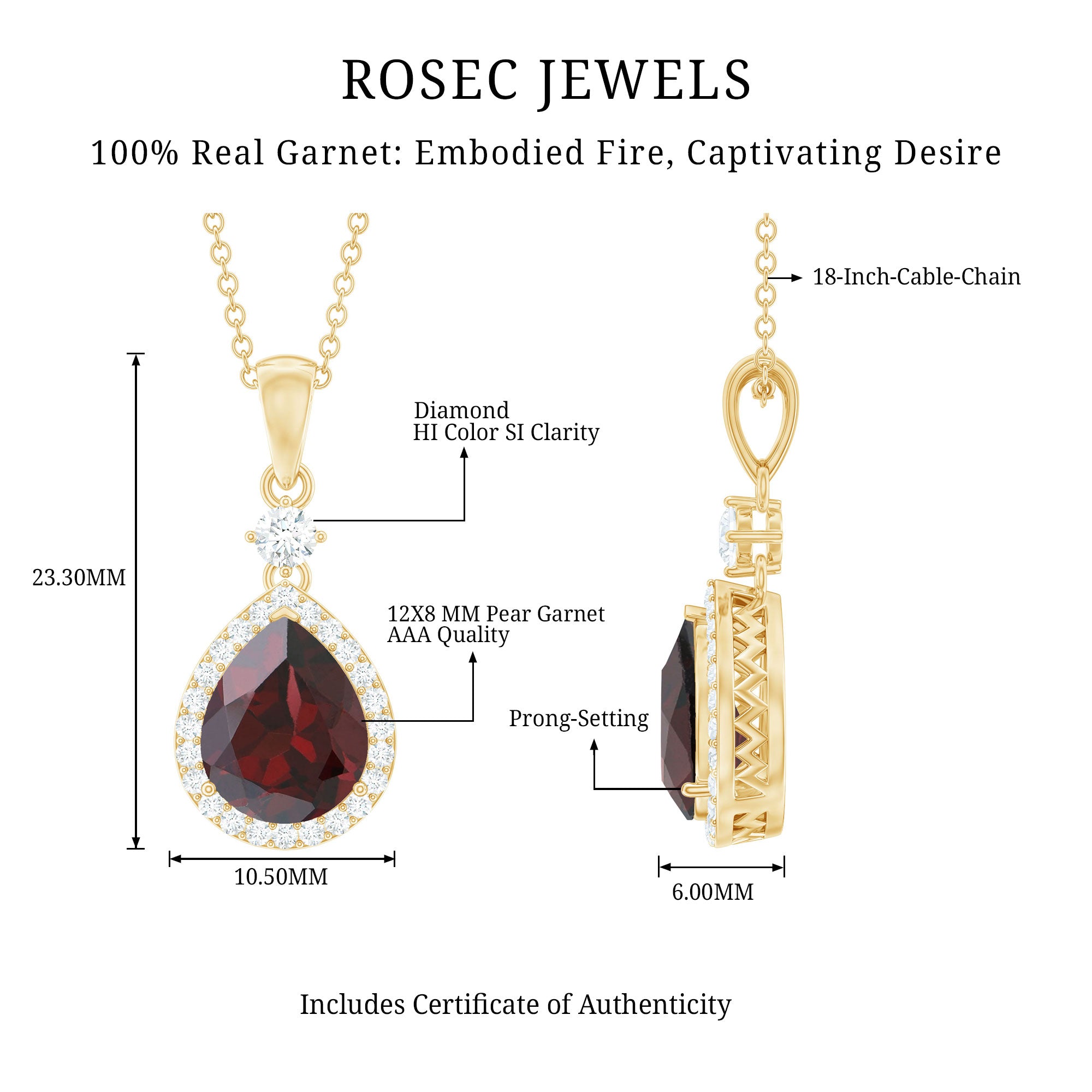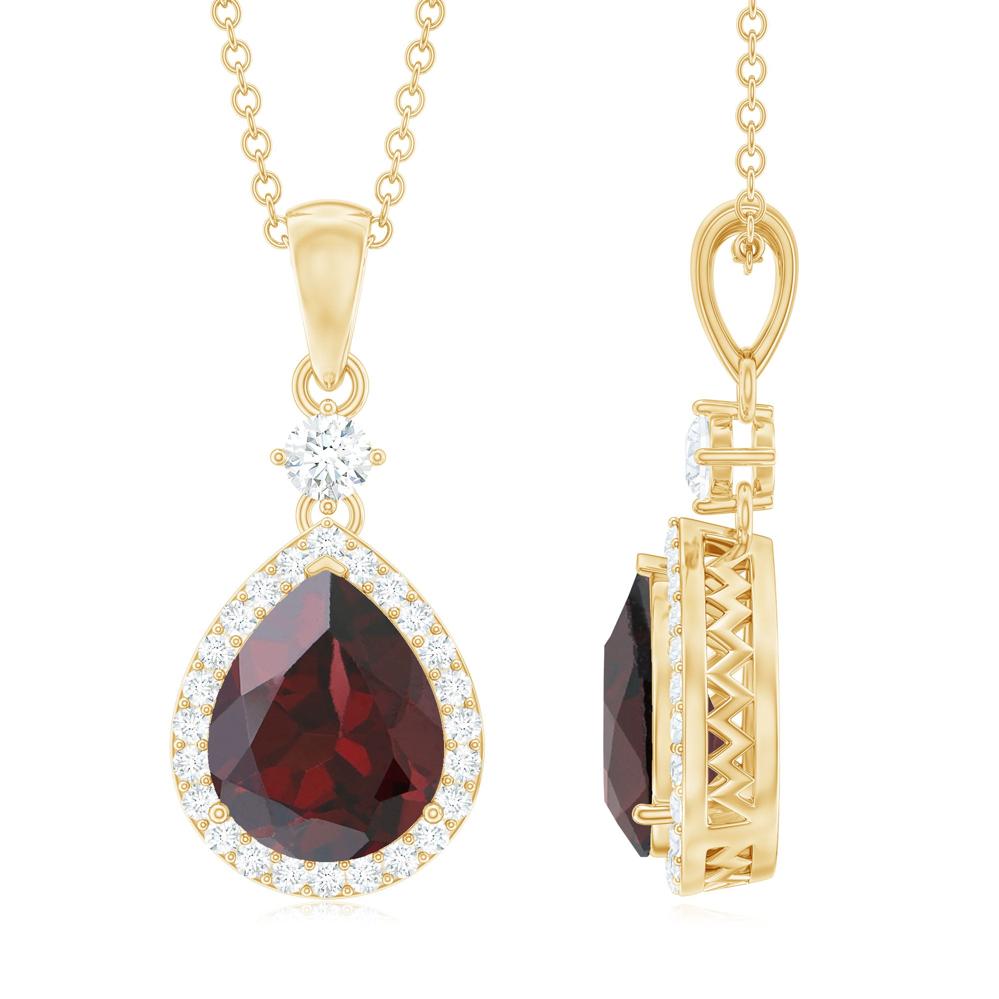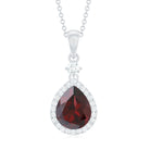 The Pear Shaped Garnet Necklace is crafted in 10K, and 18K Solid Gold as a Drop of Brilliant Round Diamond in Prong Setting. The Teardrop Garnet as a Solitaire is embellished with a Halo of Diamonds. Grab this lovely Pear Shaped Garnet Pendant for your lovely partner.