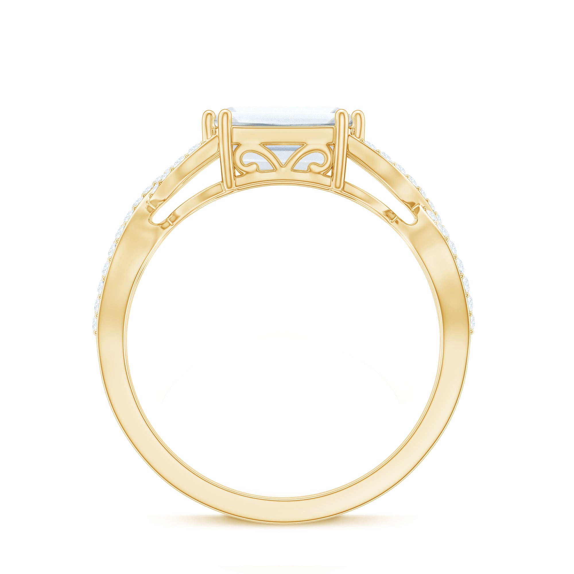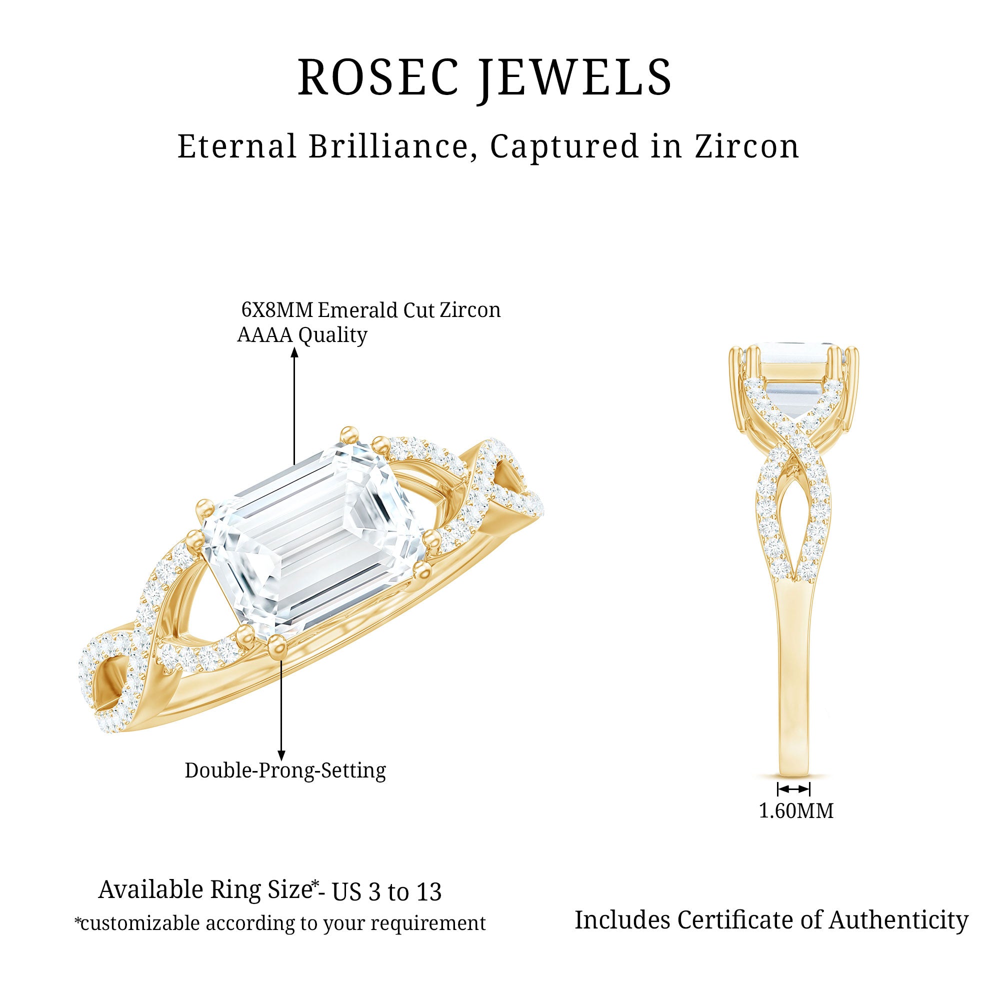 Express your endless love for your partner with this exquisite Zircon Engagement Ring. It features an octagon-cut zircon in a double prong setting on an east-west ring, symbolizing your unbreakable bond. Crafted from gold, this crossover infinity ring adds a touch of elegance to any look.