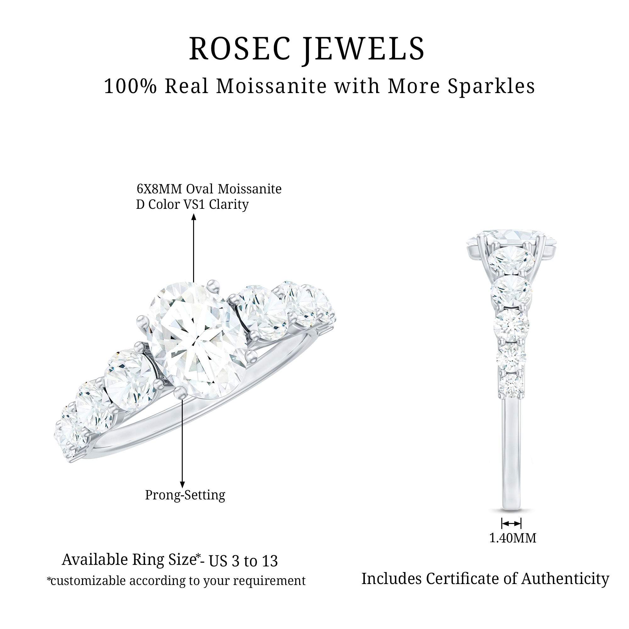 2.75 CT Oval Cut Moissanite Solitaire Ring with Side Stones