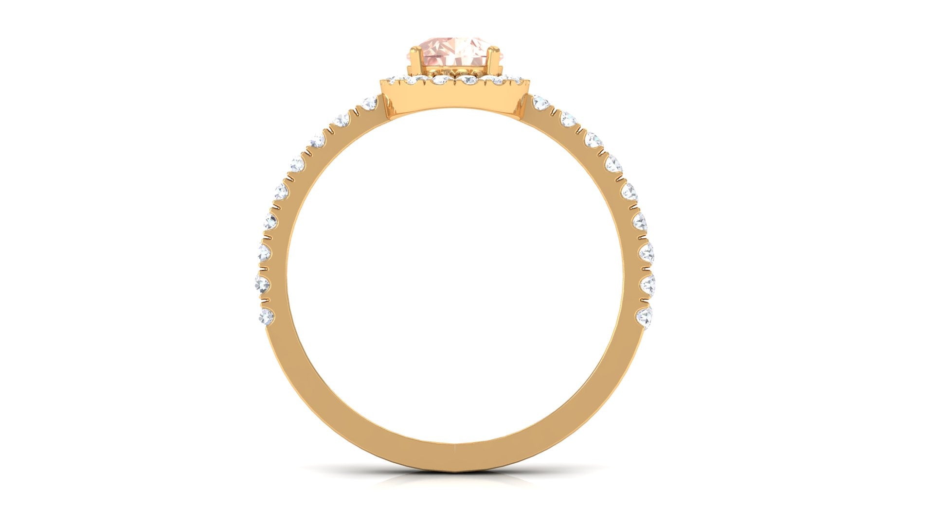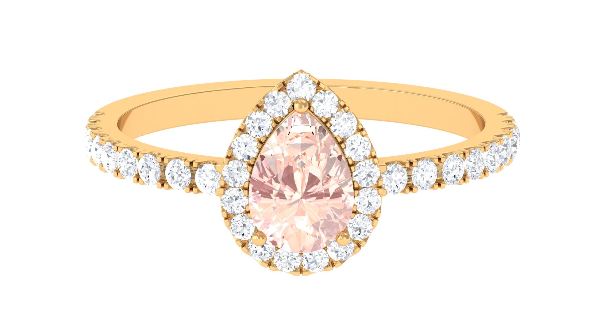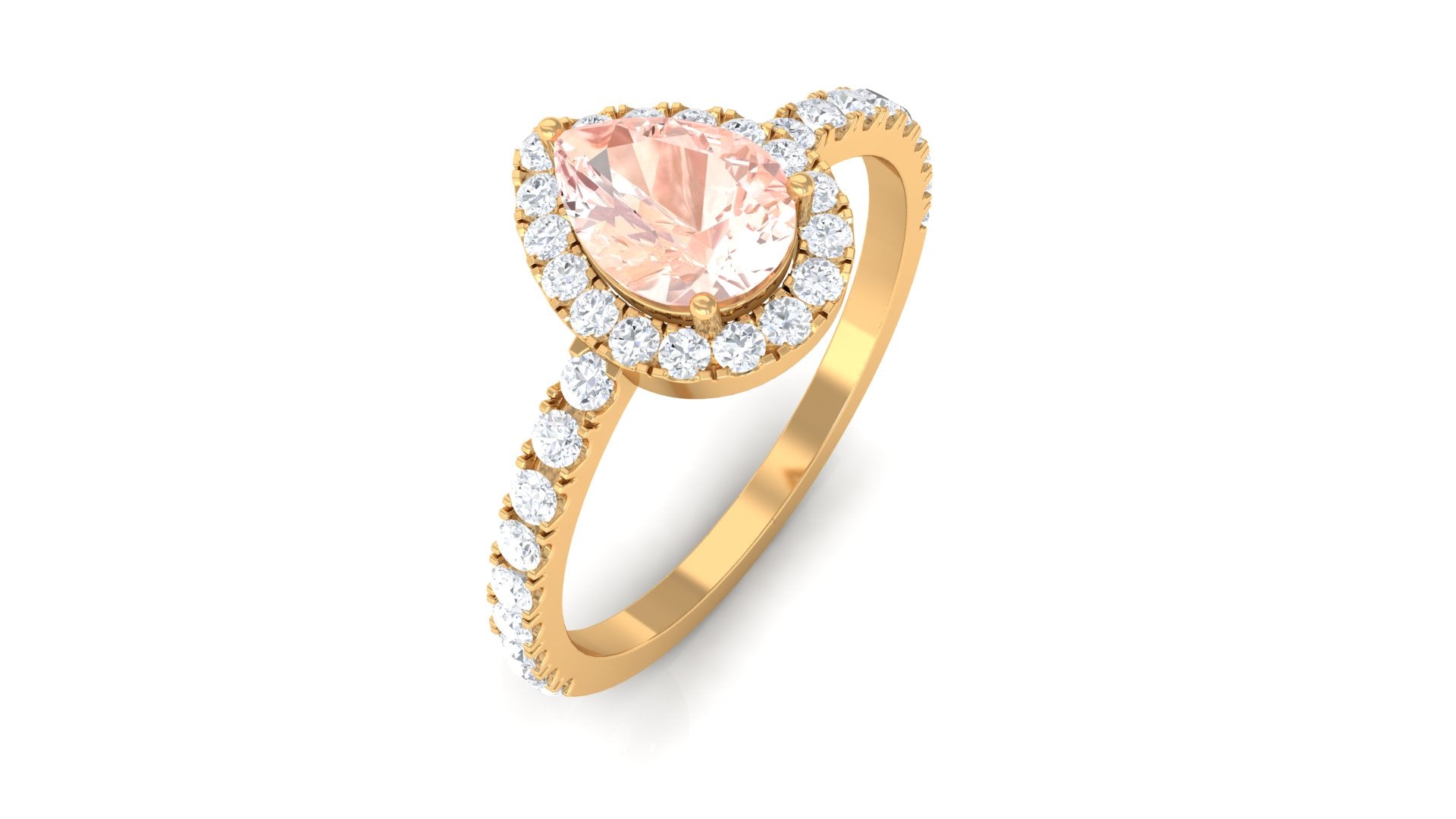 Embark the new journey of your life with this beautiful Engagement Ring adorned with Pear Cut Morganite Solitaire with a Halo of petite Round Shape Diamond with Side Stones. This Simple Engagement Ring is crafted with Solid Gold to make for a luxe choice for your special day.
