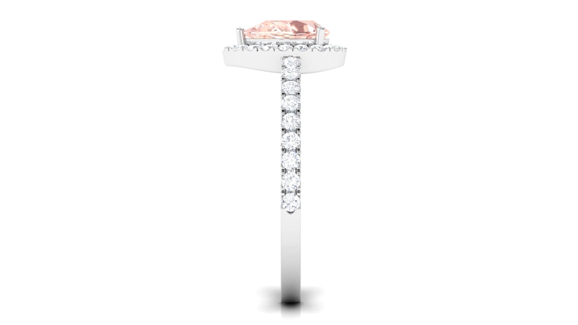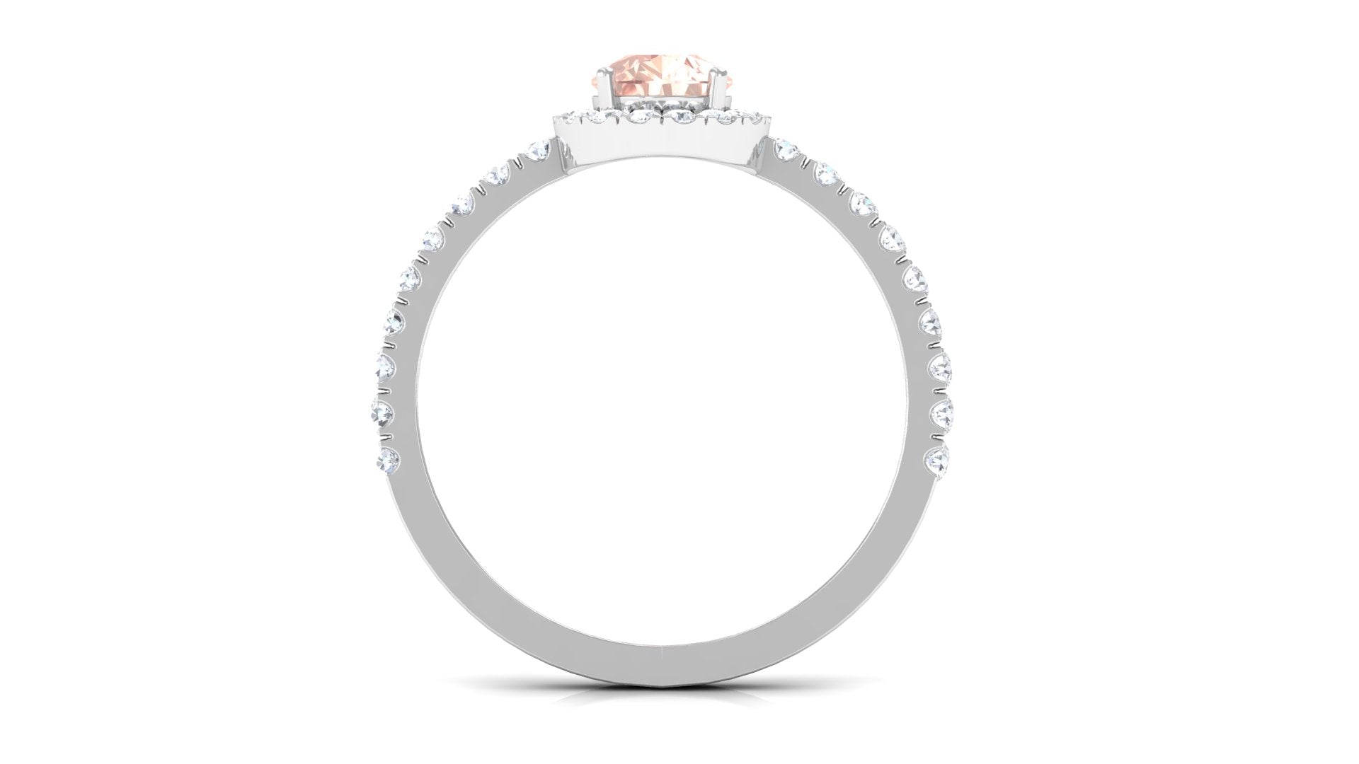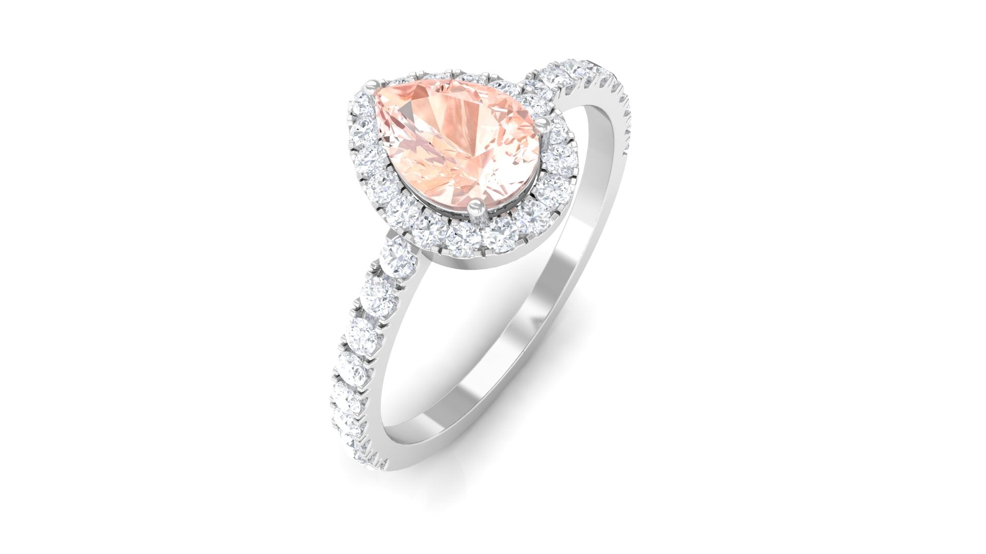 Embark the new journey of your life with this beautiful Engagement Ring adorned with Pear Cut Morganite Solitaire with a Halo of petite Round Shape Diamond with Side Stones. This Simple Engagement Ring is crafted with Solid Gold to make for a luxe choice for your special day.