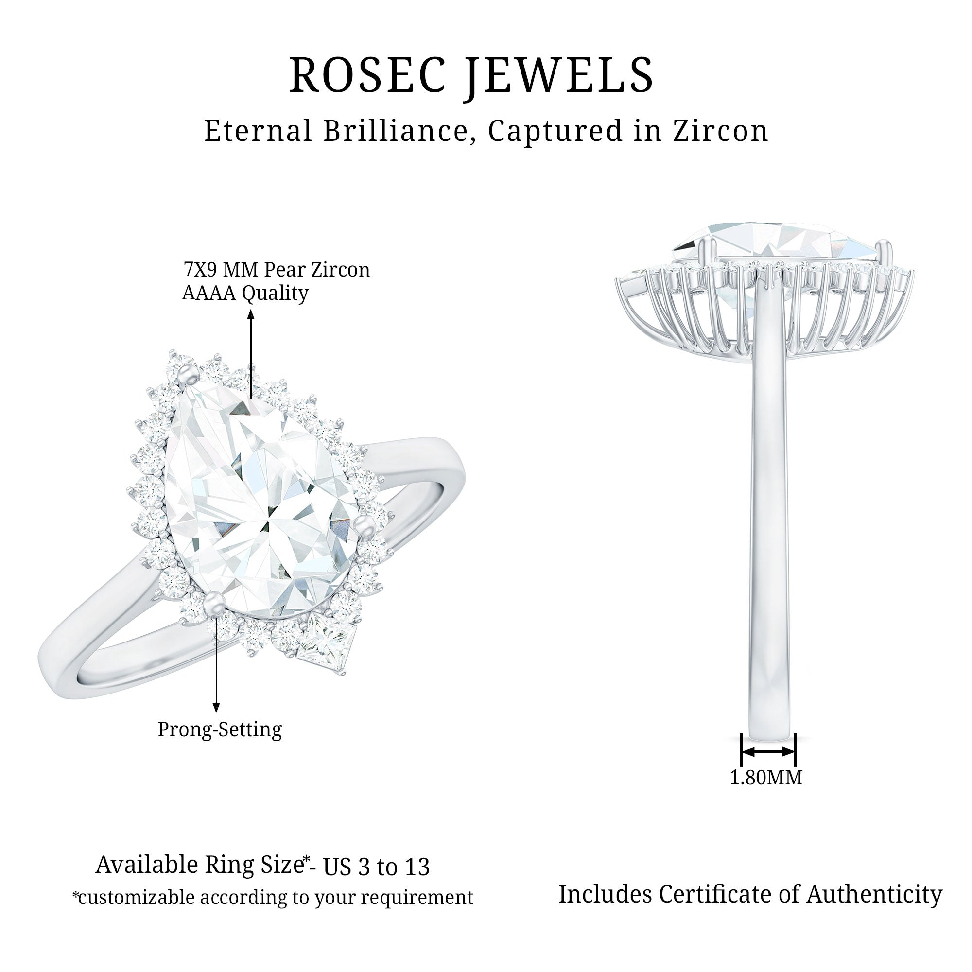 A perfect ring is a more precise way to express emotions to your better half. This beautiful Simulated Diamond ring will make her feel on cloud nine, the Zircon Engagement Ring effortlessly draws your attention. This Cocktail ring is embellished with Pear Cut Zircon surrounded by the princess and round-cut zircon Halo, creating a glistening appeal. This Teardrop Ring is an excellent choice for Cocktail Engagement jewelry.