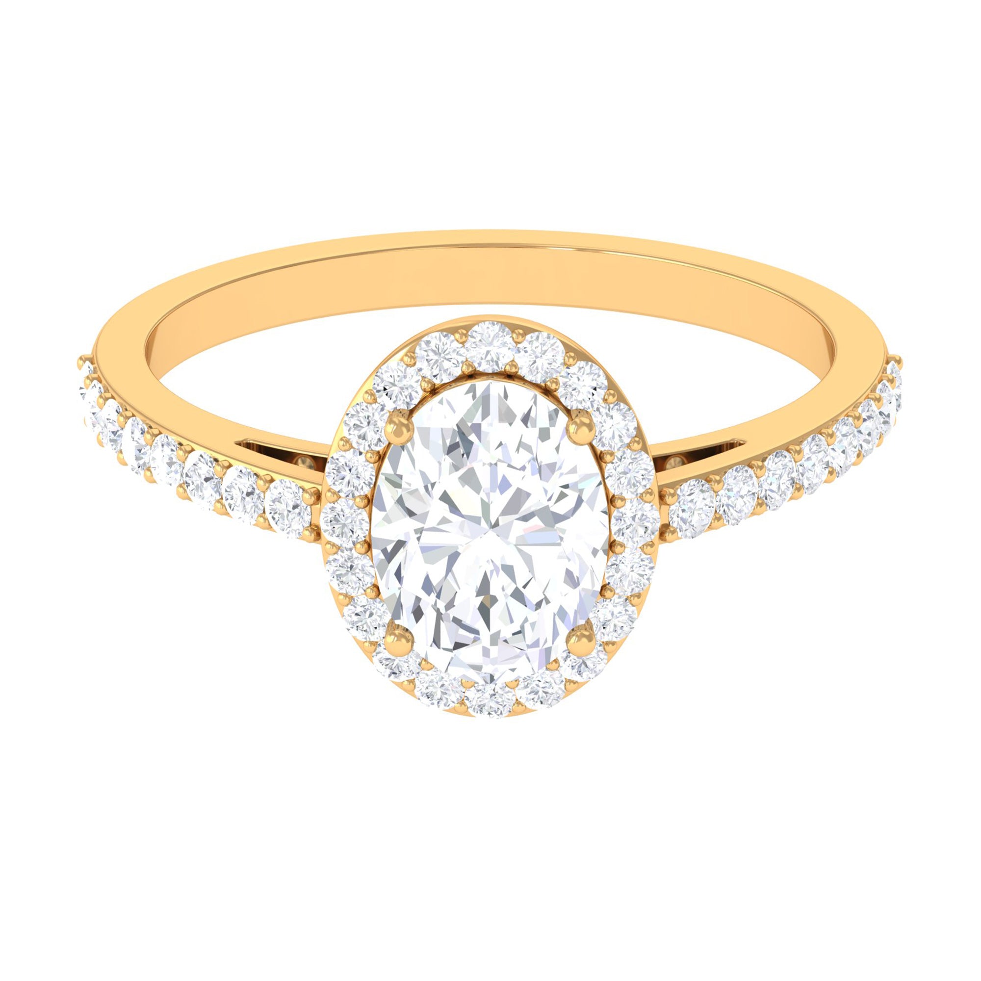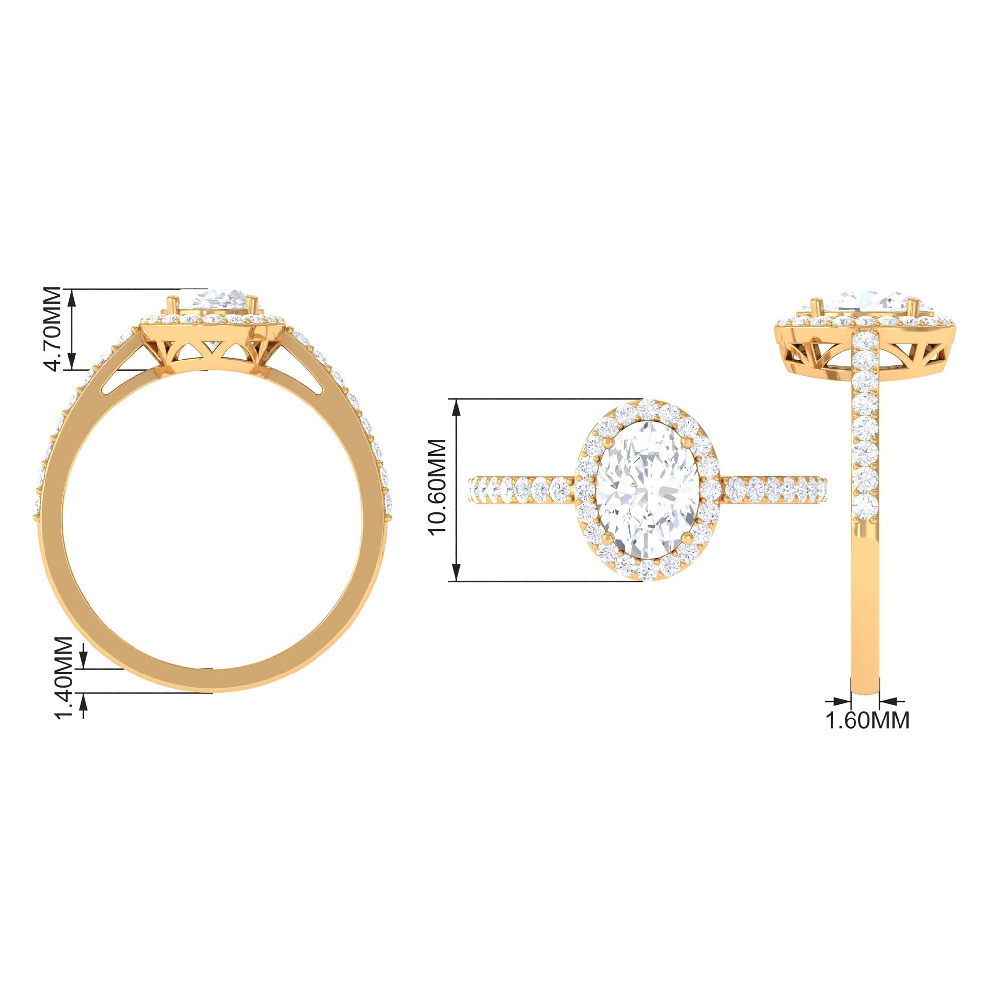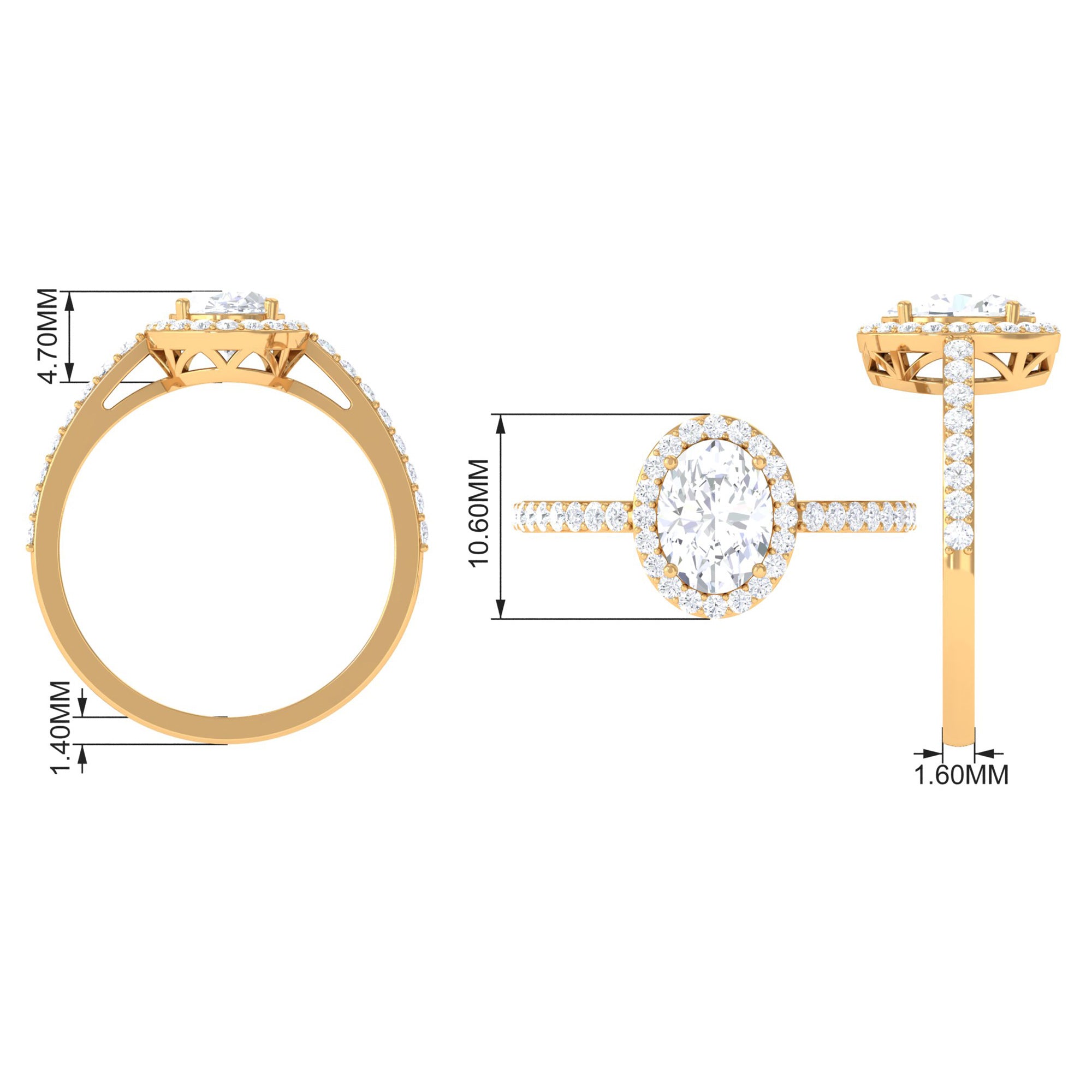 Your love is a tale as old as time, true as it can be. Put this charming Oval Halo Engagement Ring on her finger. This Cubic Zirconia Engagement Ring features a Oval Shape center stone with an impeccably radiant shine and Round Shape Zircon set as Halo and Side Stones in a simple way, crafted in gold.