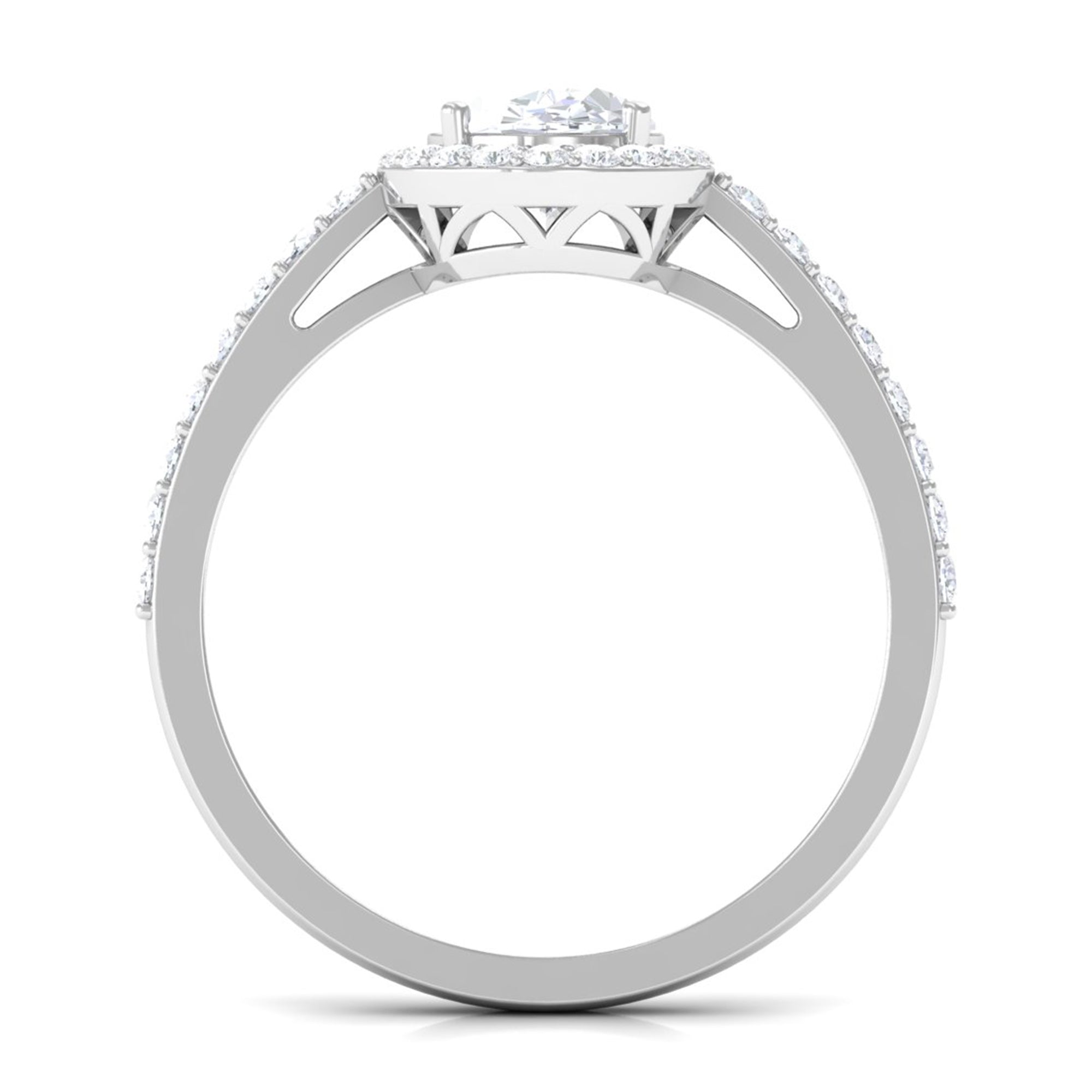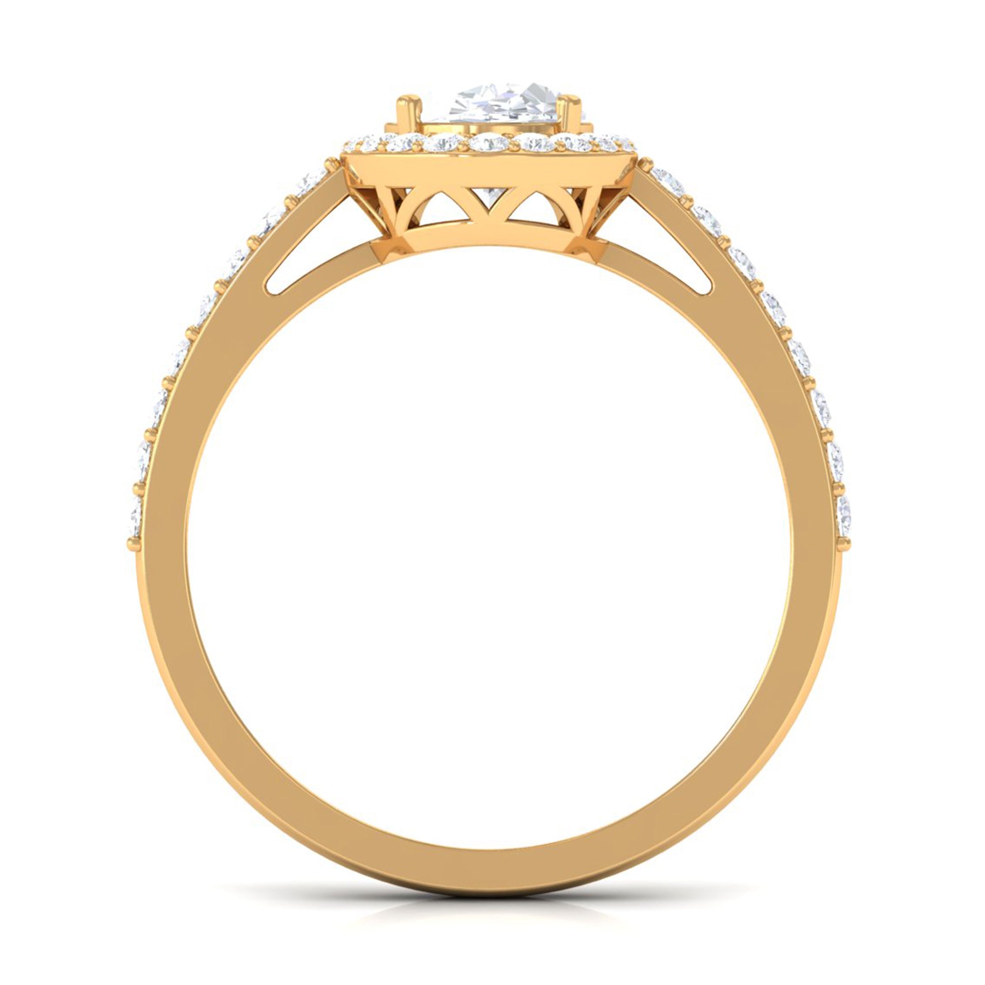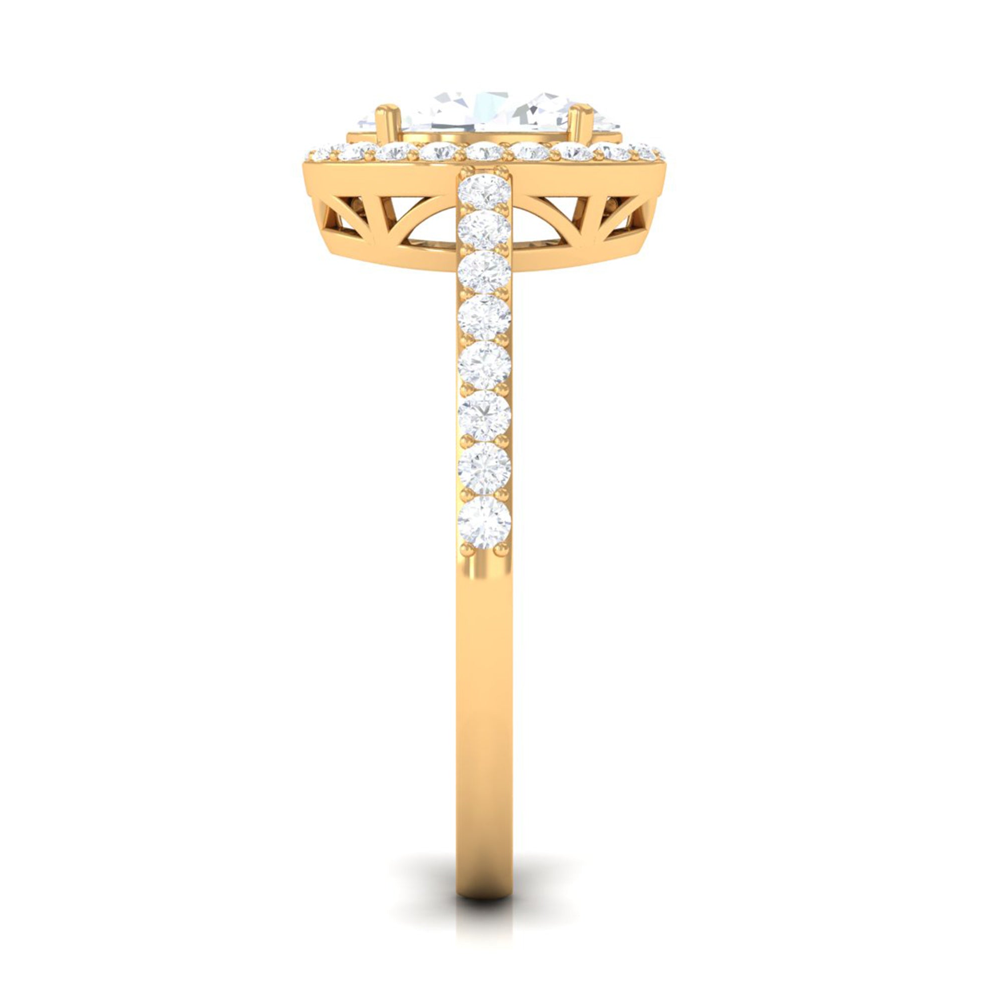 Your love is a tale as old as time, true as it can be. Put this charming Oval Halo Engagement Ring on her finger. This Cubic Zirconia Engagement Ring features a Oval Shape center stone with an impeccably radiant shine and Round Shape Zircon set as Halo and Side Stones in a simple way, crafted in gold.