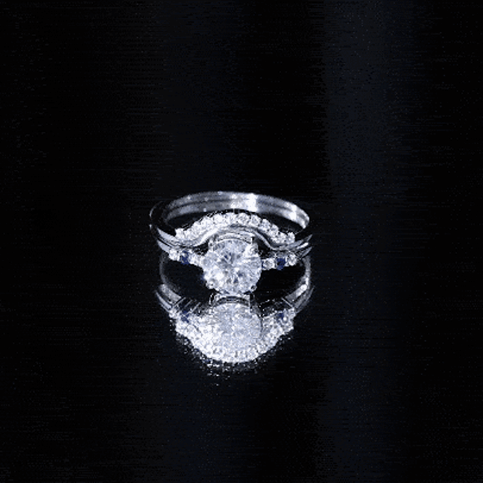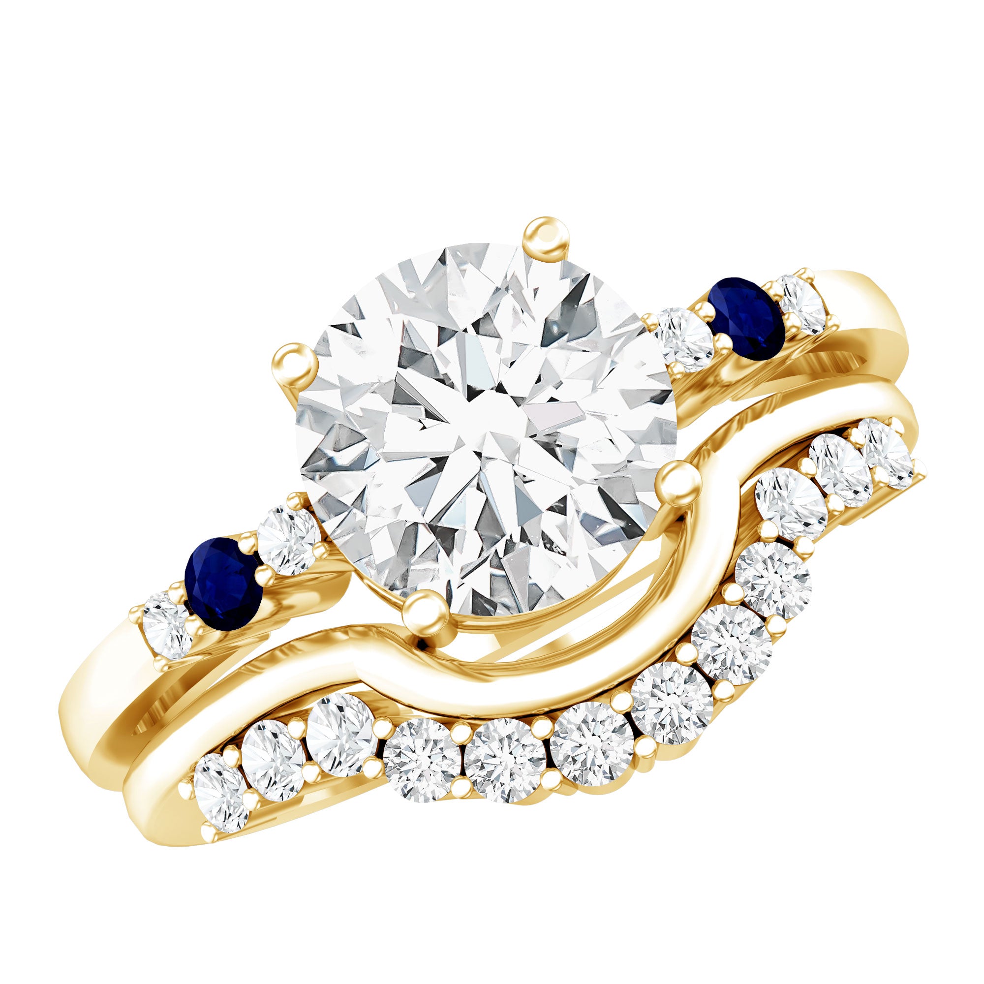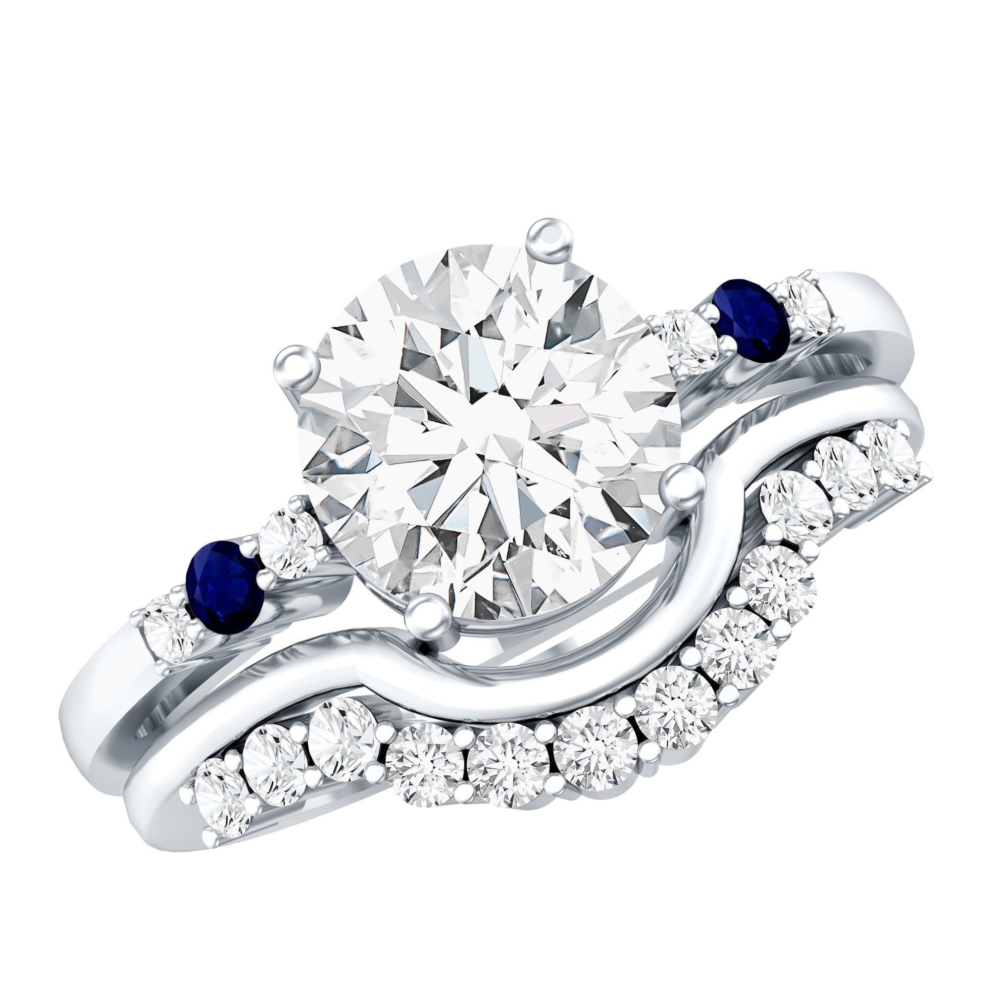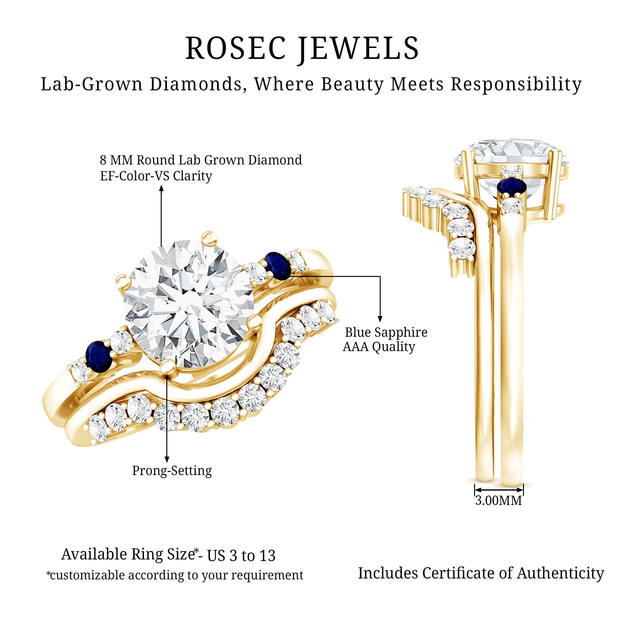 Burst with brilliance when you wear this Diamond Wedding Ring Set, a timeless jewel that is ready to make a statement. This ring set of 2 includes an Engagement Ring with Band, it features a central 8 MM round-shaped lab grown diamond of EF-VS quality set in secure prong setting with round blue sapphire and smaller diamonds set as side stones. The matching Enhancer Band is graced with more diamond stones and perfectly curved to complement the solitaire ring. Whether worn together for a bold statement or separately for versatile styling, this Bridal Ring Set is a true reflection of love and commitment, perfect for the bride-to-be who deserves something extraordinary.