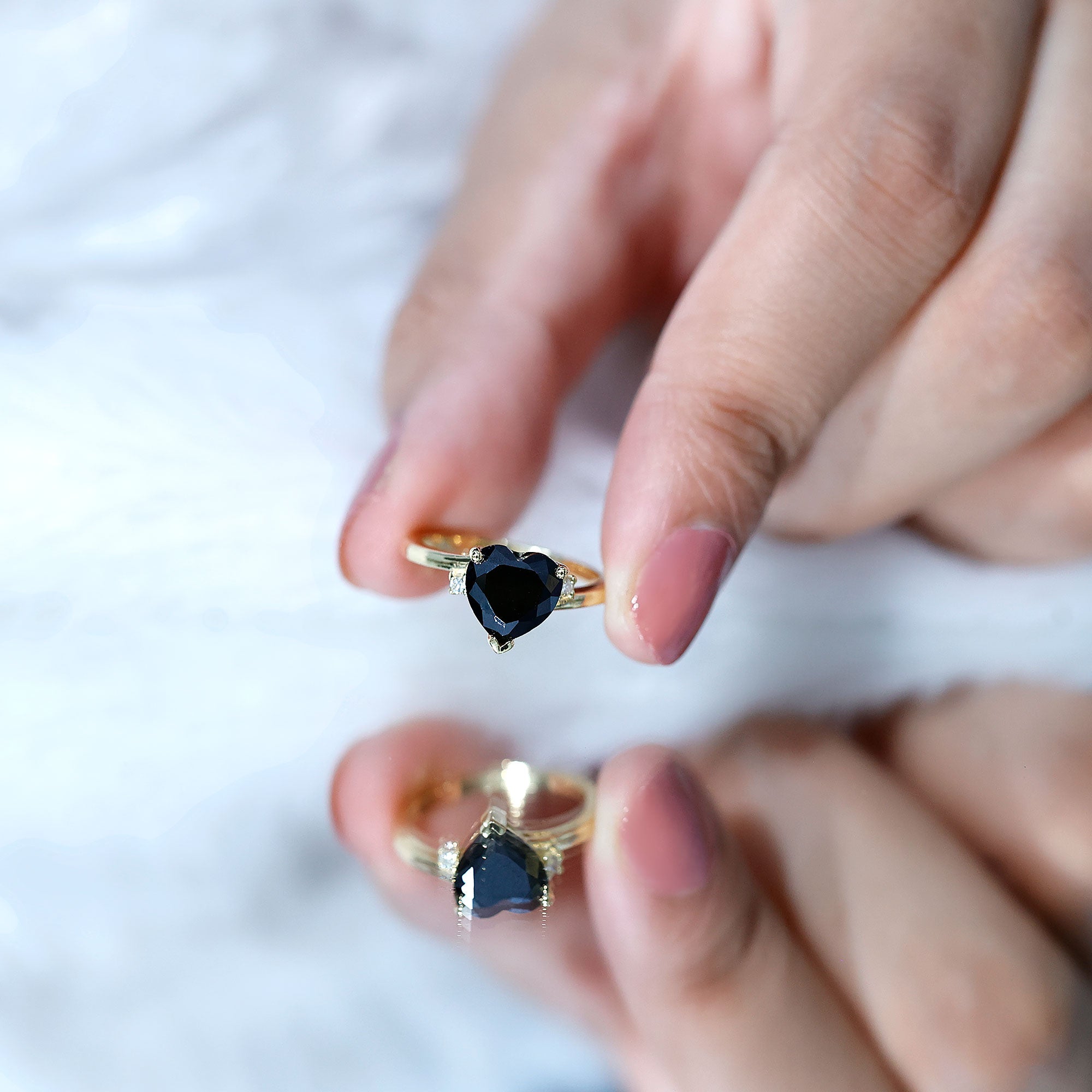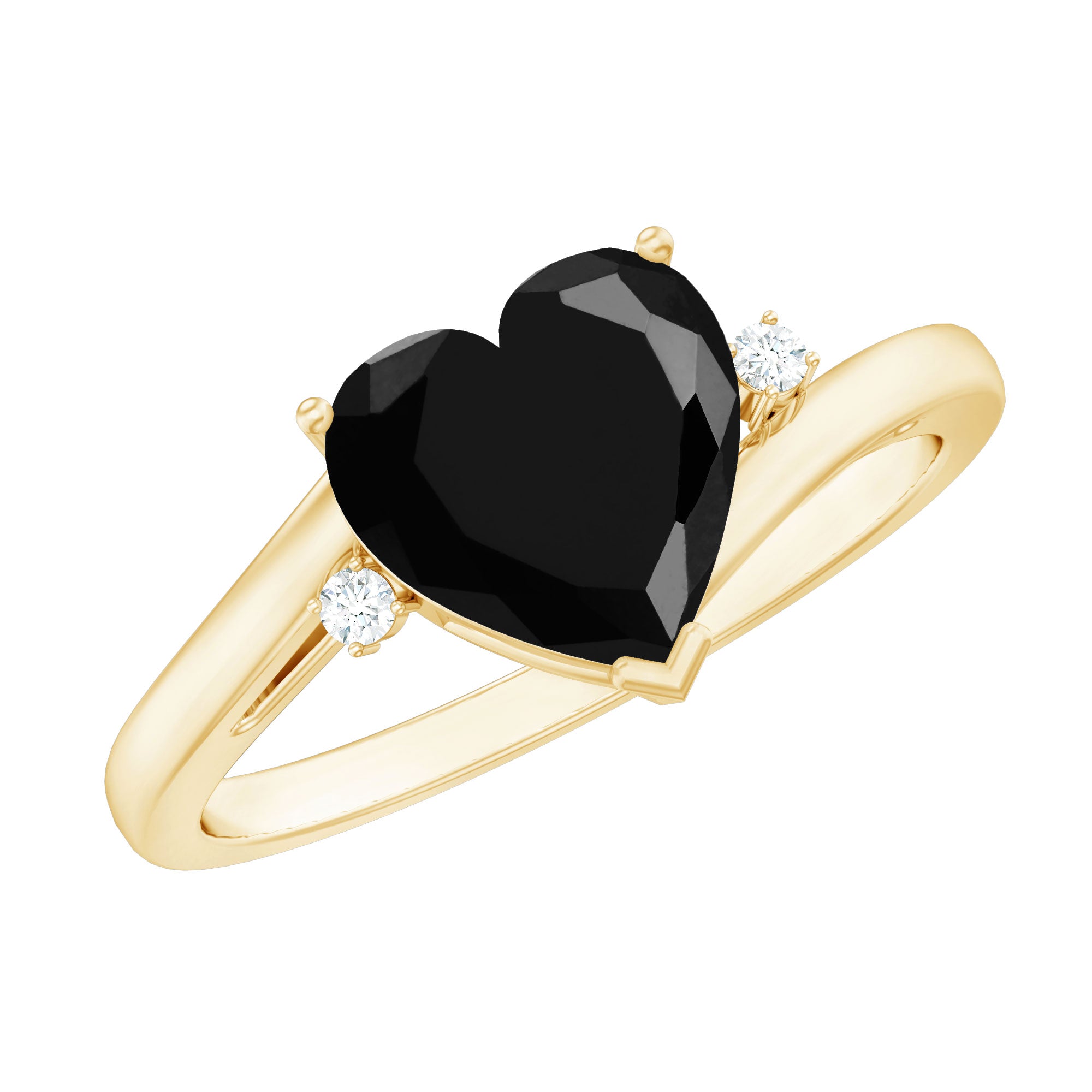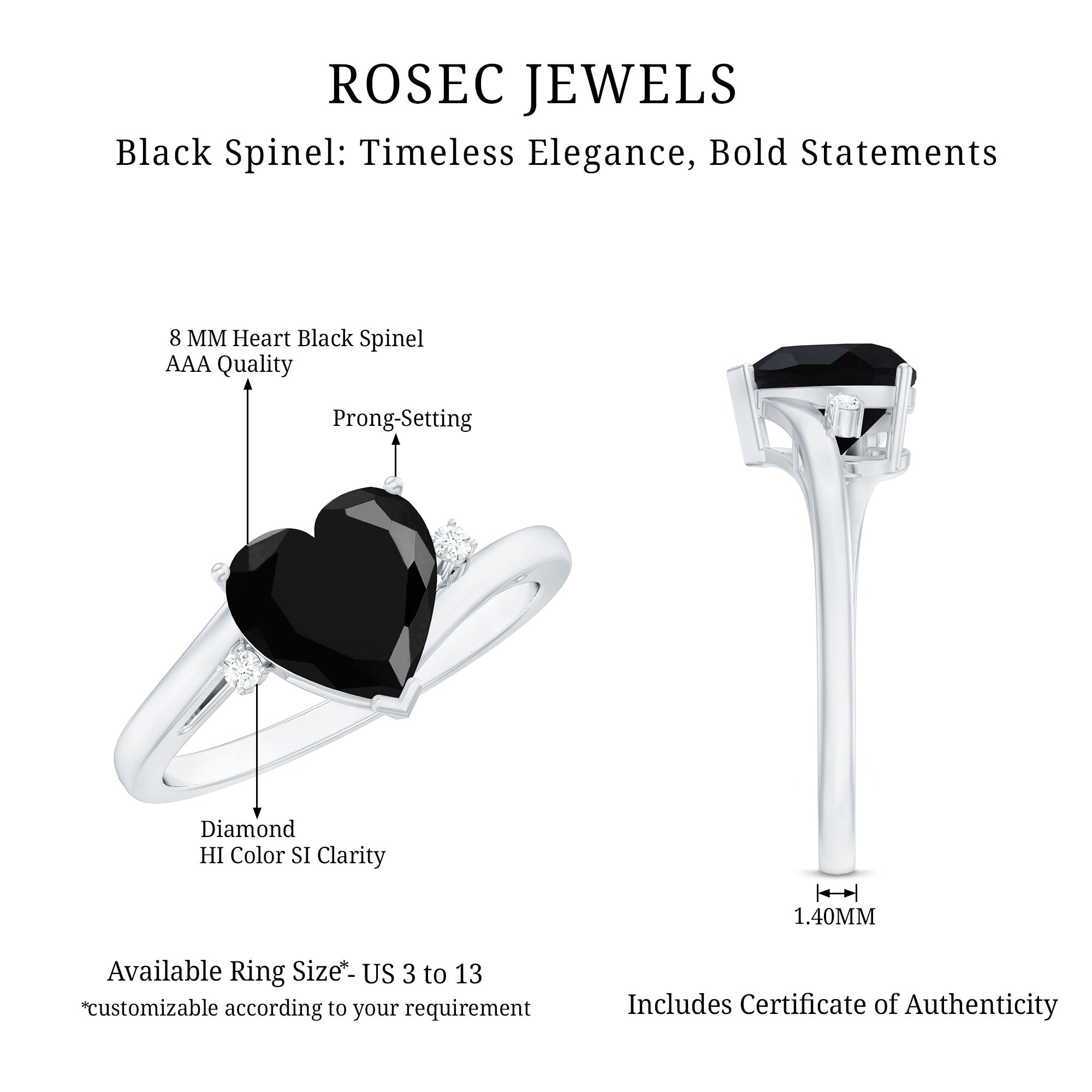 Express your feelings genuinely with this beautiful Heart Shaped Engagement Ring, crafted for unforgettable moments. At its heart lies an 8 MM heart-shaped black spinel, securely held in prong setting. Flanking it are two delicate, sparkling round cut diamonds that add a touch of brilliance and contrast. The bypass band is elegantly designed with plain metal, providing a comfort that feels light and airy. This Black Spinel and Diamond Engagement Ring is an ideal selection for anyone who appreciates classic designs with a contemporary flair. Whether you are gearing up to propose or simply wish to present her with a ring that reflects her significance in your life, this Black Heart Ring offers a delightful blend of beauty and sentiment. It is suitable for everyday wear yet special enough to commemorate a significant occasion. The heart shape embodies everything - love, commitment, and a shared future. Crafted with AAA quality black spinel and HI-SI quality diamonds, along with meticulous attention to detail, this Heart Engagement Ring transcends mere jewelry, it becomes a part of your narrative. It arrives beautifully packaged in a lovely jewelry box, perfect for gifting or that unforgettable moment of saying YES.
