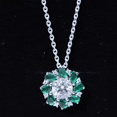Elevate your style with the stunning Diamond Flower Necklace. At its heart, this Statement Pendant showcases an 8 MM round cut synthetic diamond of EF-VS quality, elegantly set in prongs. Surrounding it are beautifully tilted pear-shaped emeralds and smaller diamonds, forming a lovely floral leaf design. If you appreciate bold jewelry, this Diamond Pendant Necklace is an excellent choice for special events, whether its your wedding day or a cocktail party. Radiating elegance and luxury, this Diamond and Emerald Necklace is a timeless piece, making it a perfect gift for your mom, wife, or girlfriend.