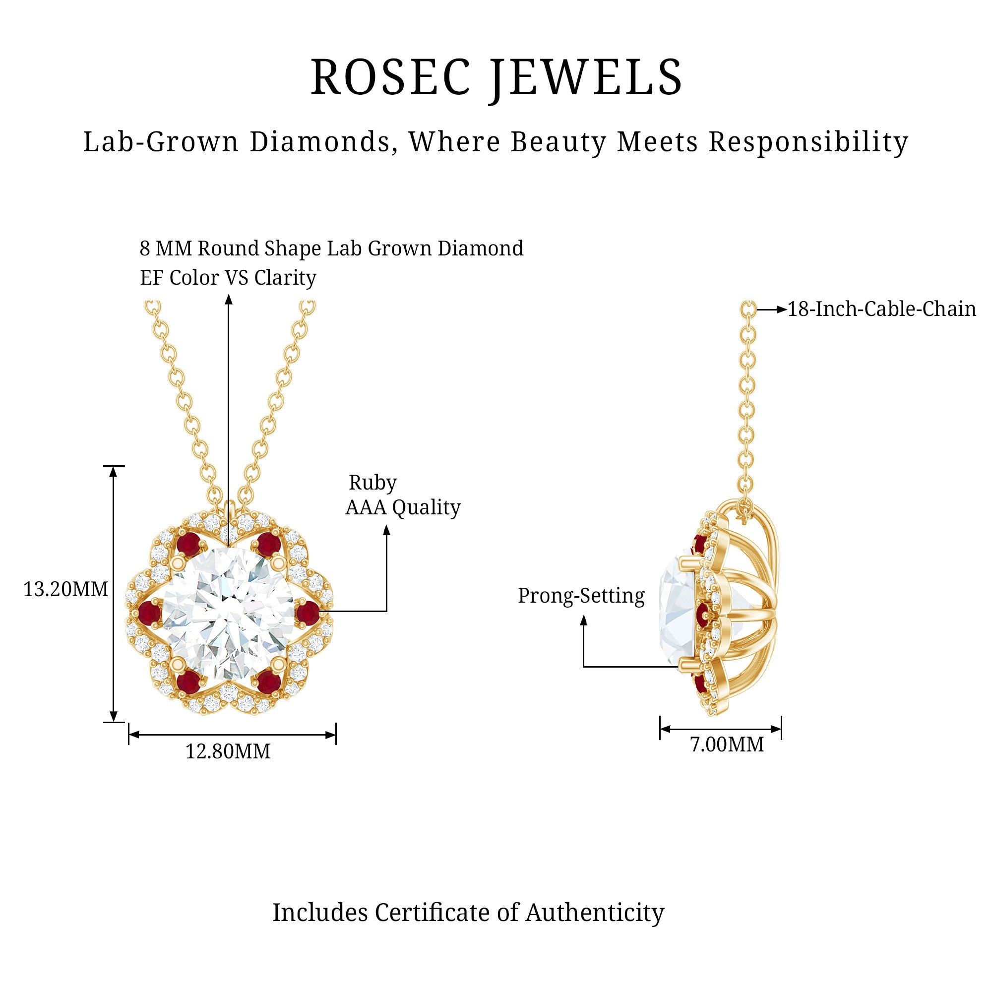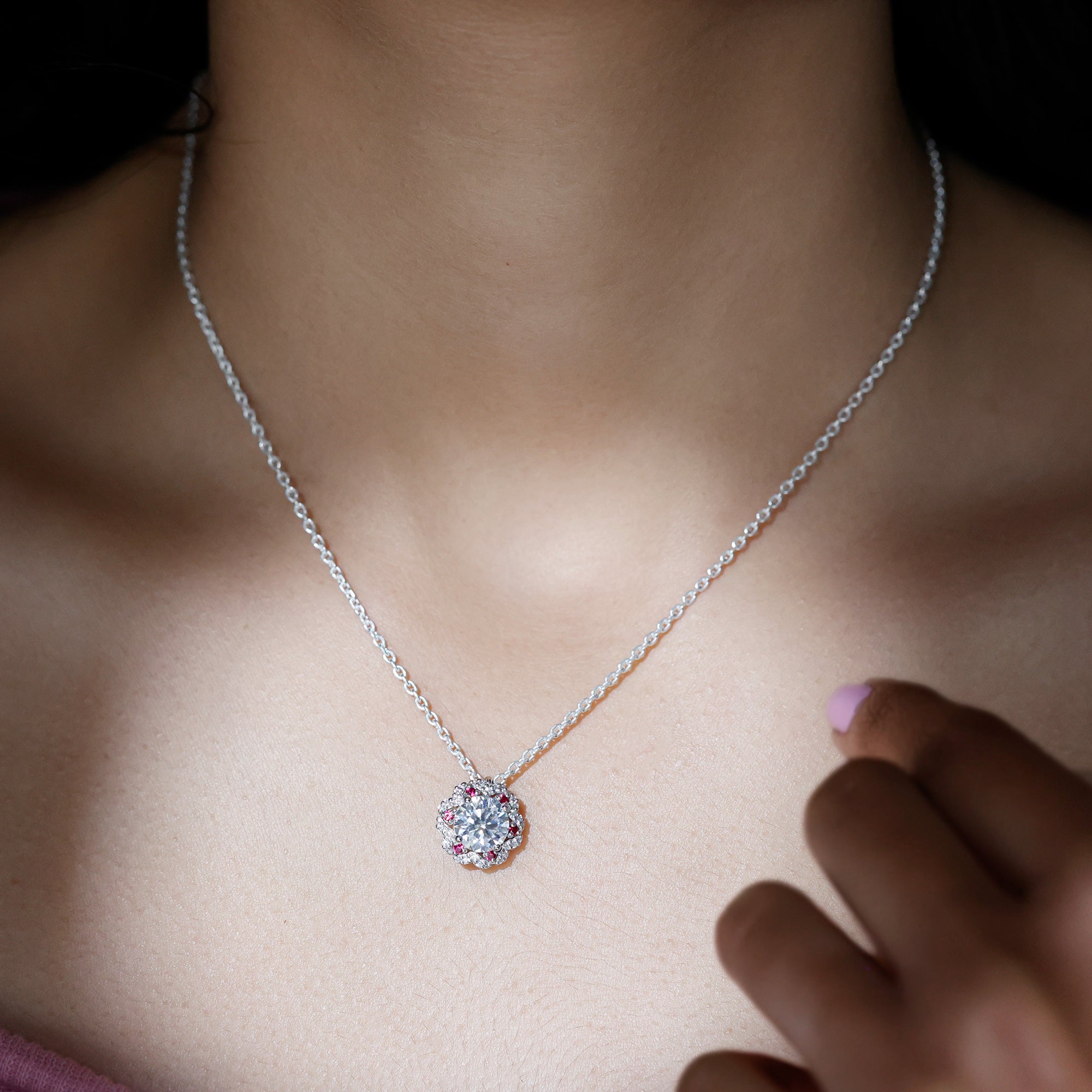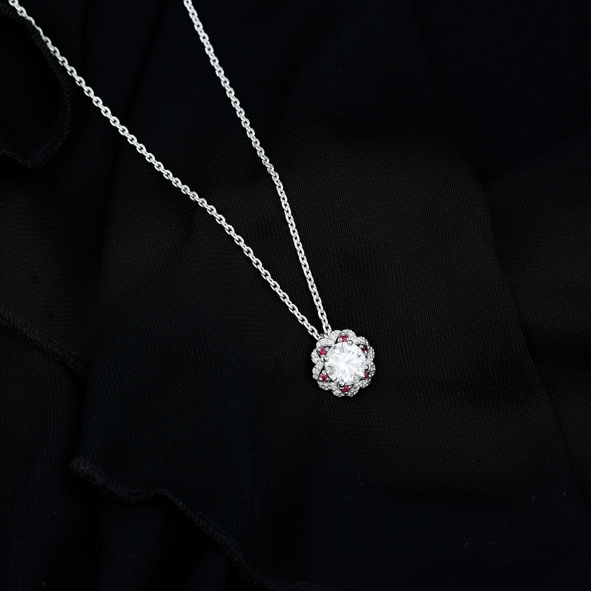Make a statement without saying a word - this Diamond Flower Necklace is designed to turn heads and steal hearts. Handcrafted in high Quality precious metal, this Diamond Pendant Necklace features a meticulously crafted floral design, representing love, new beginnings, and femininity. The flower halo of red rubies and diamonds is carefully set to enhance its brilliance, creating a soft and radiant glow that complements the larger 8 MM round cut diamond (lab made) at the heart of the Bridal Pendant set in prong setting. This Nature Inspired Necklace is as versatile as it is stunning, perfect for casual and formal occasions.