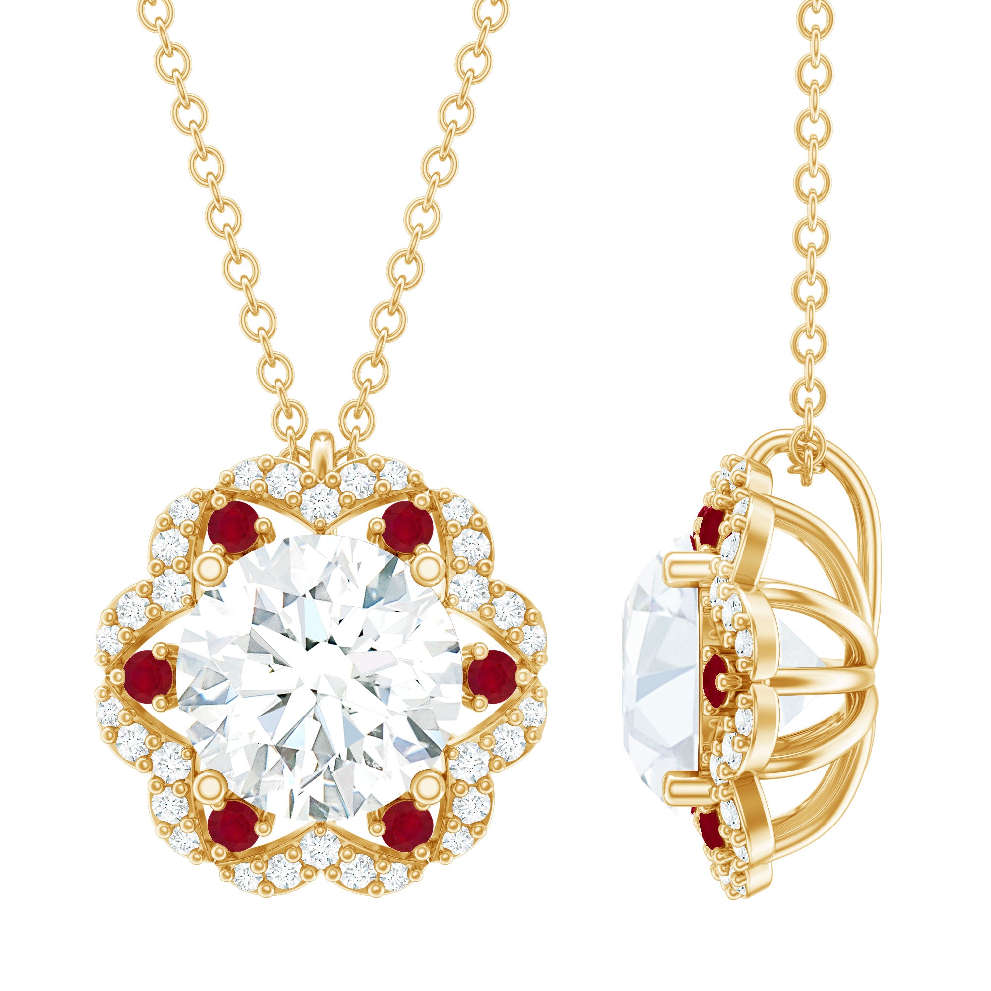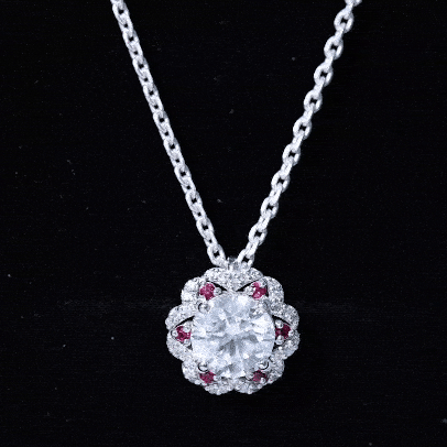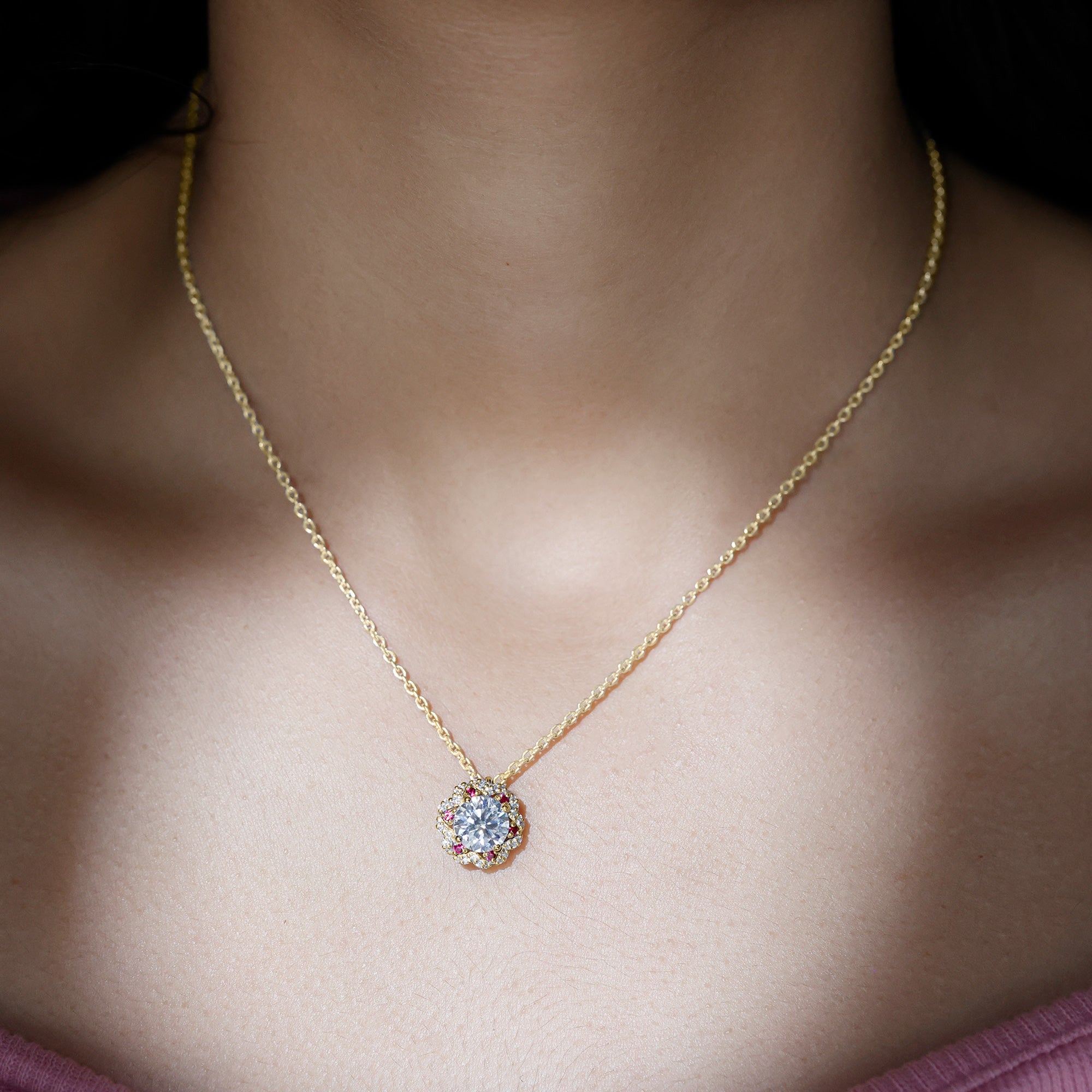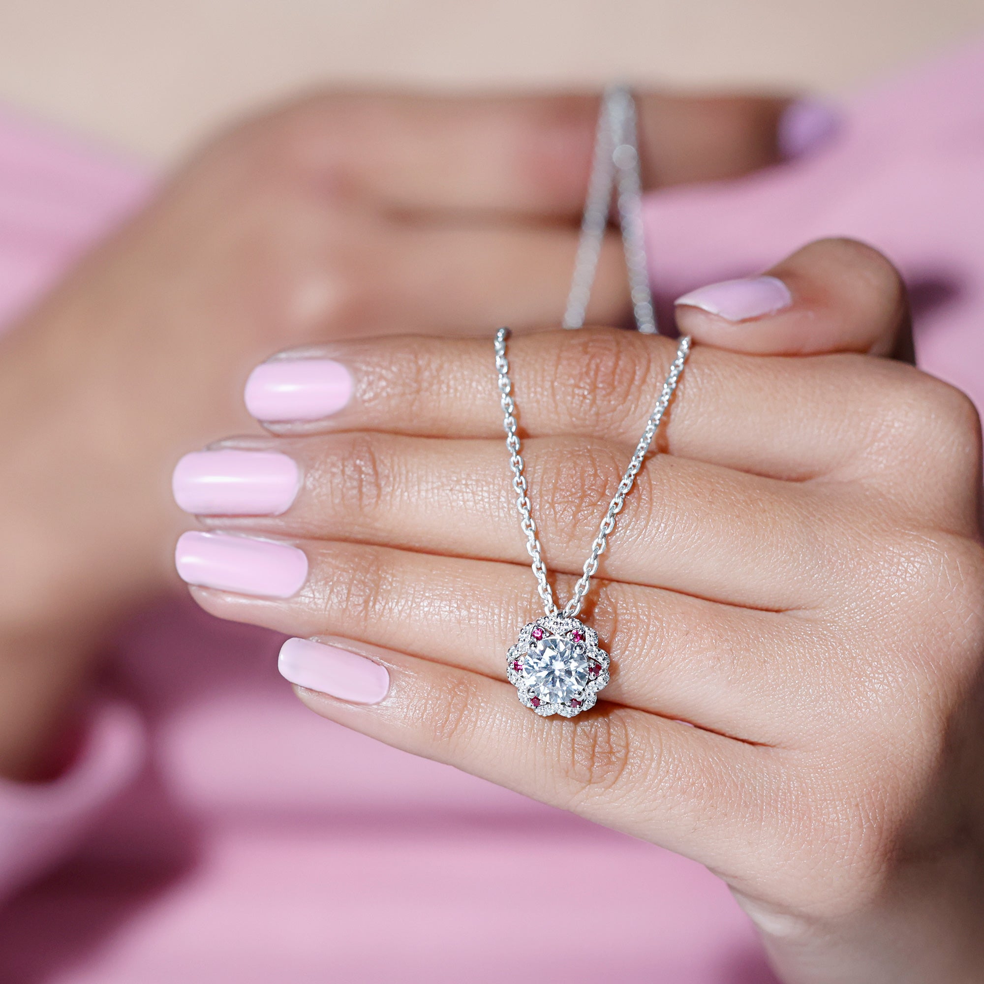 Make a statement without saying a word - this Diamond Flower Necklace is designed to turn heads and steal hearts. Handcrafted in high Quality precious metal, this Diamond Pendant Necklace features a meticulously crafted floral design, representing love, new beginnings, and femininity. The flower halo of red rubies and diamonds is carefully set to enhance its brilliance, creating a soft and radiant glow that complements the larger 8 MM round cut diamond (lab made) at the heart of the Bridal Pendant set in prong setting. This Nature Inspired Necklace is as versatile as it is stunning, perfect for casual and formal occasions.