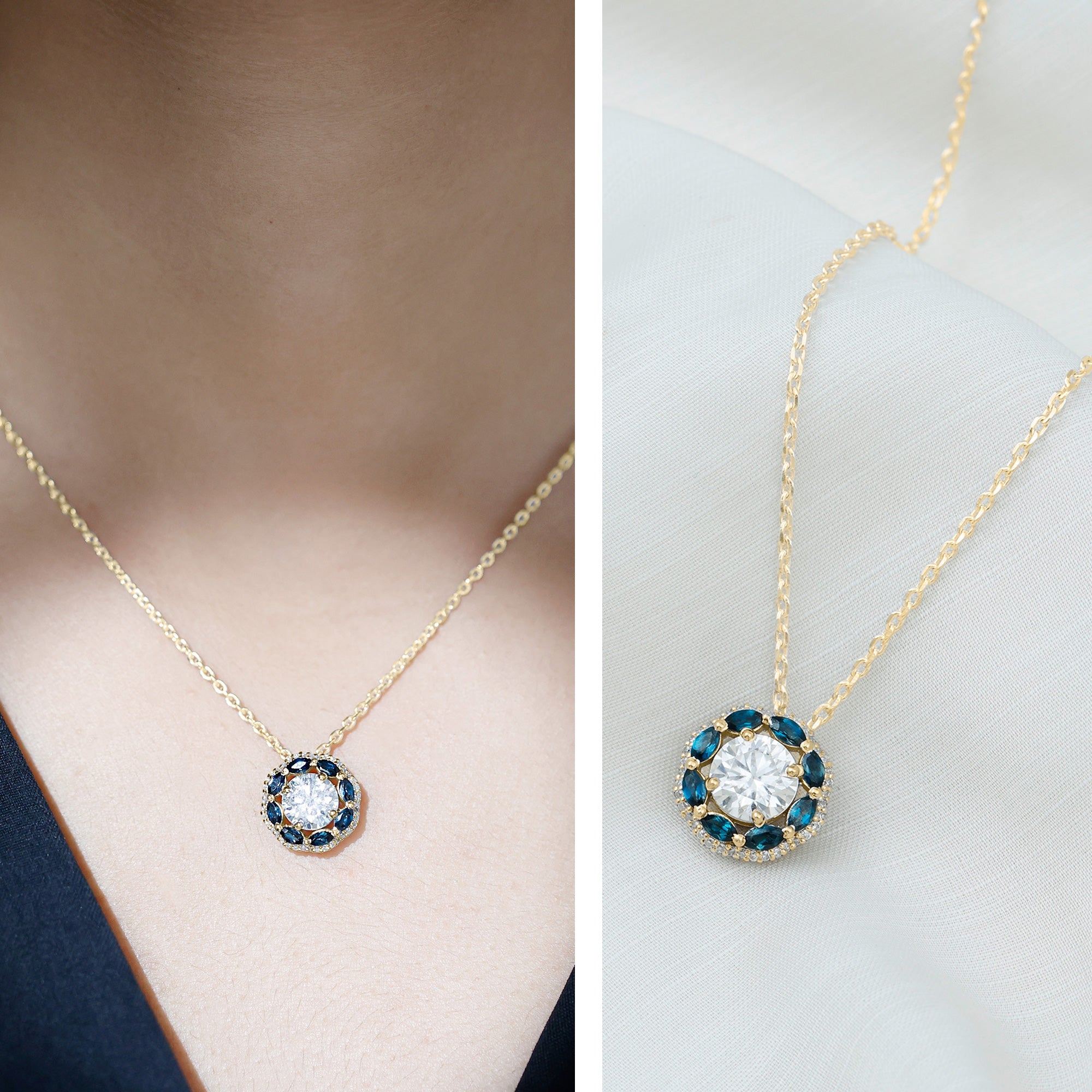 This timelessly gorgeous Halo Necklace features a glittering 8 MM round-shaped diamond center set in prong setting and surrounded by marquise shaped london blue topaz stones and sparkling round cut small diamonds. Not only does this Flower Pendant exude luxury, but it also reflects a conscious choice, handcrafted with lab made diamonds, this is eco-friendly and affordable. Additionally, this Diamond and Topaz Necklace is available in a variety of metal color options so you can choose whatever suits your unique style and make it a truly personalized piece. If you are looking for something unique, timeless, and full of brilliance, this is the perfect pendant to celebrate your love.