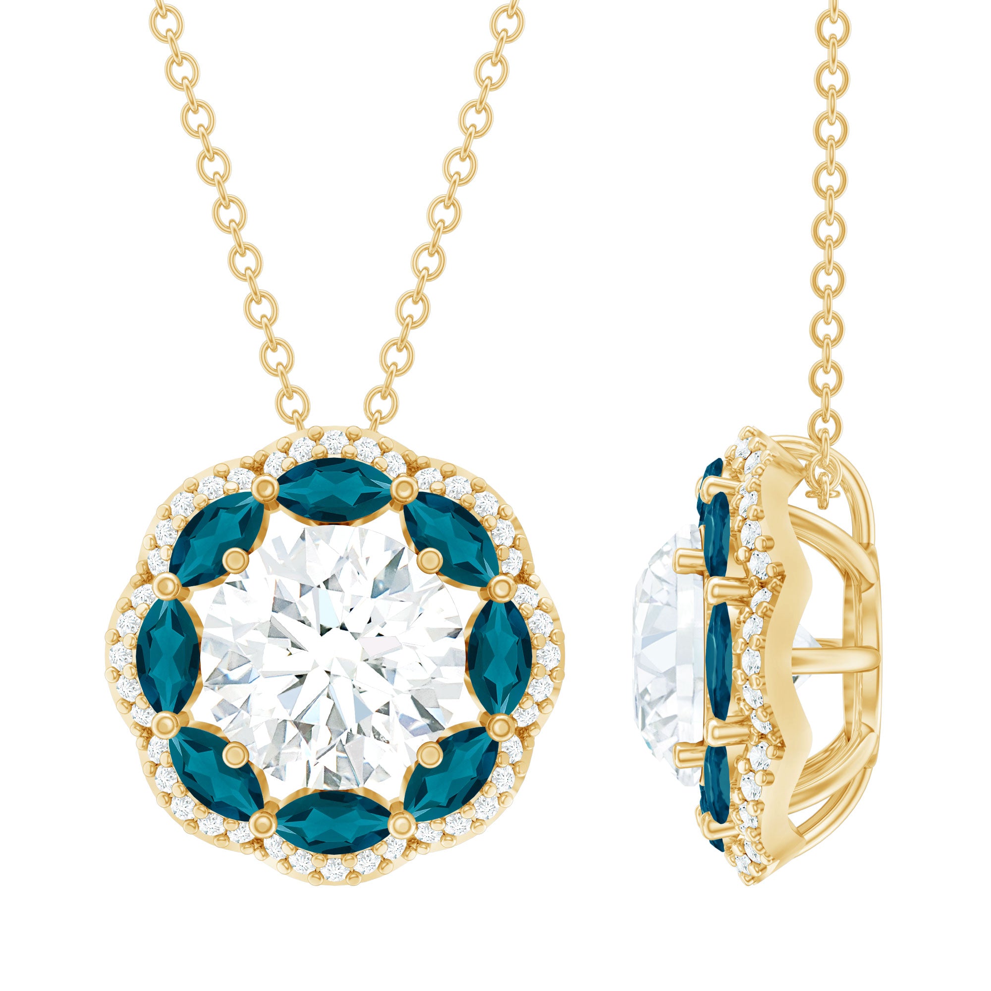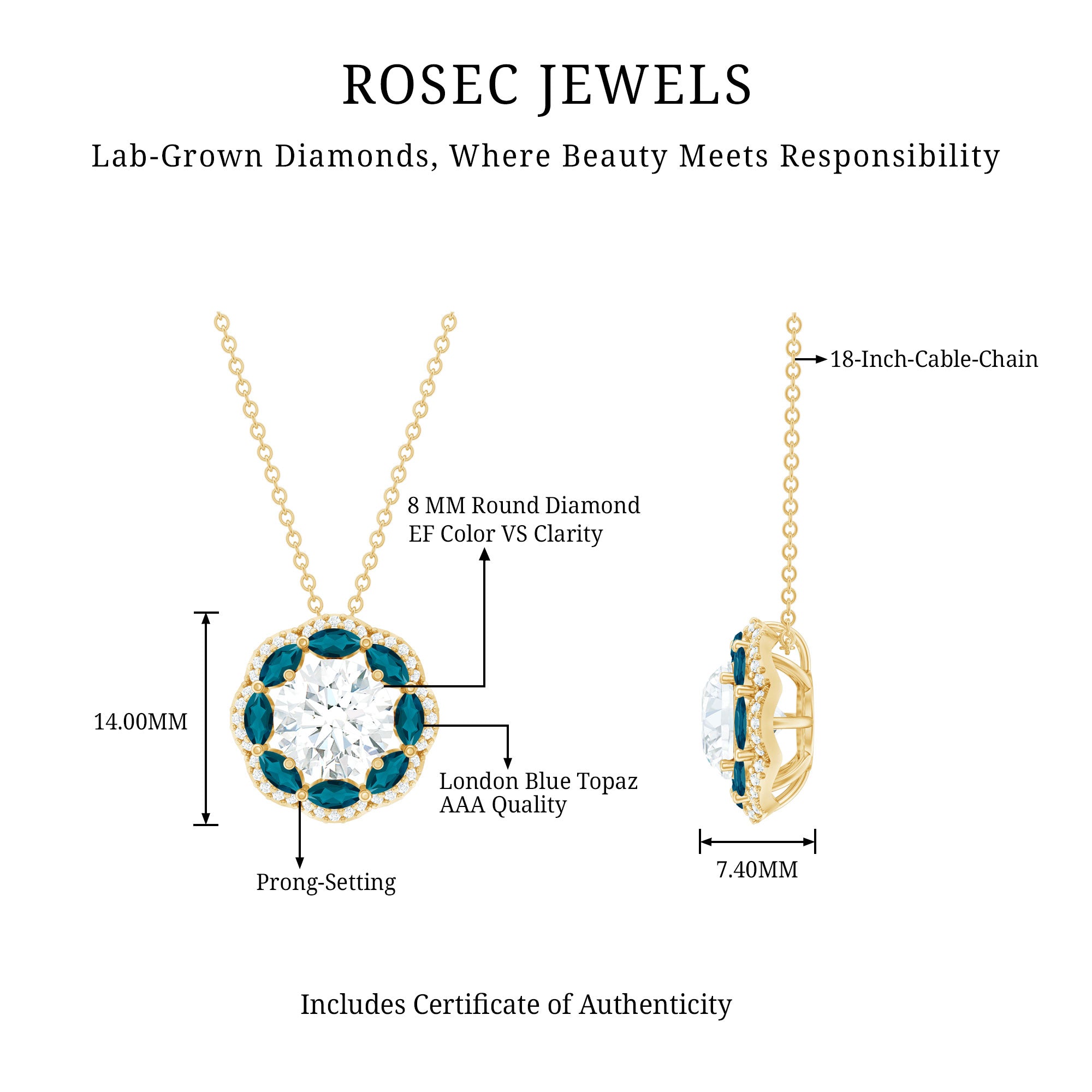 2 Carat Lab Grown Diamond Halo Necklace With London Blue Topaz