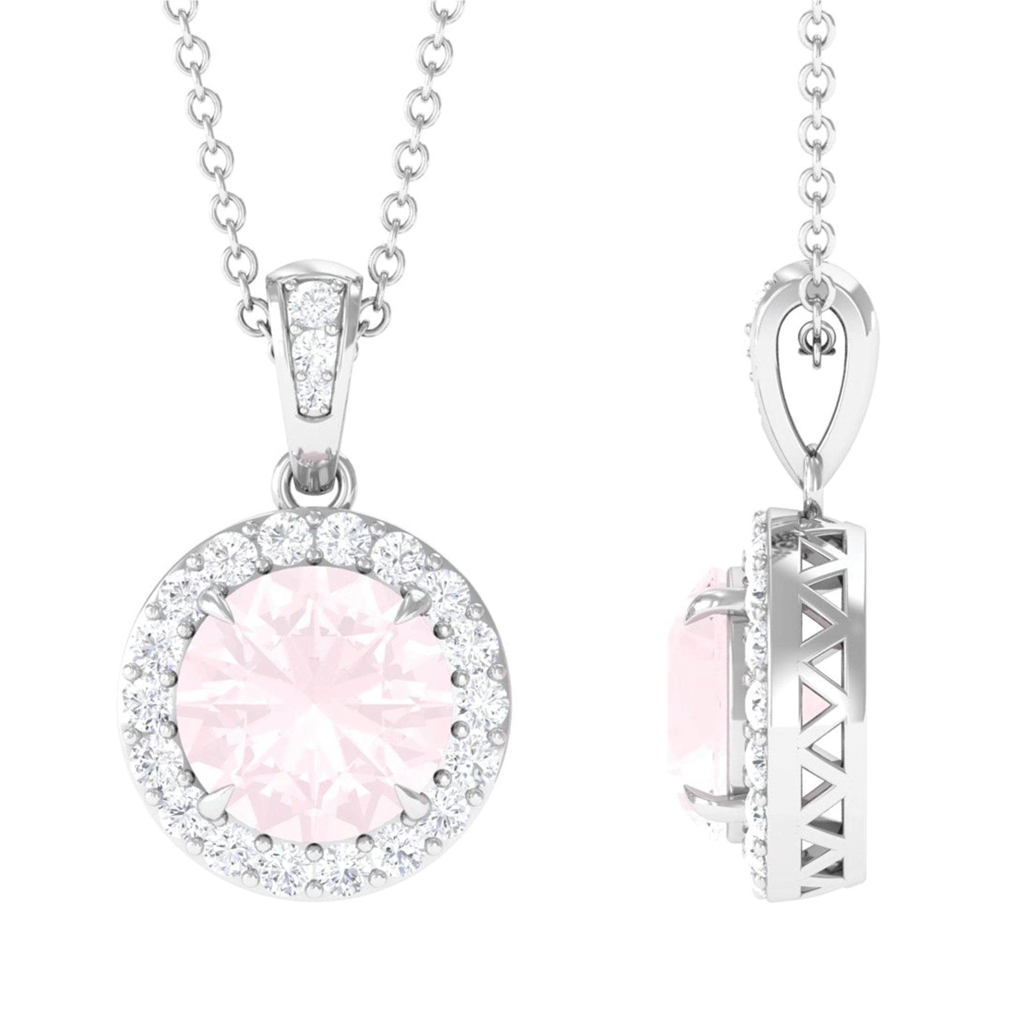 Feel more centered, grounded, and at peace with this simple Rose Quartz Pendant. The Halo Pendant features an 8 MM round shaped rose quartz center stone in a claw setting surrounded by a classic and sparkling Diamond Halo. The diamond-encrusted bail adds a touch of sophistication, allowing the Round Pendant to be worn for any occasion. Whether youre dressing up for a special event or adding a hint of elegance to your everyday attire, this Classic Pendant is the perfect accessory to celebrate your love. Dont miss the chance and add our beautiful jewelry pieces to your collection today.