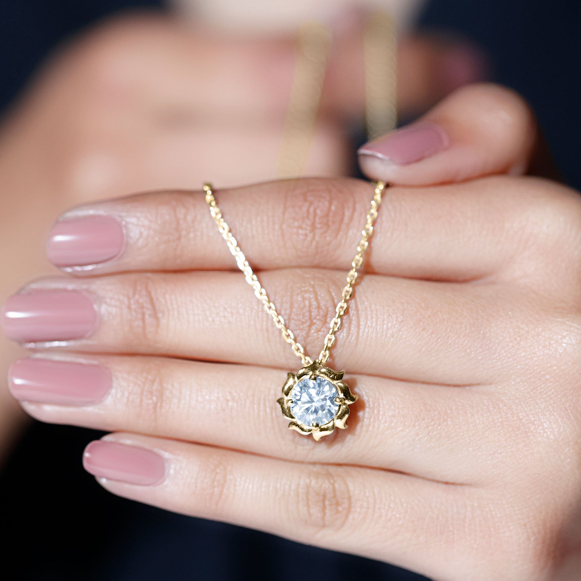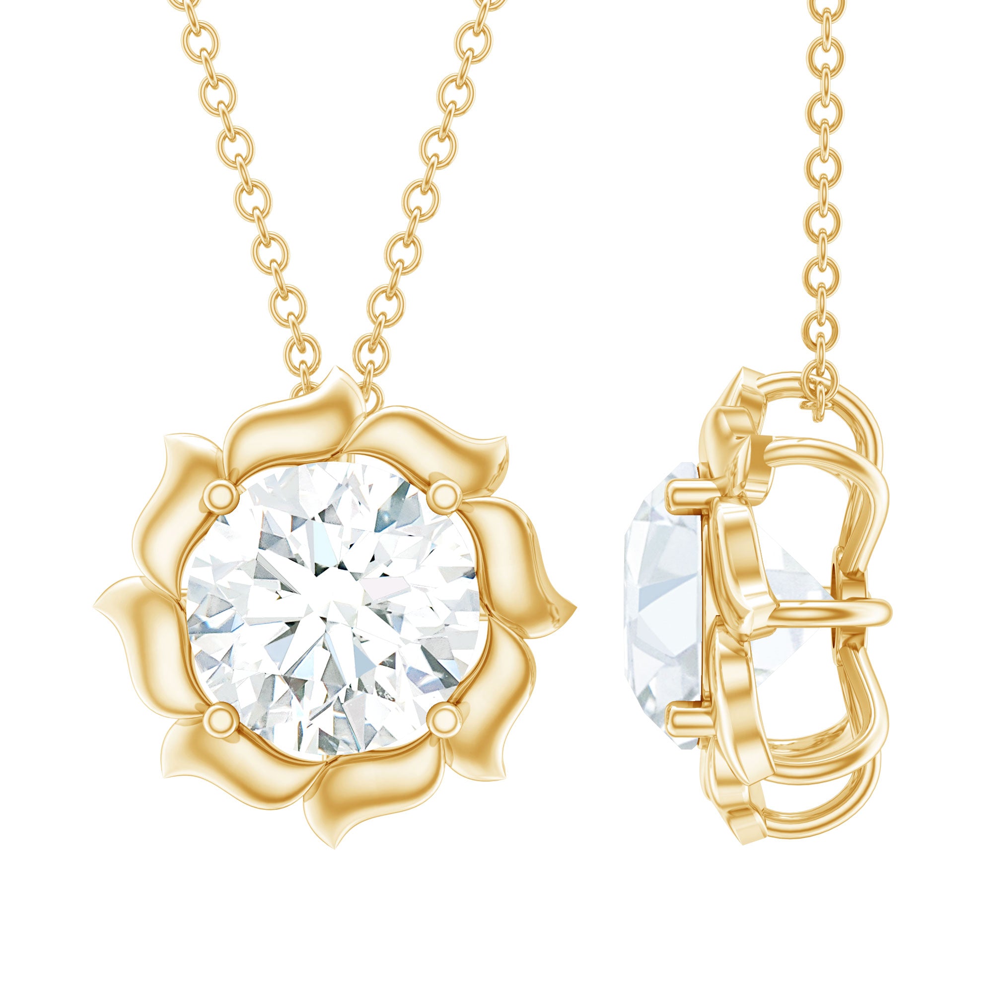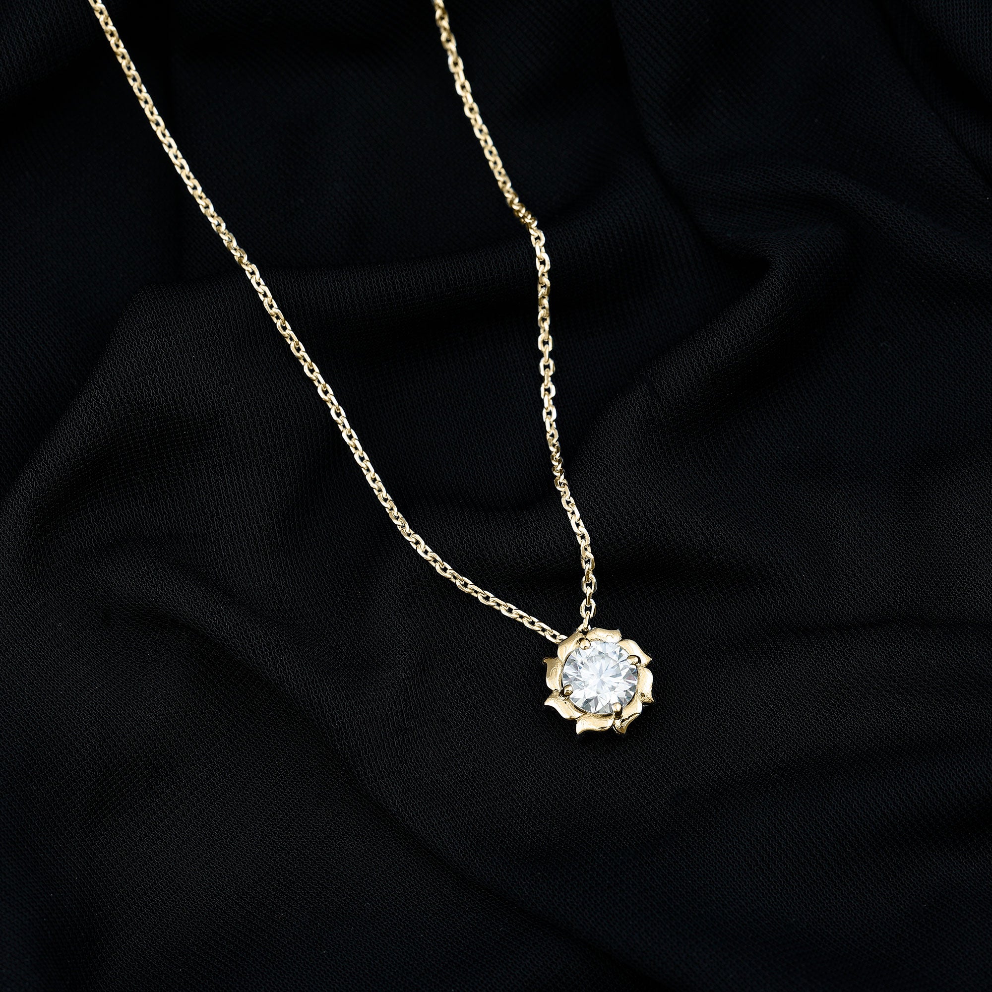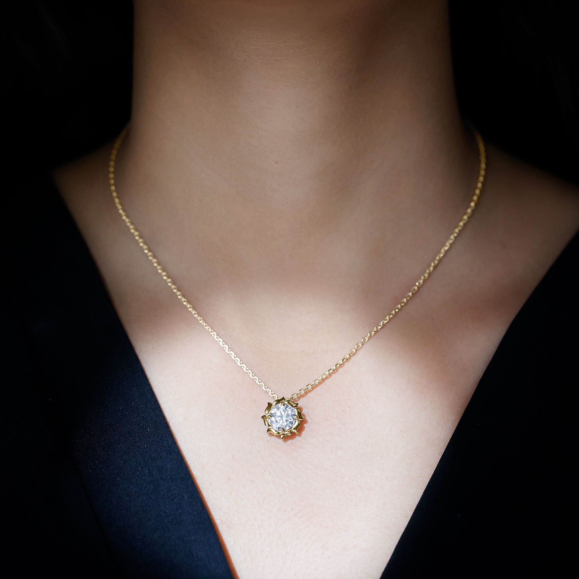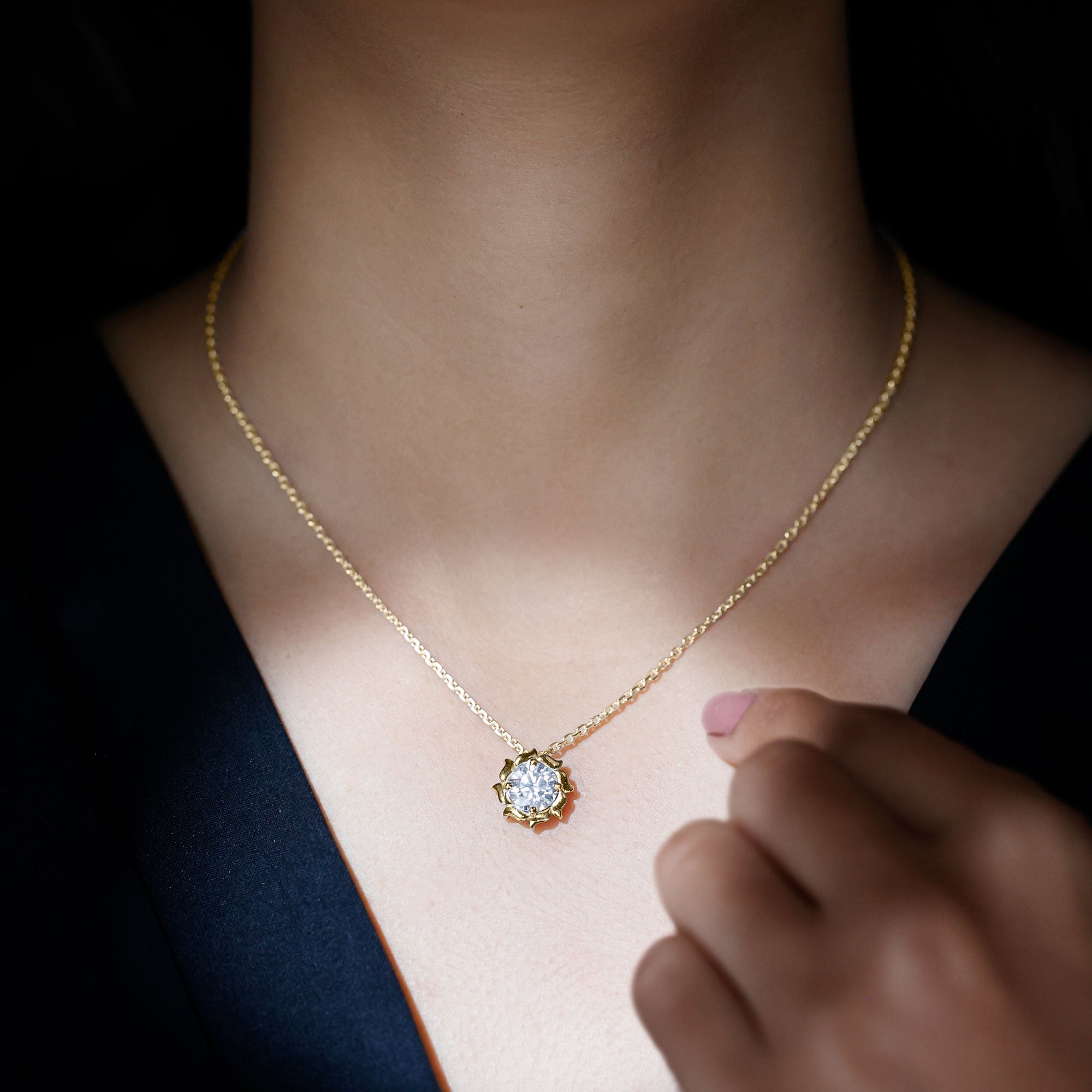 Natures brilliance captured in a single bloom - this exquisite Flower Pendant Necklace is a timeless expression of grace and beauty. Inspired by the elegance of a sunflower, the design features a 2 Carat Diamond of round shape set in prong setting and surrounded by sculpted petals. Whether you are heading to the office, dressing up for a special occasion, or simply elevating your everyday style, this Diamond Solitaire Necklace will give you the perfect look. A symbol of eternal beauty, this Round Diamond Pendant comes with a certificate of authenticity, ensuring its sparkle lasts as long as your love for her.