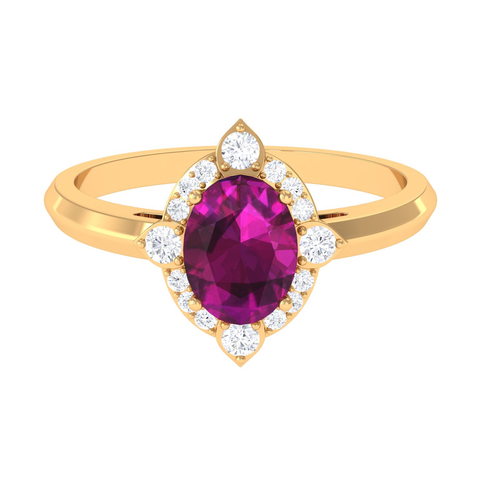 Profess your love with this Art Deco Engagement Ring is adorned with Oval Shape Rhodolite set as a solitaire in a prong setting with Round Shape Diamond Accent. This Gold Art Deco Ring is mounted in Solid Gold.