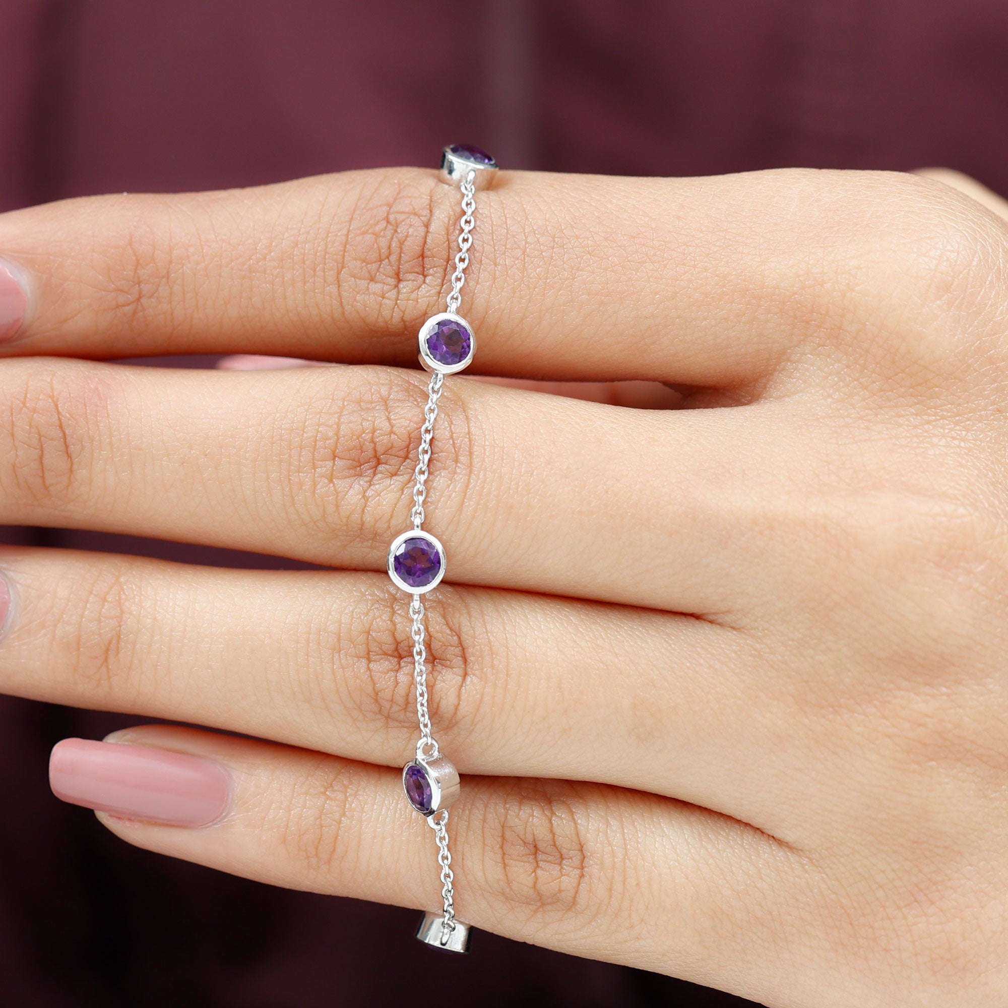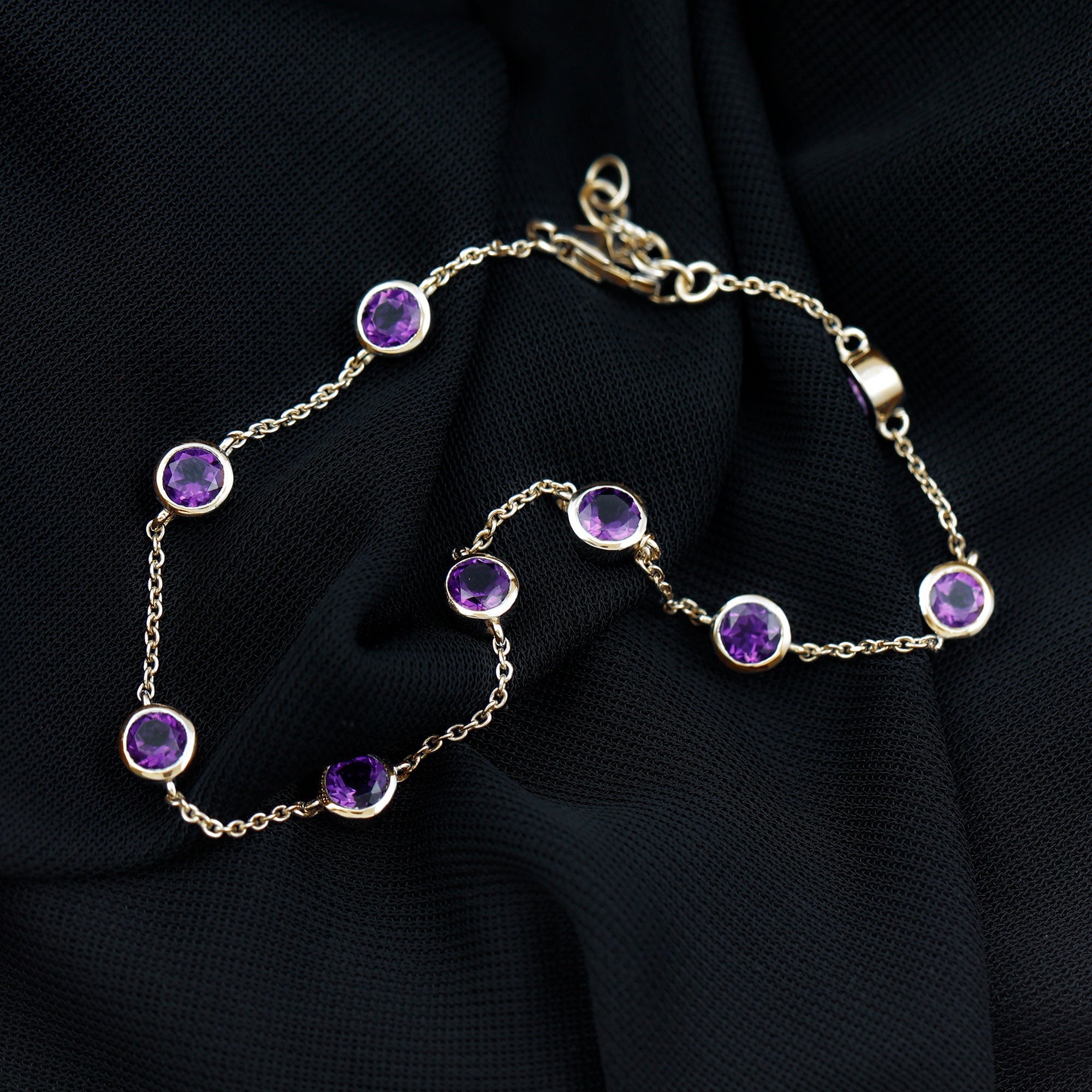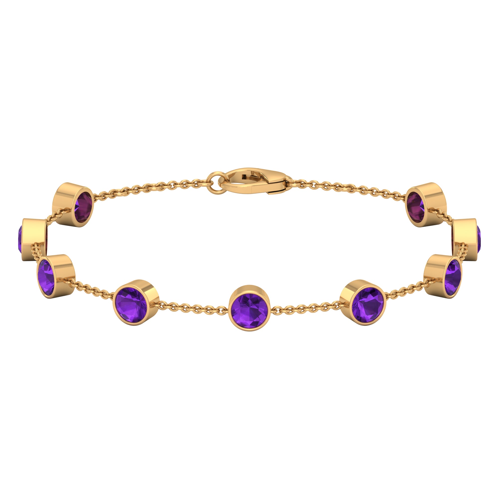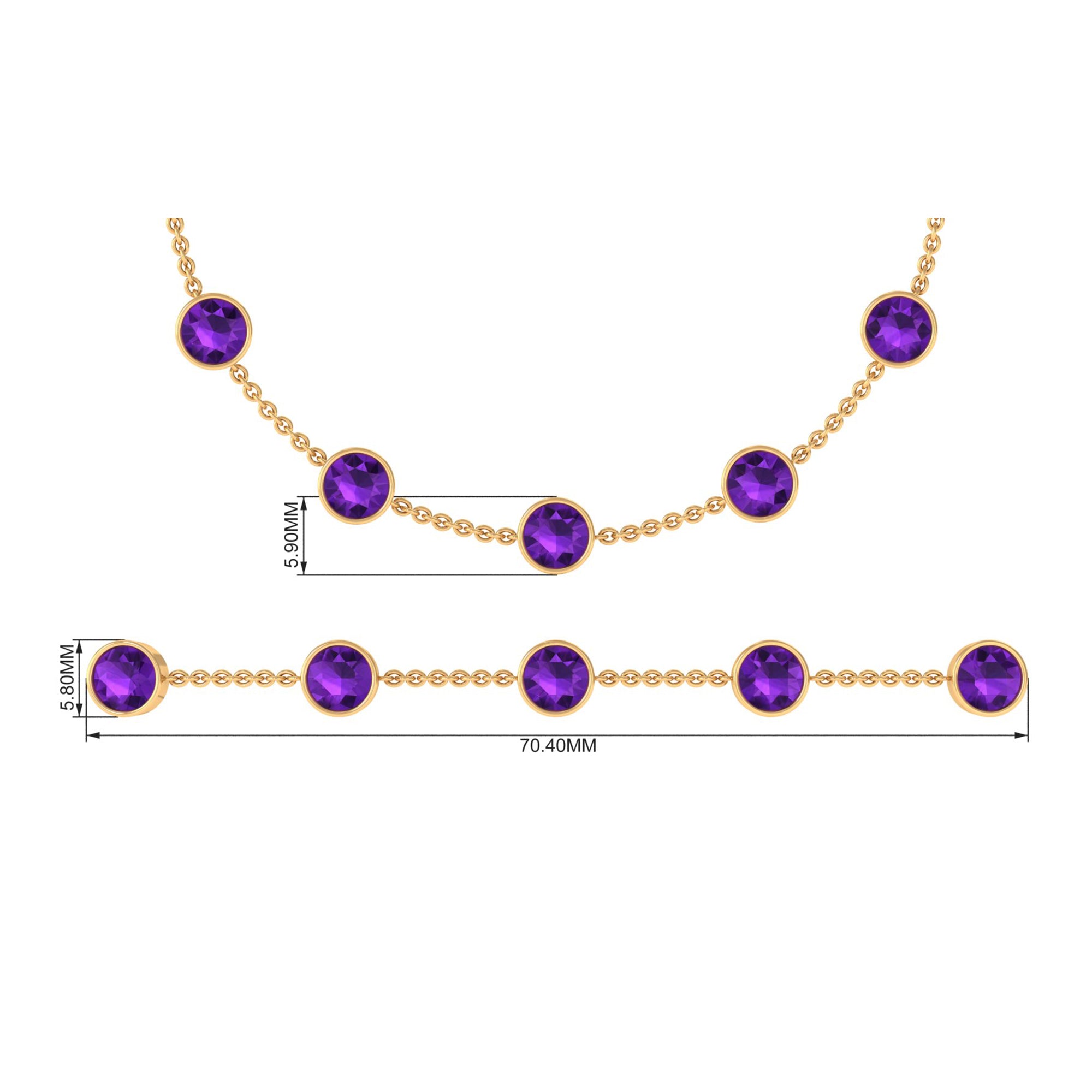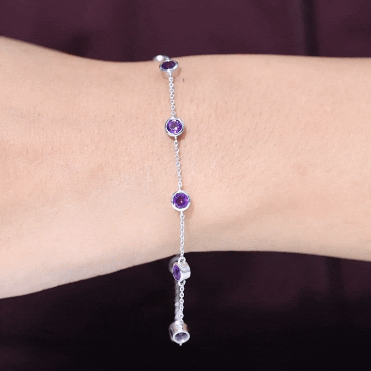 Express that you care for your mom and your her from your heart by daying her this glossy Amethyst Bolo Bracelet. This Gold Chain Bracelet will magnify the beauty of your wrist and make your wrist glossy. This Eternity Bracelet is perfectly composed of Solid Gold and decorated with Round Cut Amethyst in a Bezel Setting over Station Chain.