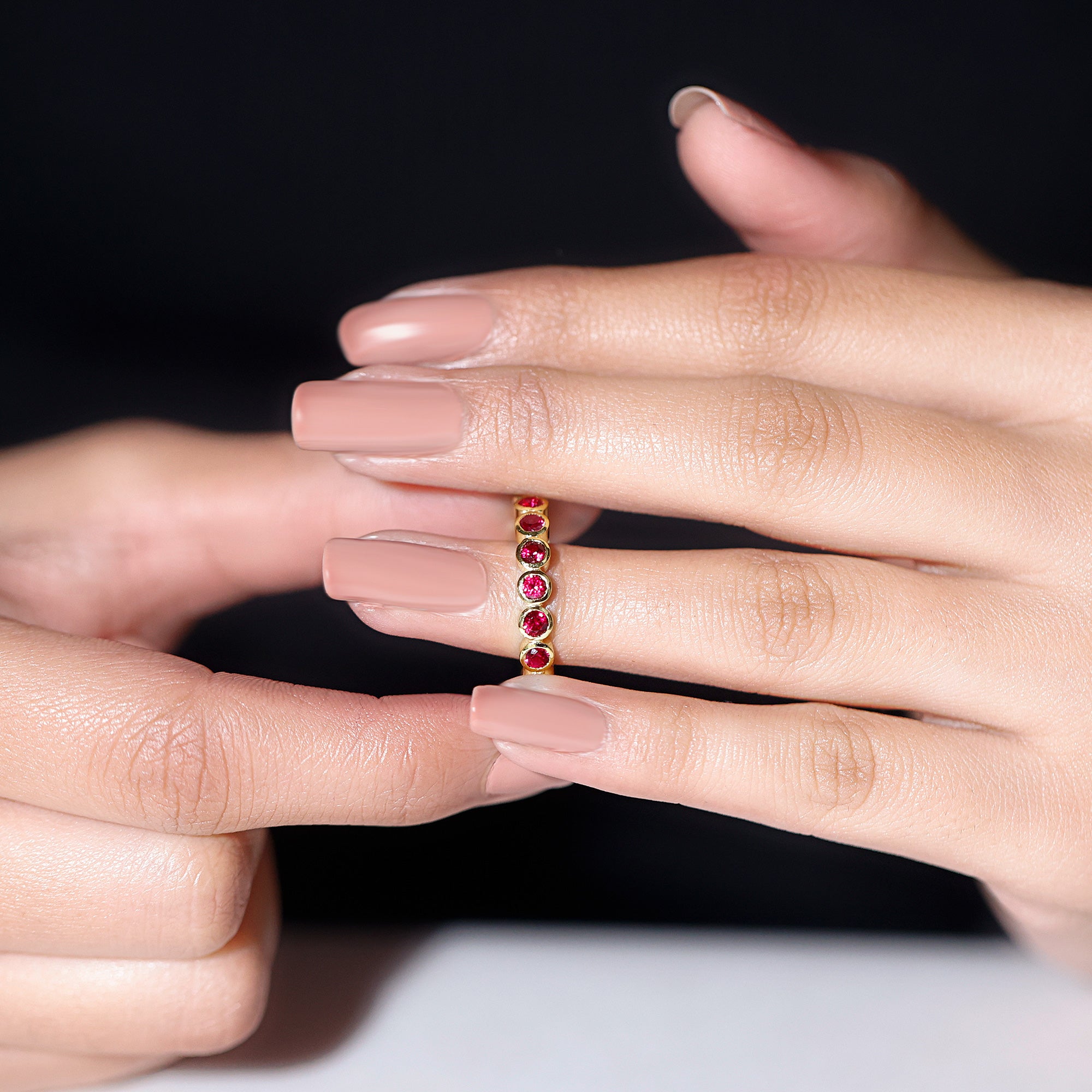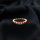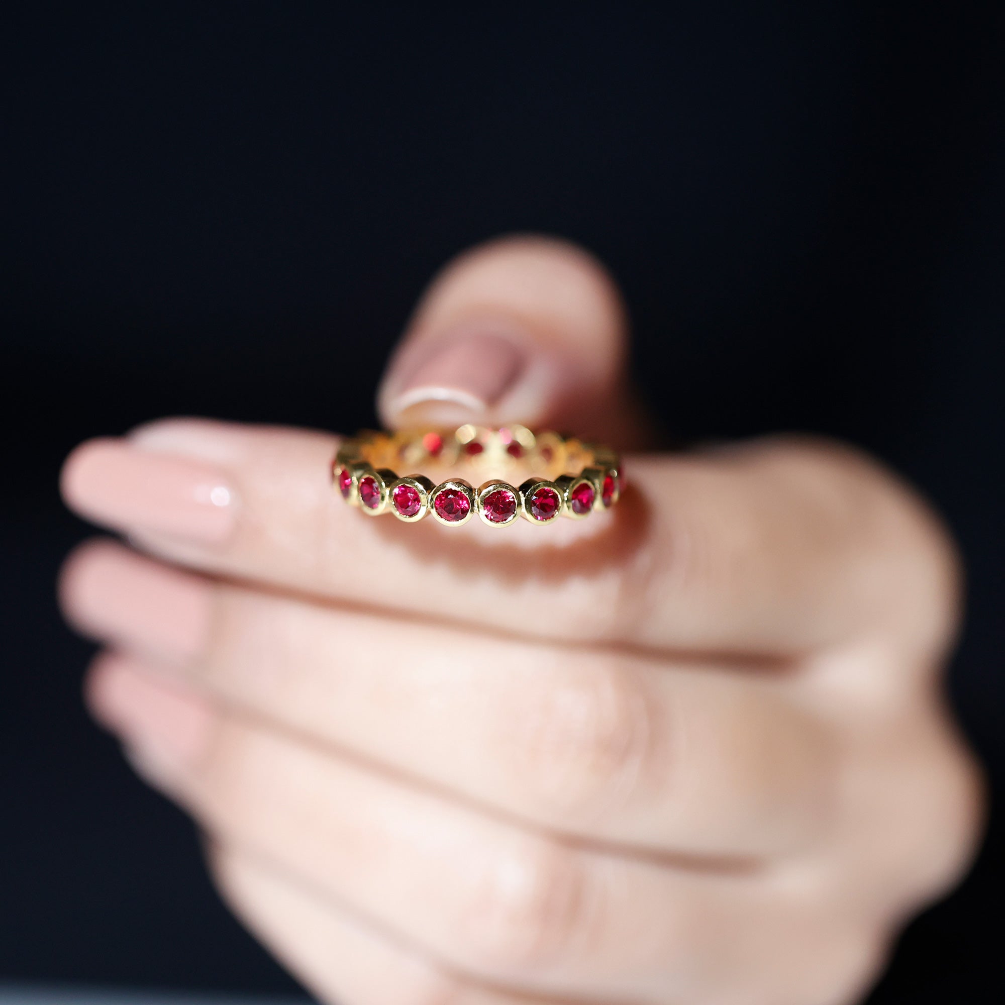 Declare your love with this stunning Full Eternity Ring. Featuring Round Cut Lab Created Ruby in a secure Bezel Setting, this Ring is crafted from Solid Gold for a radiant, enchanting look.