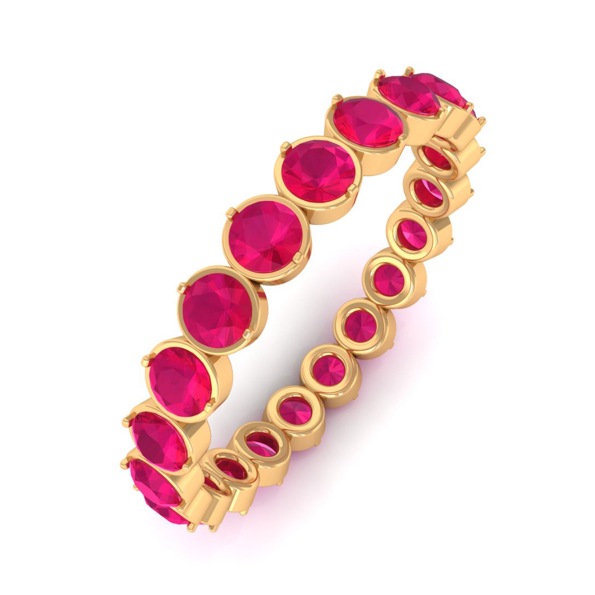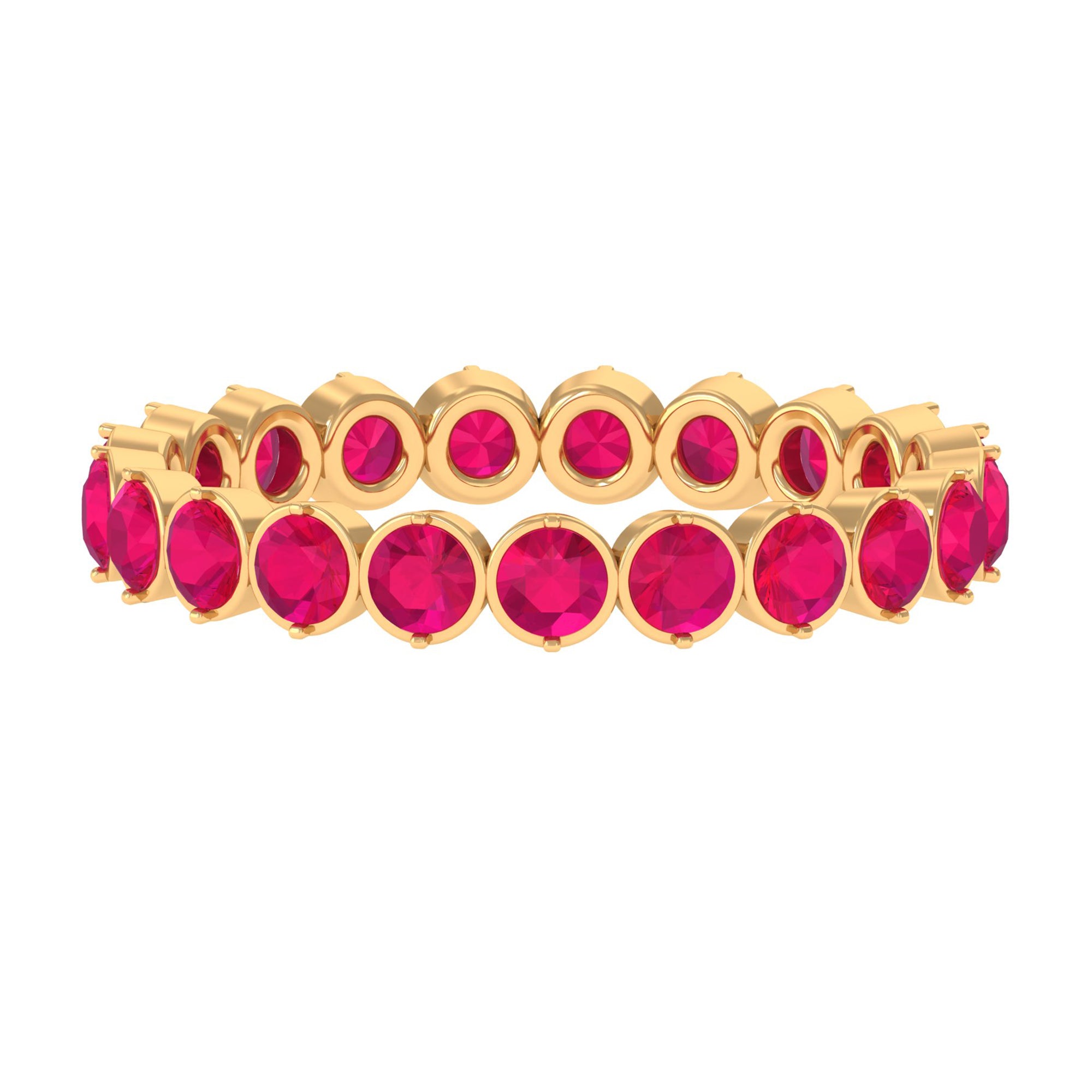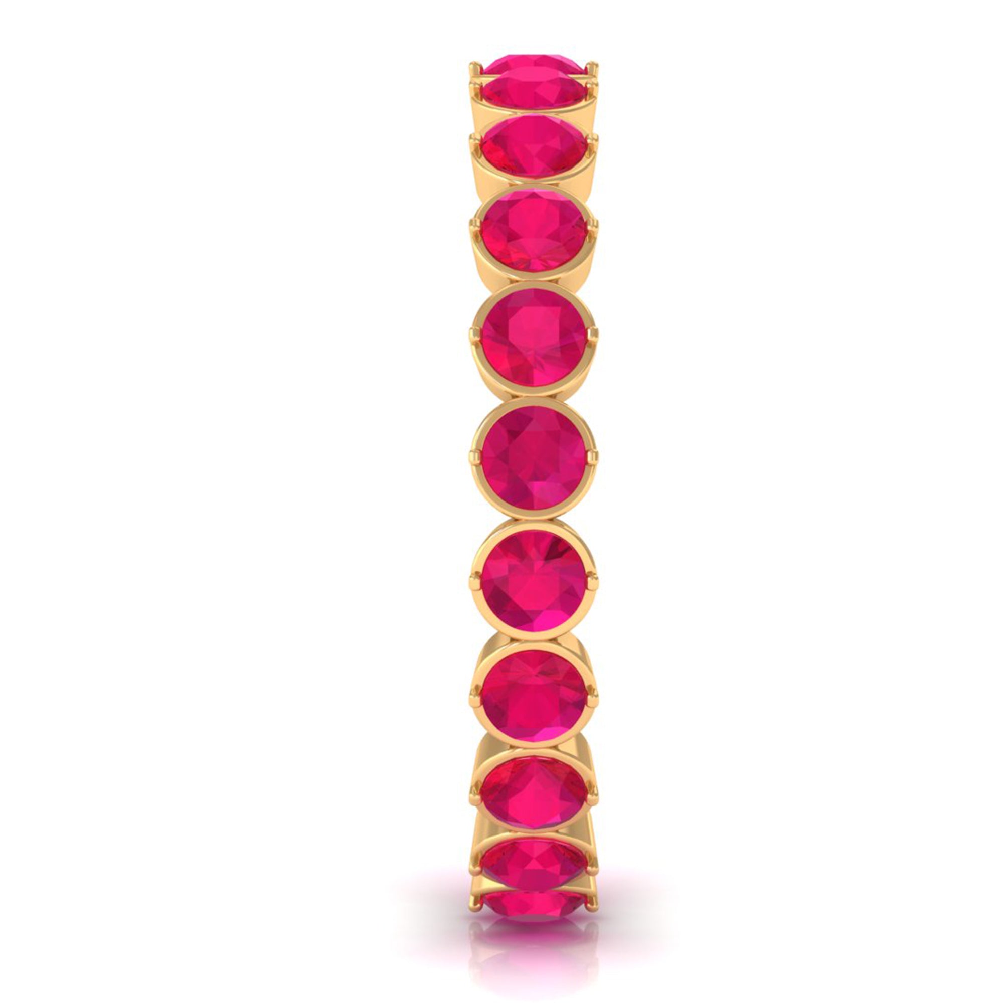 This Ruby Ring is unique and a beautiful jewelry for your loved ones. It features with Round Cut Ruby in full eternity pattern in Bezel Setting on Eternity Ring. This Full Eternity Ring is crafted in Solid Gold. Either go alone or stack it with other rings, in both the ways it will look flawless.