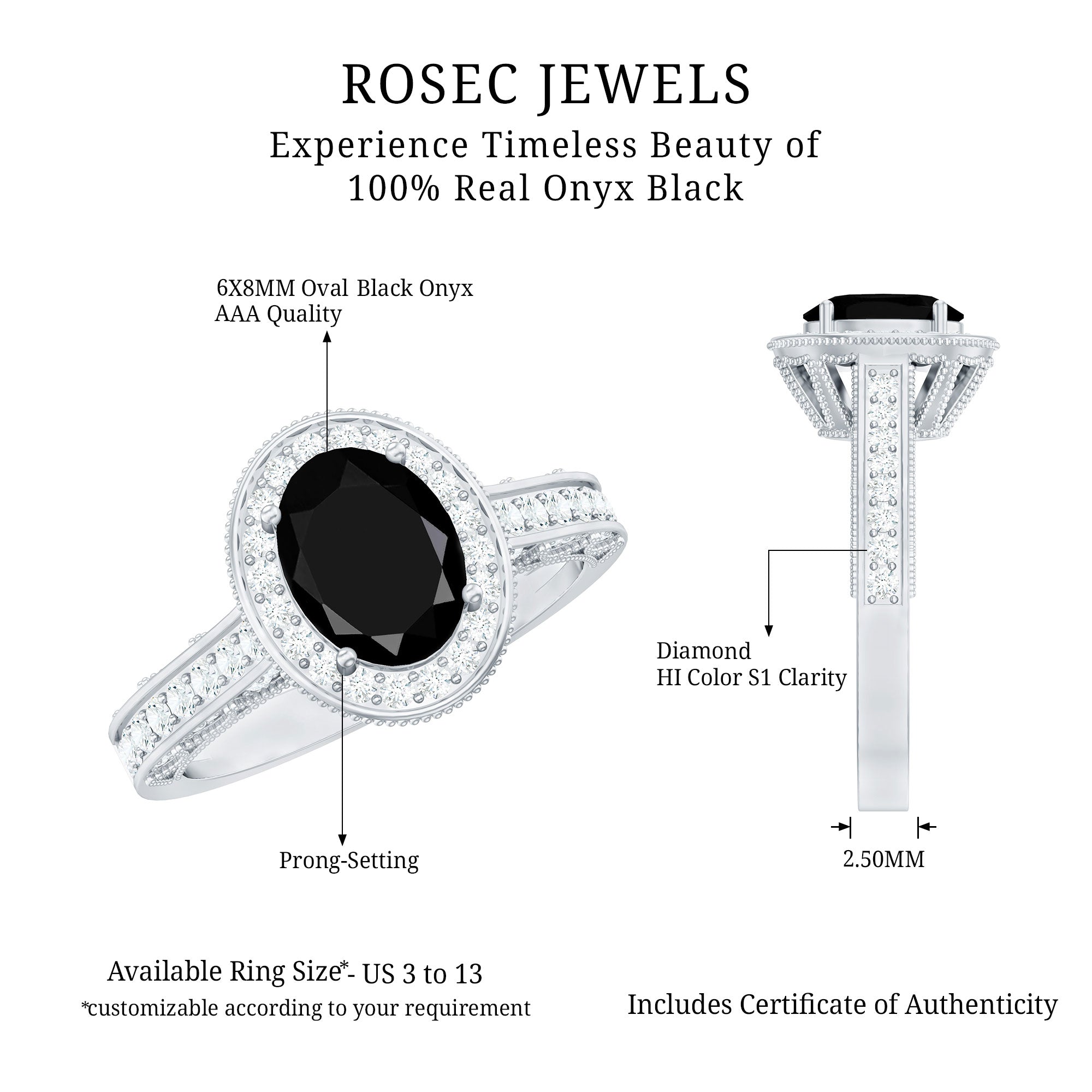 If you love vintage beauty with a modern touch, this Antique Black Onyx Ring was made for you. This Black Onyx Engagement Ring is inspired by old-world charm and timeless elegance. At the center sits a 6X8 MM oval cut black onyx, held securely in prong setting. Its deep tone makes a bold statement, while the sparkling round cut diamond halo around it adds a soft and glowing contrast. The band features delicate side diamonds, detailed beaded edges, and fine craftsmanship that reflects a true vintage feel. Every detail in this Oval Engagement Ring is designed to bring the beauty of the past into a meaningful piece for your future. This Vintage Halo Engagement Ring is perfect for brides who want something a little different, something romantic, elegant, and full of story. The Art Deco style brings in just the right mix of drama and grace, making it a piece you will treasure for years to come. Made with AAA quality black onyx and HI-SI quality diamonds, this Antique Looking Engagement Ring also comes in various choices of metal color, ring size, and purity, so you can personalize it just the way you like. Whether it is for an engagement or a special gift, this Black Onyx and Diamond Ring stands out with timeless sparkle and meaningful design, a perfect way to say YES with style.