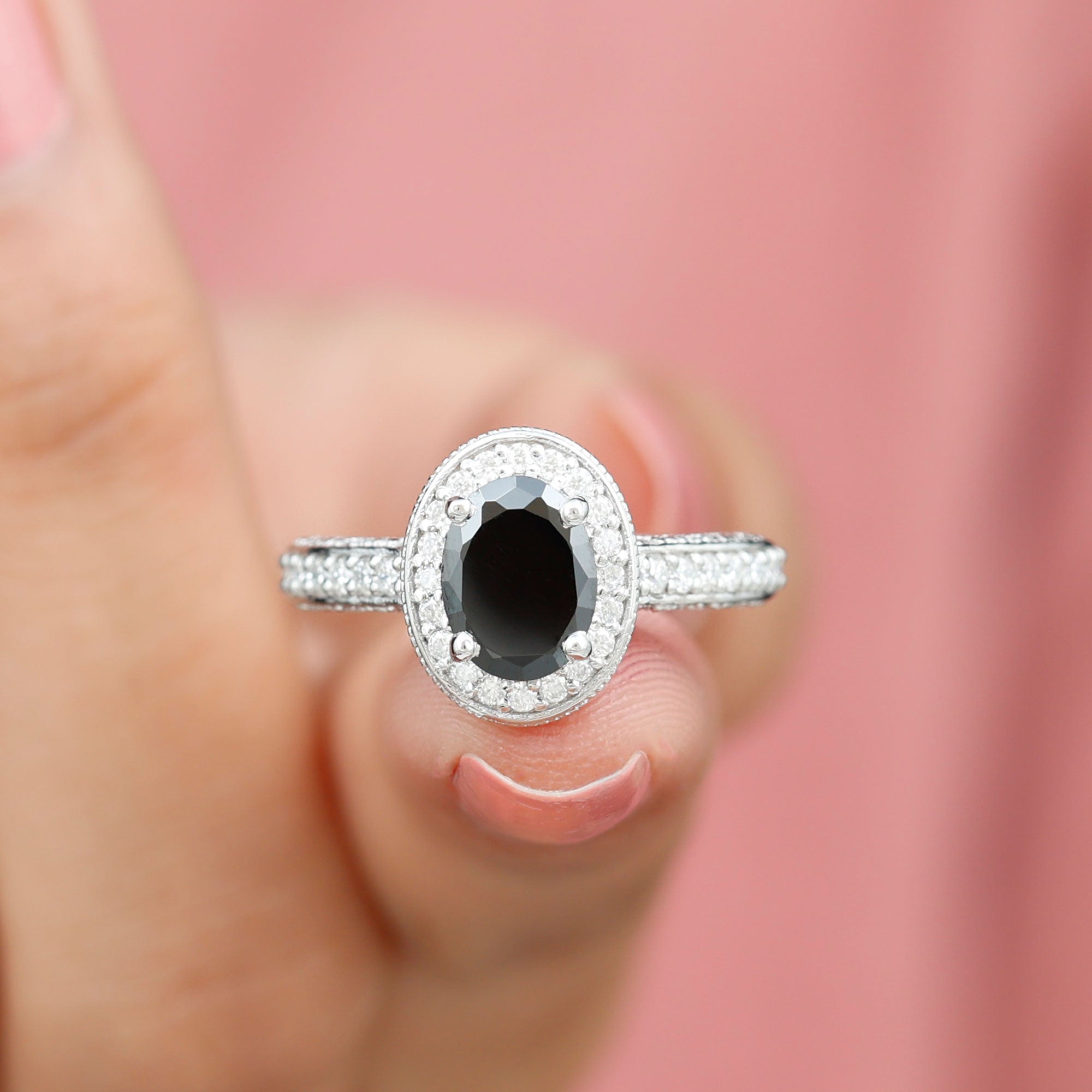 Vintage Inspired Black Onyx Oval Engagement Ring with Diamond Halo