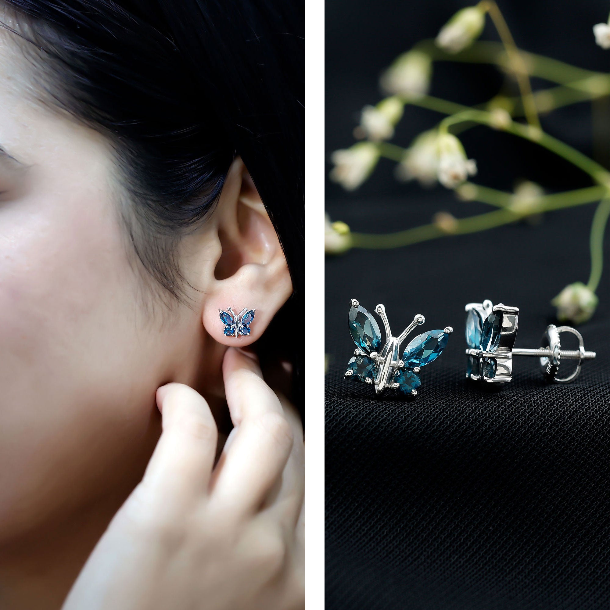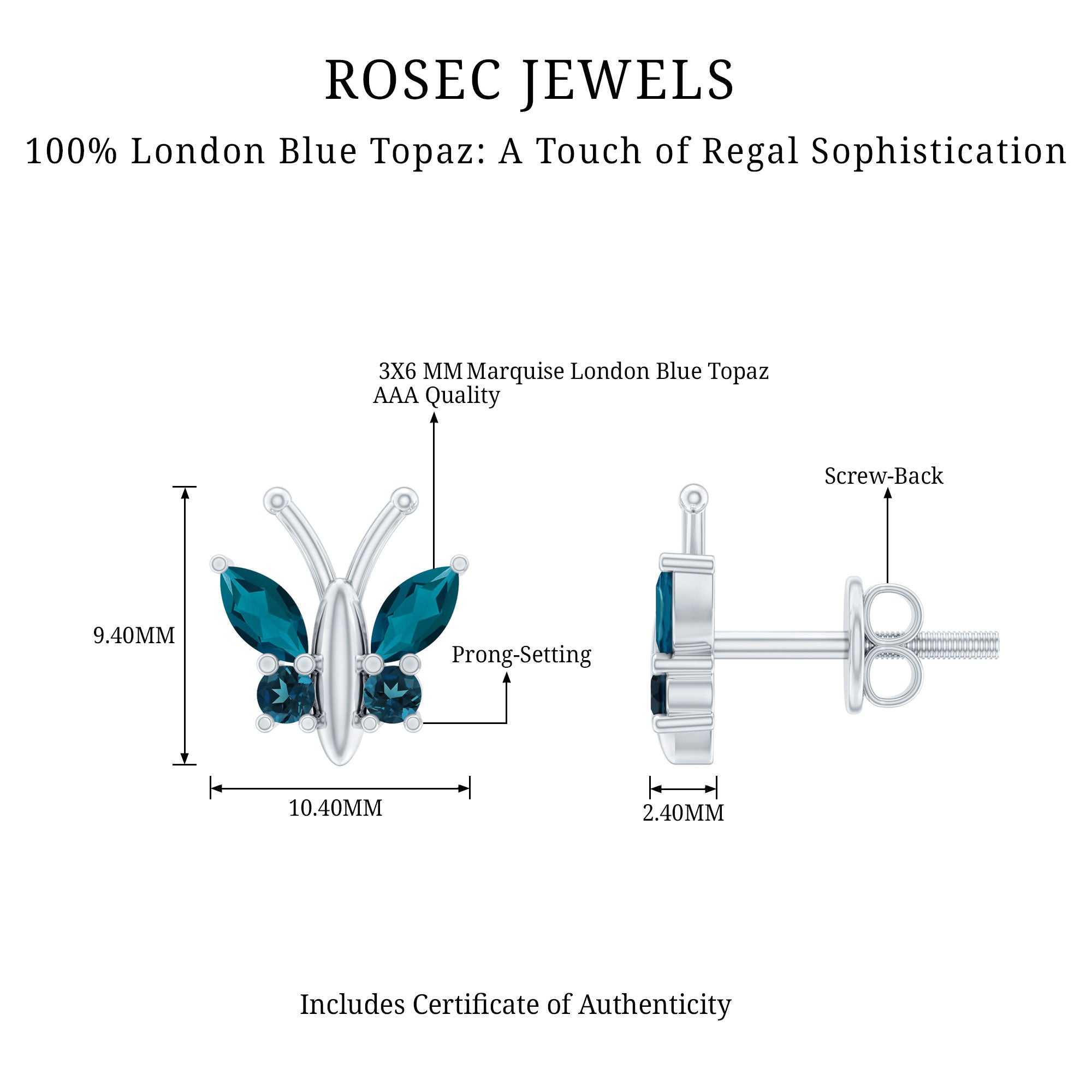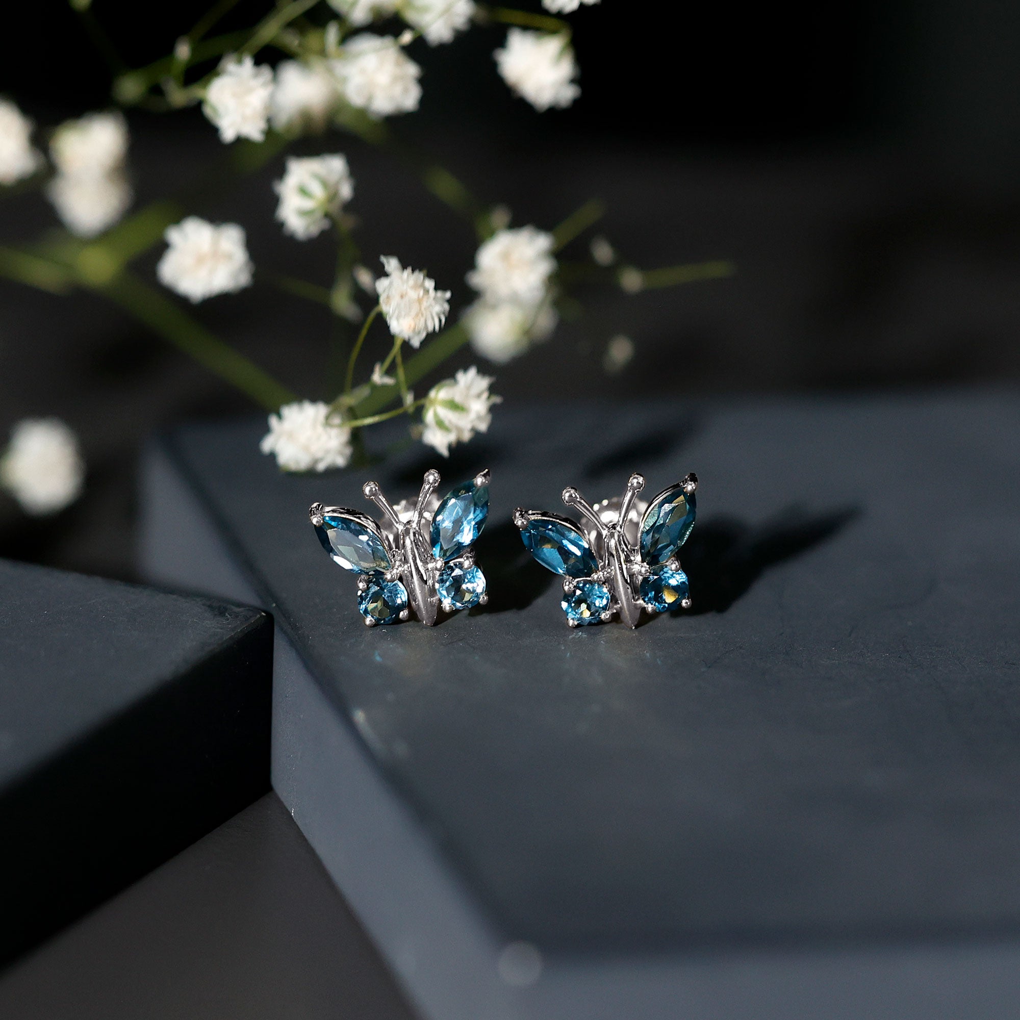 2 CT Butterfly Stud Earrings with Round and Marquise Cut London Blue Topaz