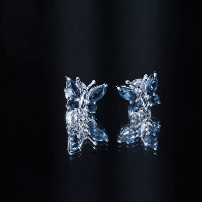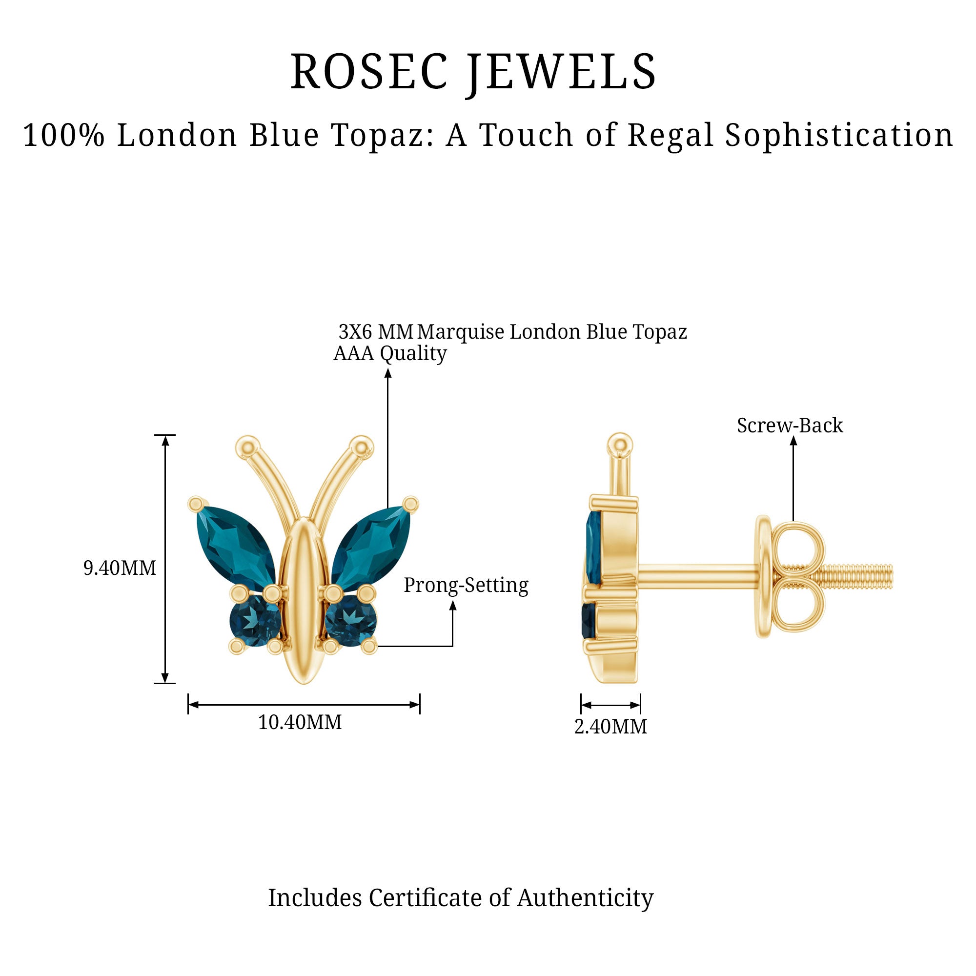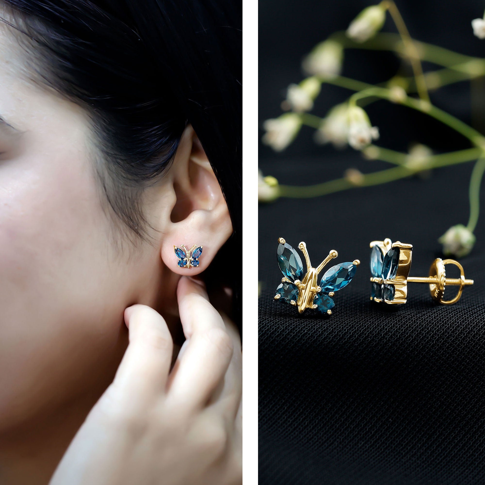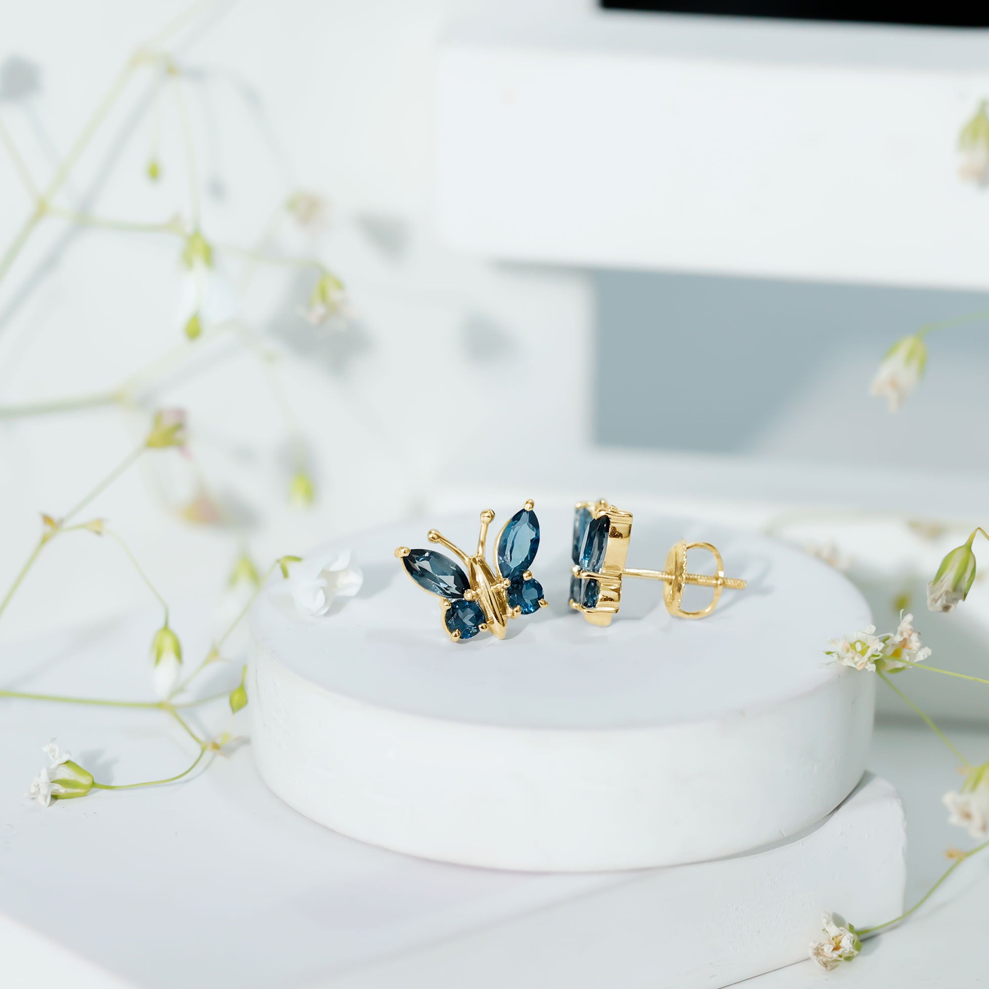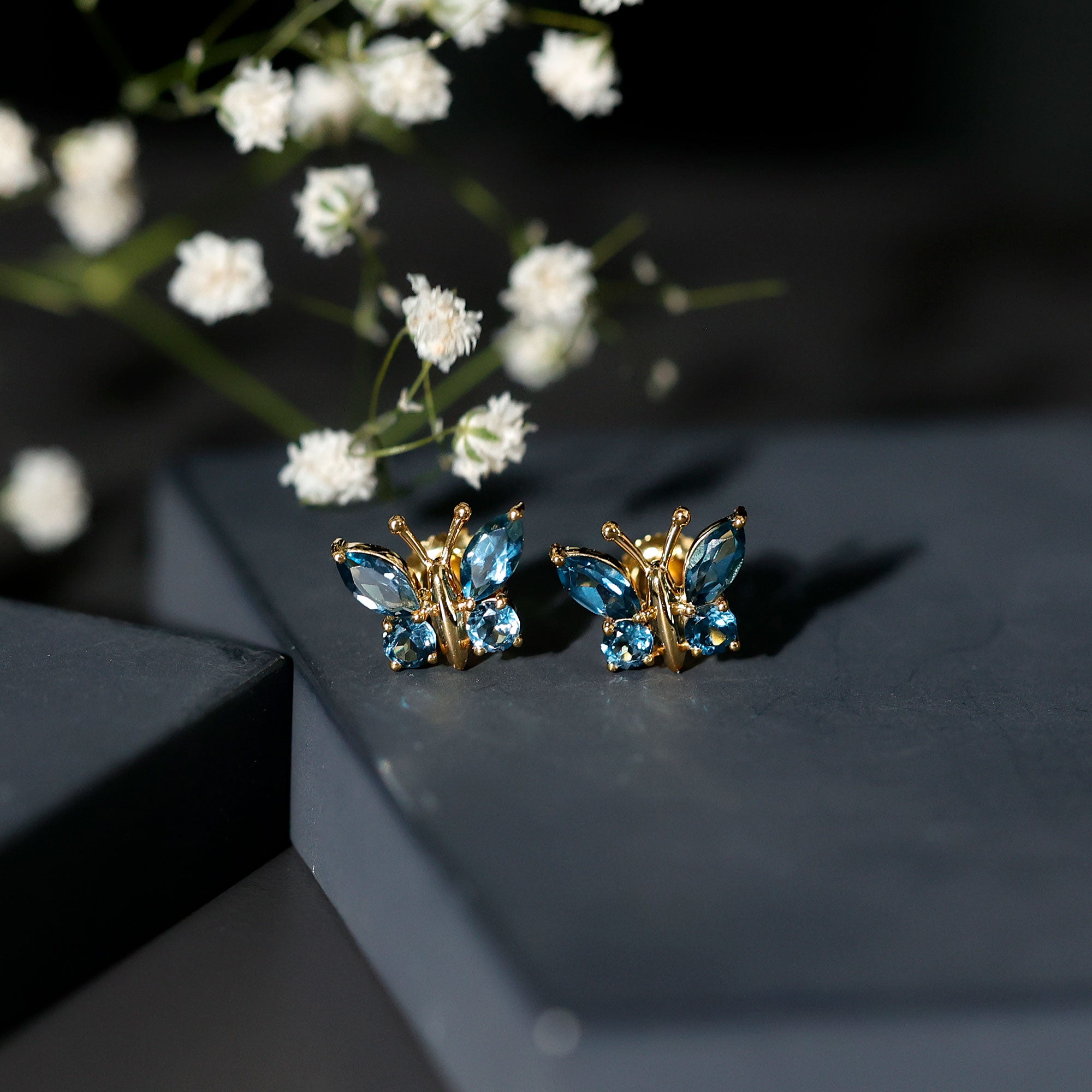 This Cute Butterfly Stud Earrings embellished with Round and Marquise Cut London Blue Topaz Gemstones are set in a Prong Setting, crafted in a Solid Gold.
