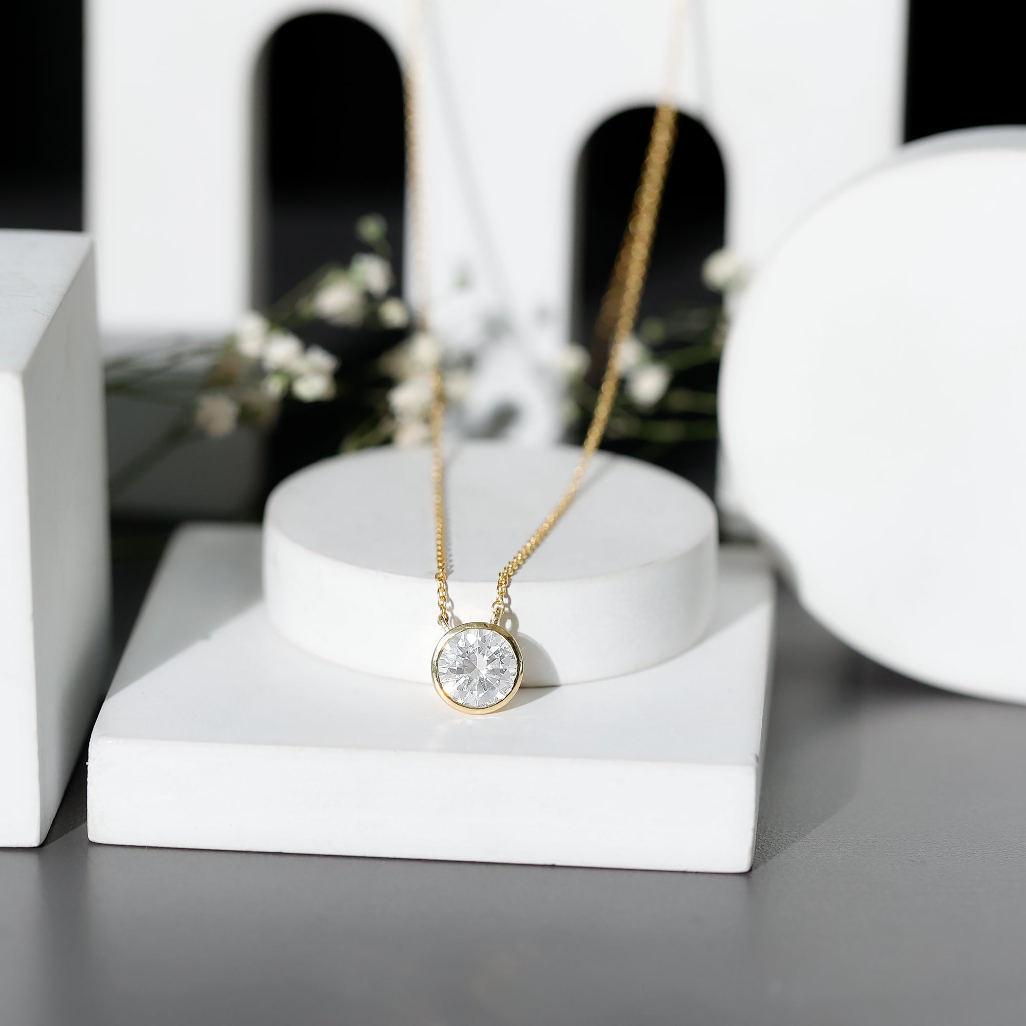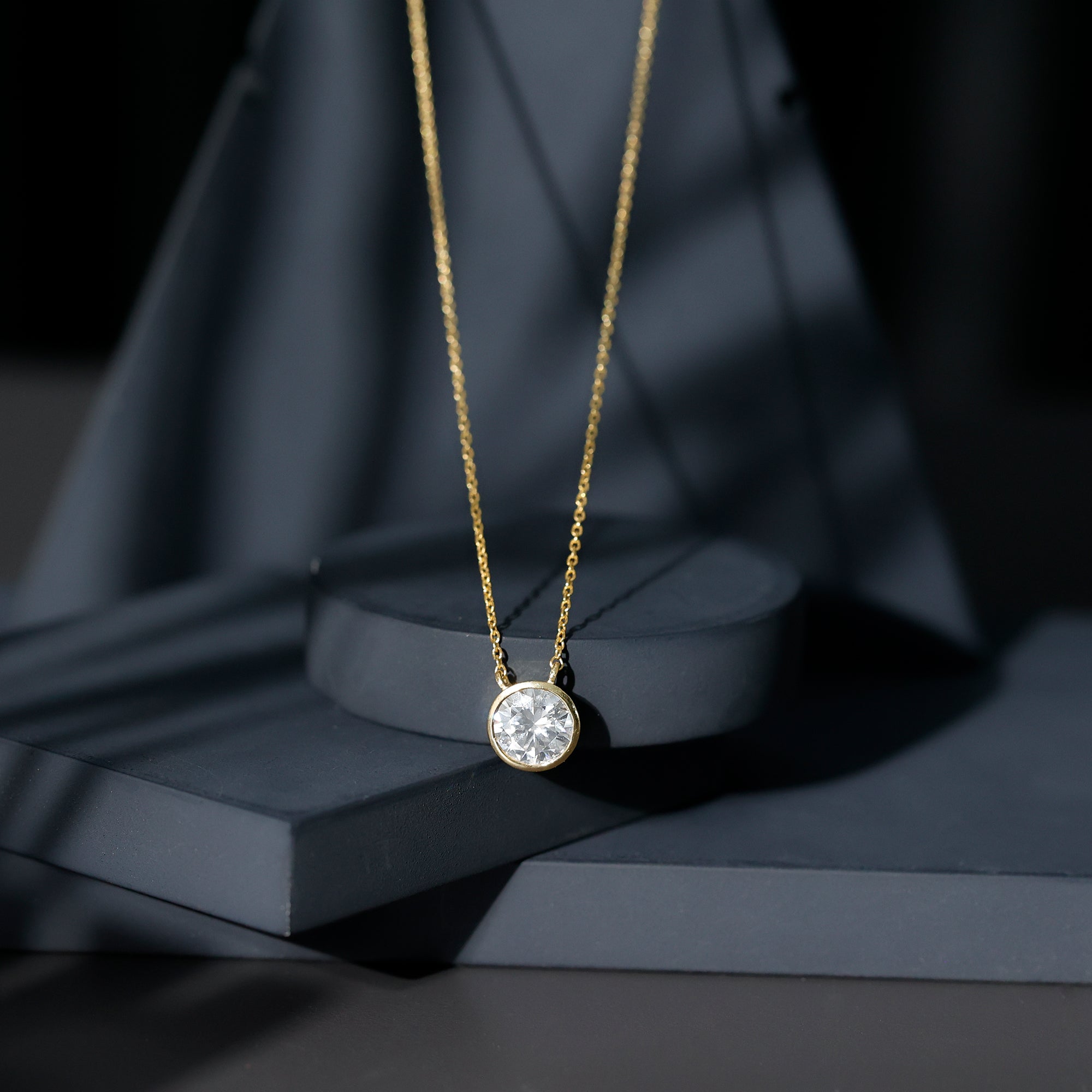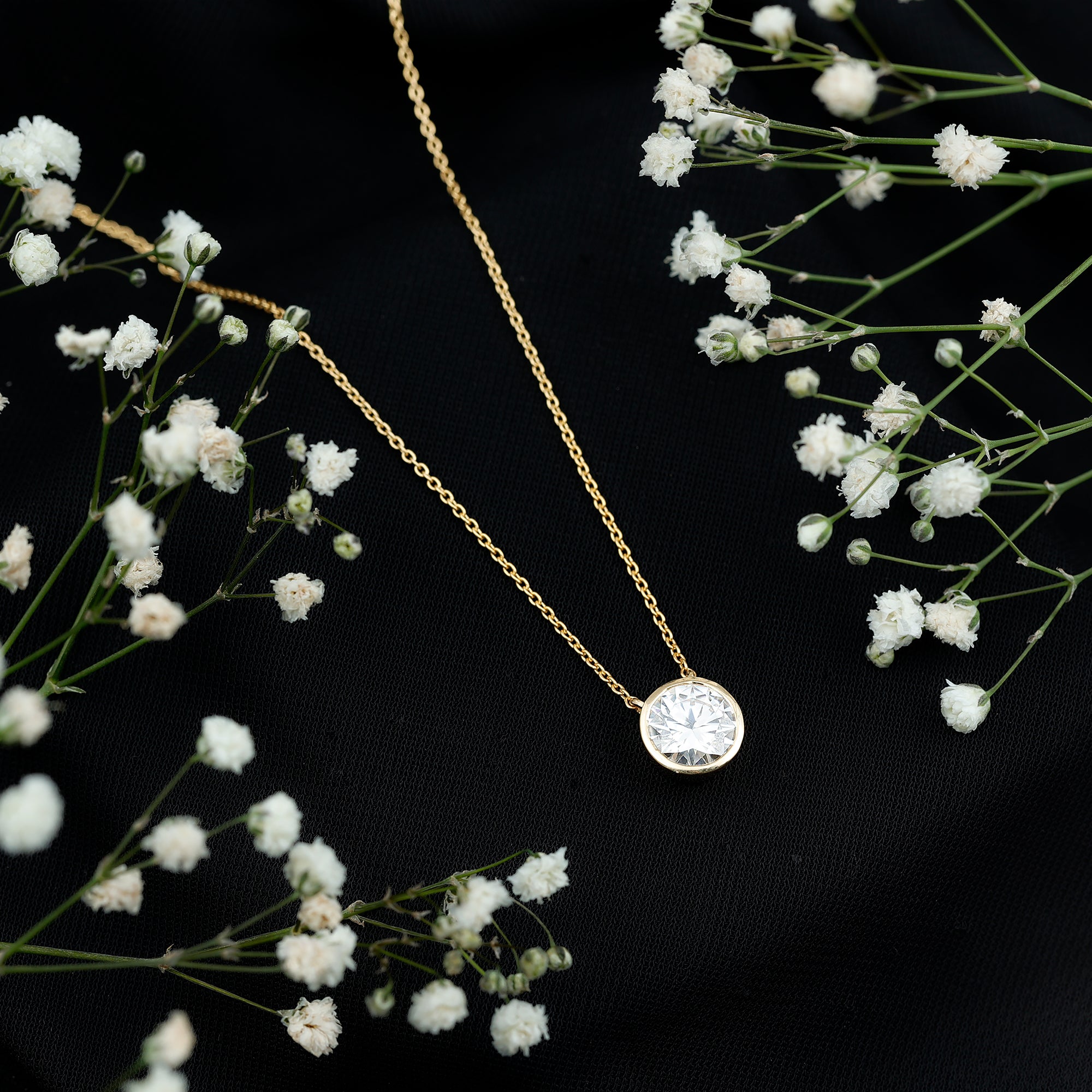Enhance the significance of your special occasion with this exquisite Solitaire Necklace featuring a Round-Shaped Moissanite in a Bezel Setting. The Moissanite necklace boasts a minimalist design and is expertly crafted in solid gold.