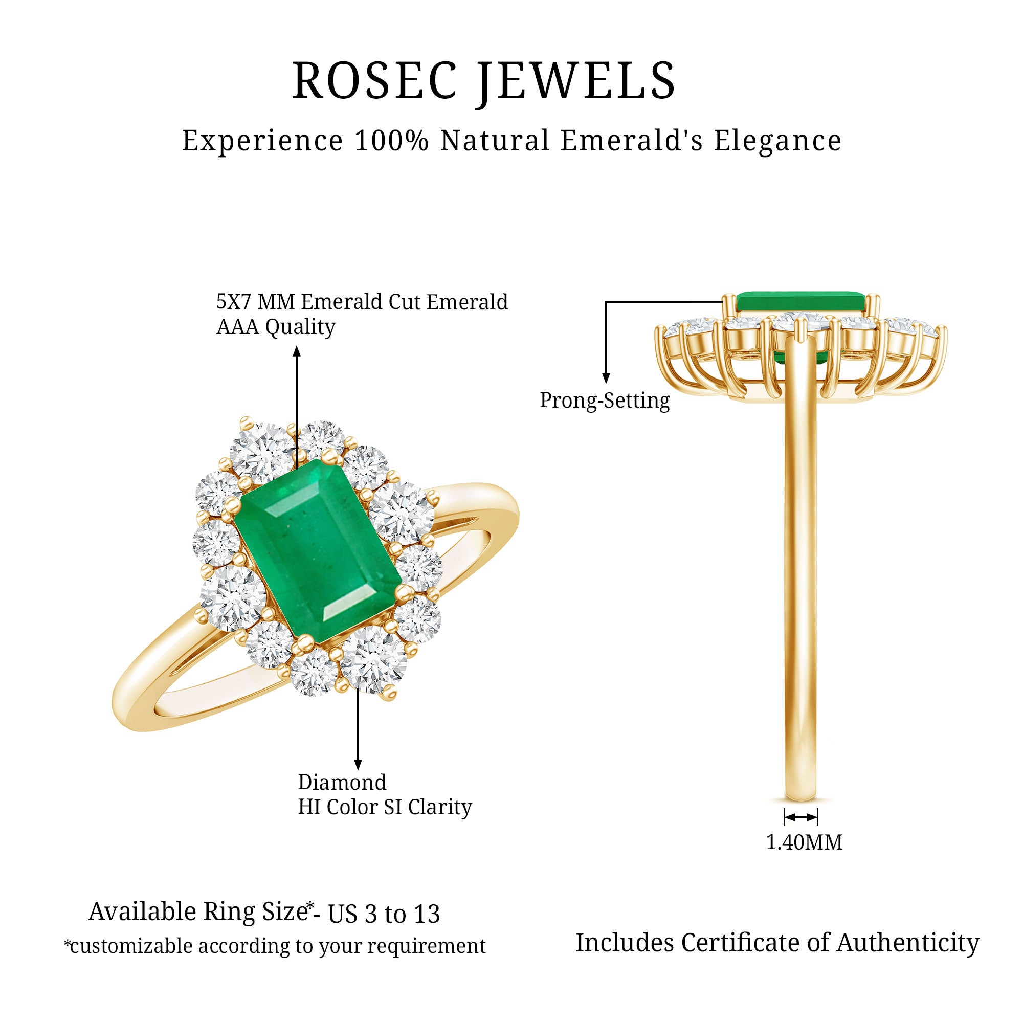 Unveil a love story as timeless as your heart with this Emerald Cut Engagement Ring, a piece that effortlessly blends sophistication and romance. At its center of this Timeless Engagement Ring is a 5X7 mm Emerald Cut Emerald set in Prong Setting, exuding a deep green hue that symbolizes harmony and eternal devotion. Surrounding this AAA Quality Emerald, a Halo of sparkling HI-SI Diamond stones catches the light from every angle. Whether marking a proposal, an anniversary or a milestone of lasting affection, this Emerald Cut Emerald Ring serves as a radiant emblem of your devotion. Available in a variety of sizes and presented in a signature jewelry box, this Emerald Diamond Engagement Ring is designed to delight from the moment it is unwrapped. Every detail has been thoughtfully crafted to capture attention and hearts alike. A sparkling token of your love that will be cherished forever.