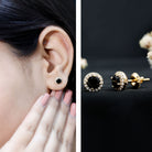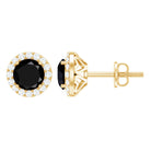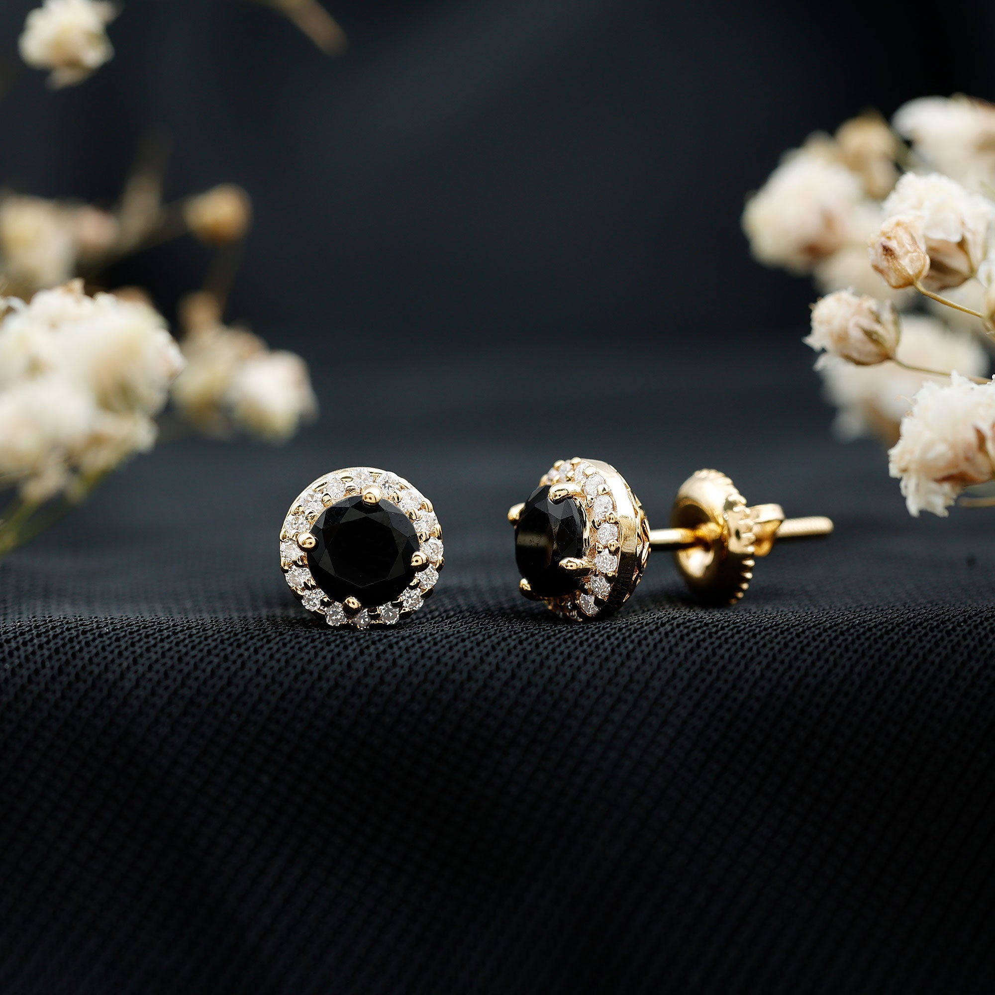 This stunning stud earring is a true beauty, with a created Black Diamond solitarily set in a prong setting and surrounded by a halo of sparkling moissanite stones. The earring is crafted in gold, making it both beautiful and durable. The combination of the created Black Diamond center stone and the surrounding moissanite stones in a halo creates a mesmerizing look that will catch the eye of everyone around you. Wear it to add a touch of elegance to any outfit or as a special treat for yourself. This stud earring is sure to become a cherished piece in your jewelry collection.