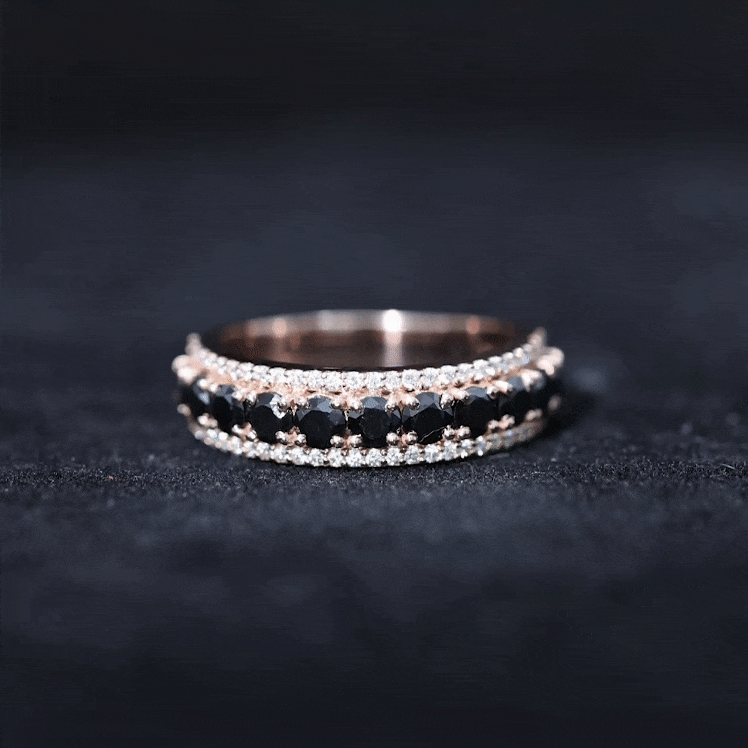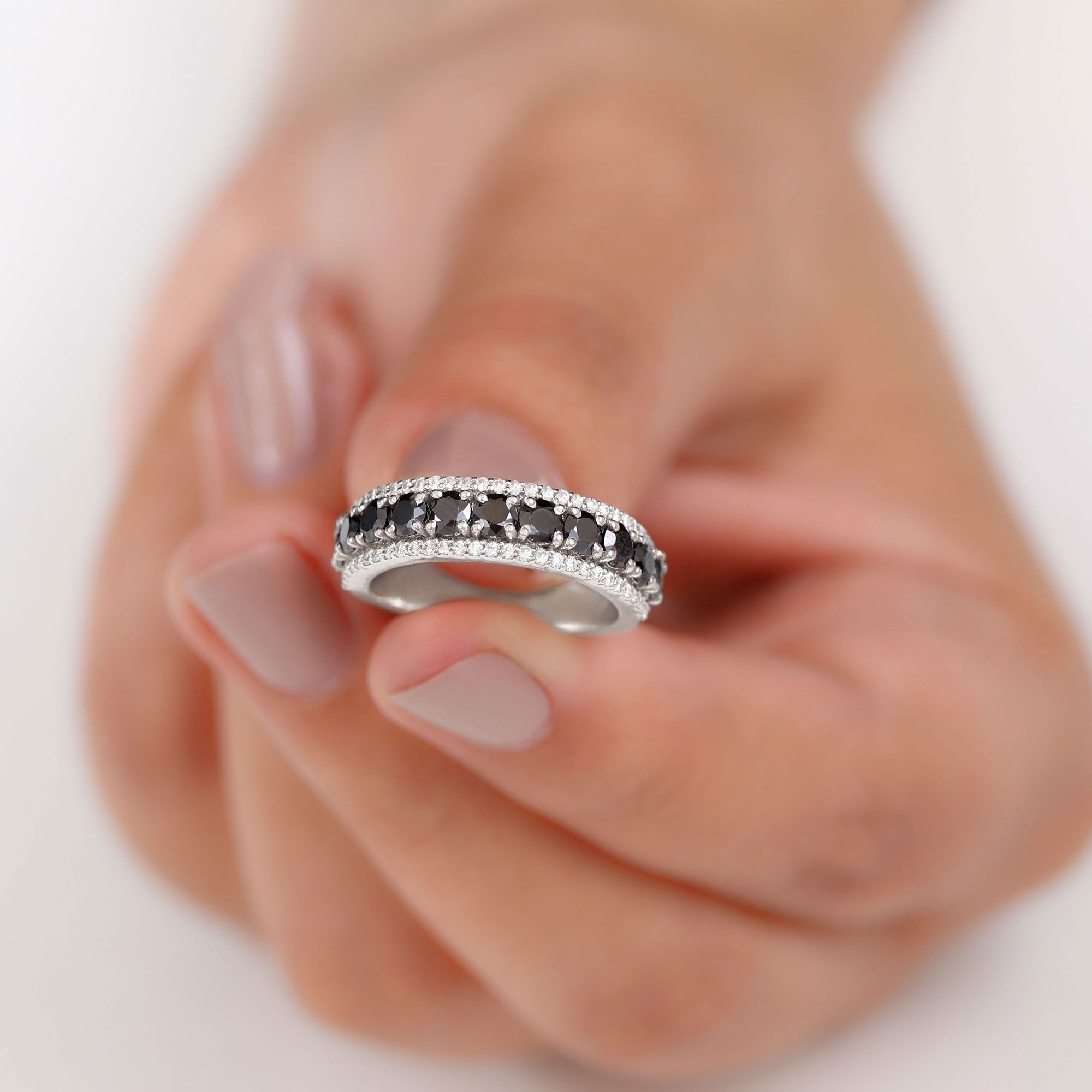 The Anniversary Ring features Round Shape Lab Created Black Diamonds in Prong Setting as middle row and surrounded by White Diamond Accents. This Solid Gold crafted Half Eternity Ring is a perfect trinket to commemorate the occasion.