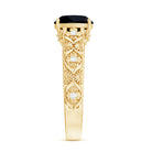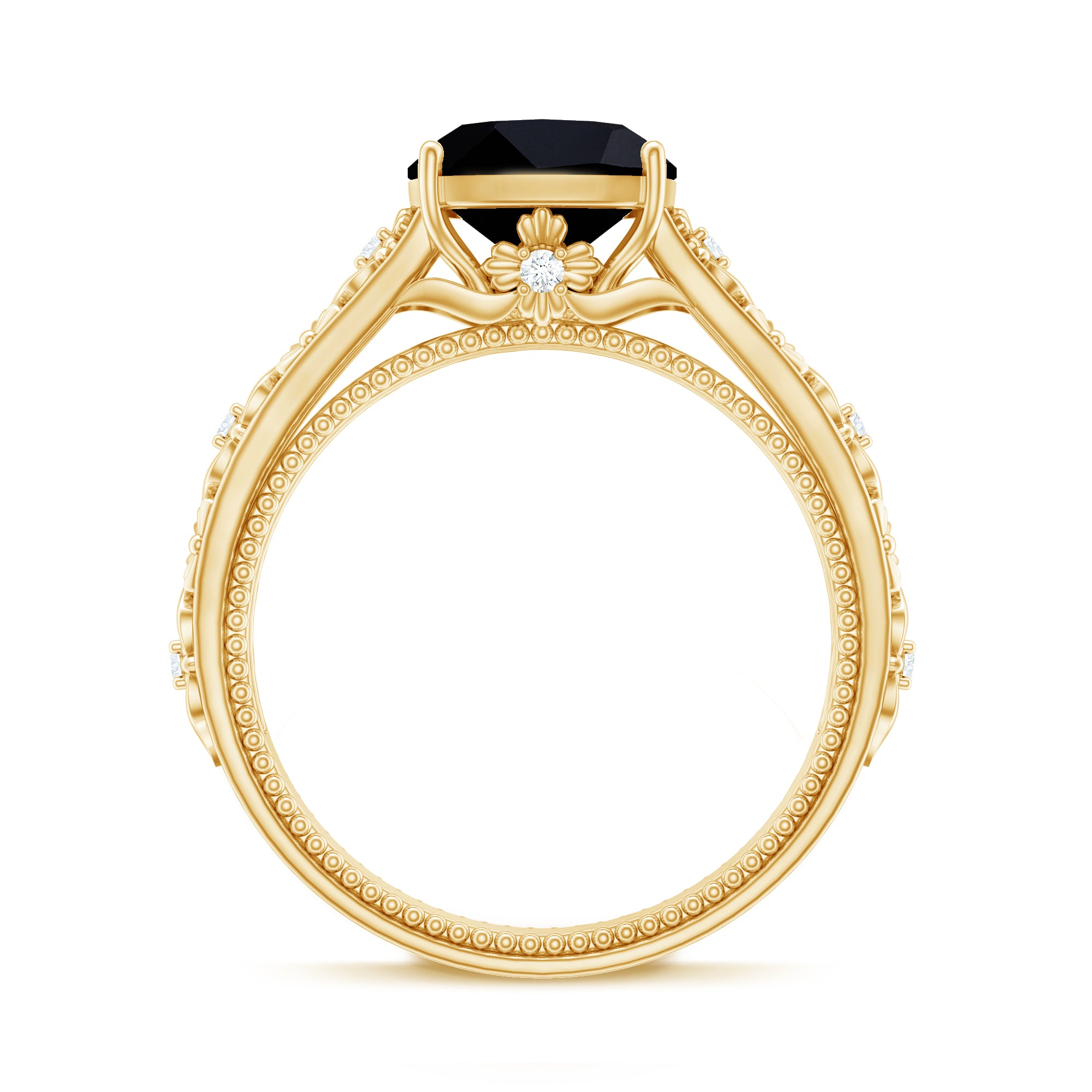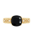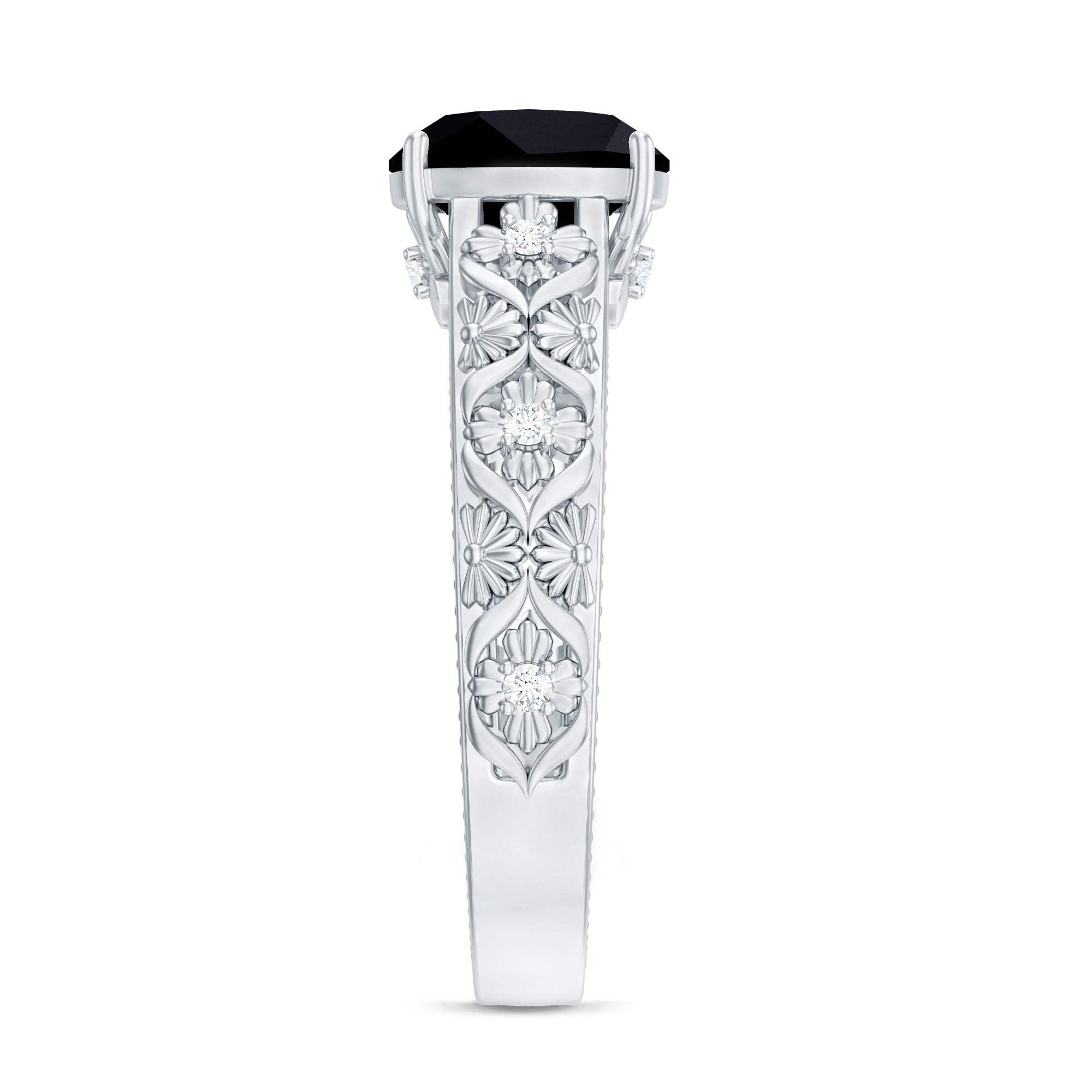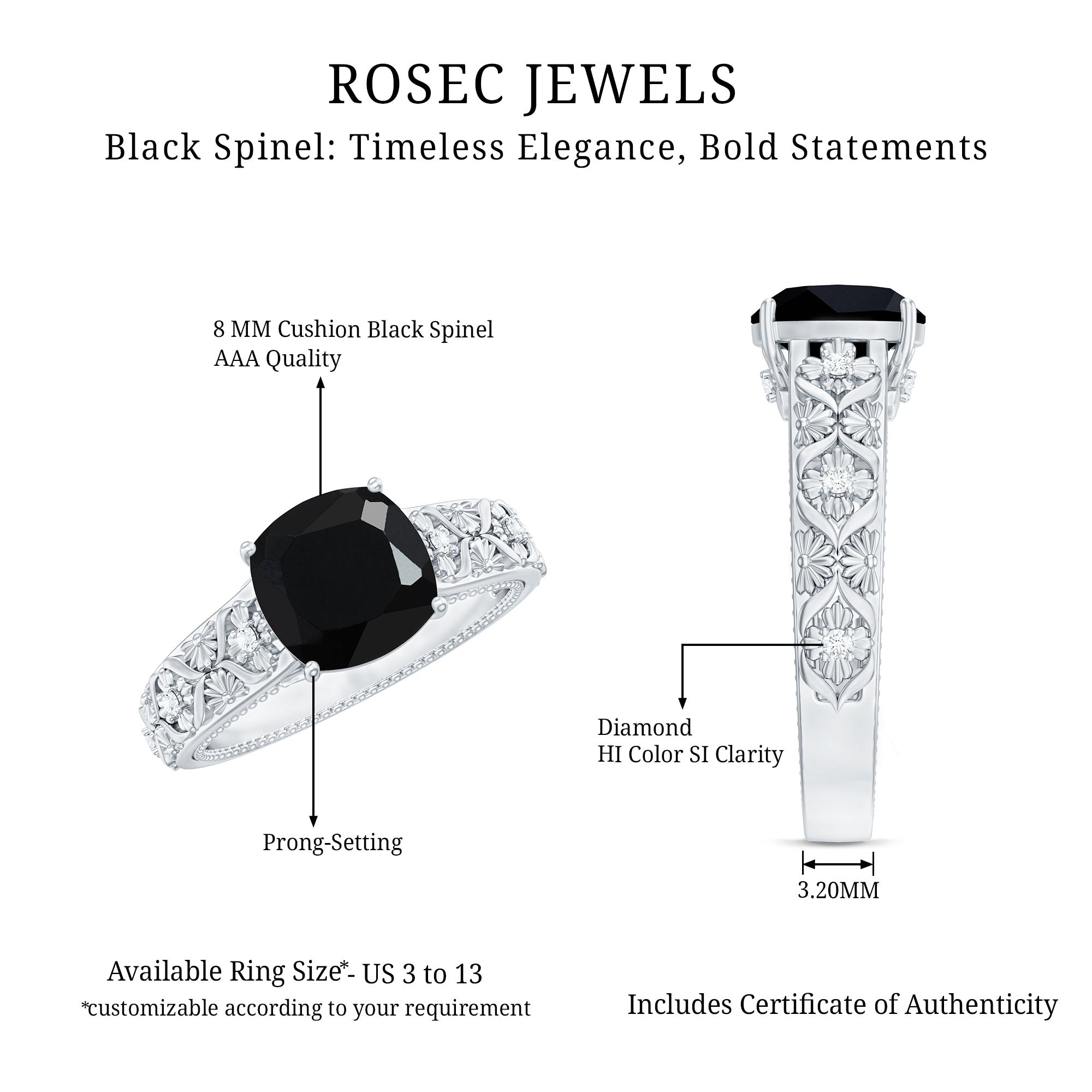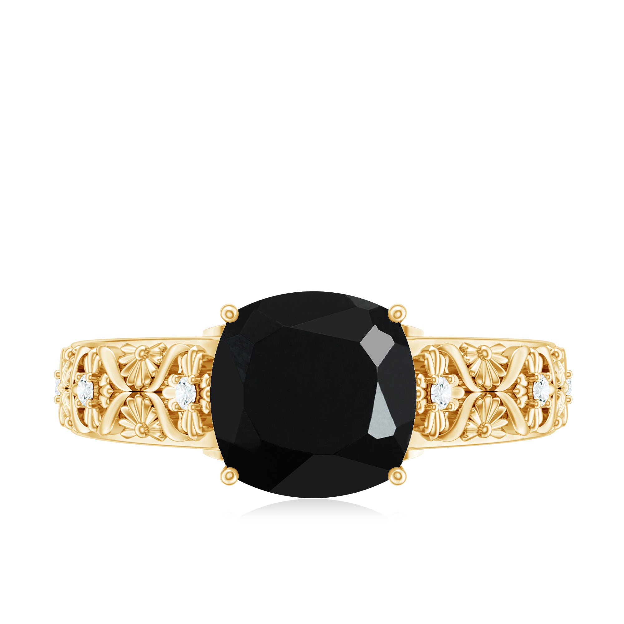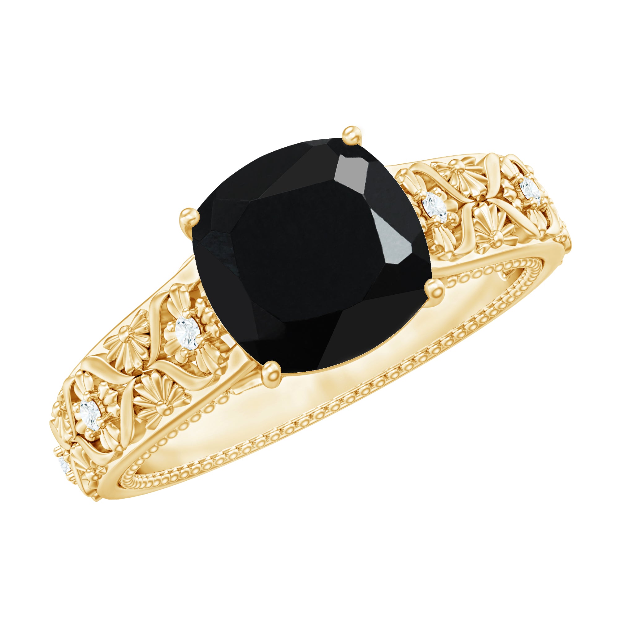 Gorgeous Black Spinel Solitaire Ring makes the statement accessory for women. Floral designs are engraved on the band with Cushion Cut Black Spinel as the solitaire, and Round Brilliant Diamonds on the sides. Unique Engagement Ring is composed in Solid Gold. present this classic ring to your mother or wife.