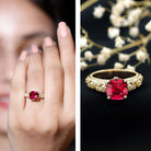 Gorgeous Lab Created Ruby Solitaire Ring makes the statement accessory for women. Filigree designs are engraved on the band with Cushion Cut Lab Created Ruby as the solitaire, and Round Brilliant Diamonds on the sides. Engraved Engagement Ring is composed in Solid Gold. present this classic ring to your mother or wife.