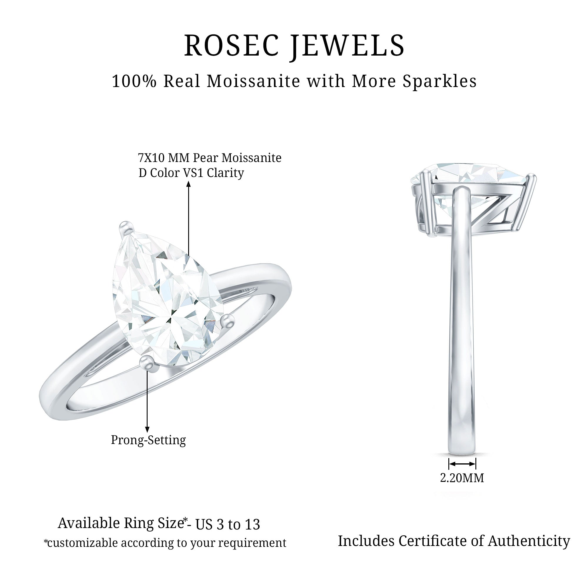 The Moissanite Solitaire Engagement Ring is a cherished piece of jewelry that enhances your style and lets you appreciate it even more. The classic Teardrop Engagement Ring represents your eternal love. It features a 7X10 MM pear cut moissanite, securely set in 3 prong setting as the solitaire stone. This gem has been chosen for its D color and VS1 clarity and comes with a genuine certification. The 2 Carat Moissanite Ring is available in US sizes ranging from 3 to 13. It arrives in a signature jewelry box that ensures safe and secure storage. Symbolizing elegance and sophistication, this Pear Moissanite Engagement Ring has been carefully selected for its outstanding brilliance and clarity. As a beautiful representation of your unique love story with its simple yet elegant design, this Womens Moissanite Ring is a fantastic choice that guarantees to make the moment unforgettable. Whether you are getting ready to propose or just want to celebrate a special occasion, it stands as a shining testament to your enduring love. It is also perfect for those who appreciate a mix of simple and classic design.