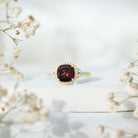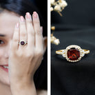 Capture her heart with this breathtaking Garnet Engagement Ring, featuring a dazzling cushion cut natural Garnet in the center, surrounded by a halo of sparkling Diamond stones. The cushion cut of the Garnet creates a unique and vintage-inspired look, while the Diamond halo adds a touch of glamour and luxury. This exquisite ring is made from the finest materials, ensuring its longevity and timeless appeal. Its the perfect engagement ring for the woman who loves both classic and contemporary styles.