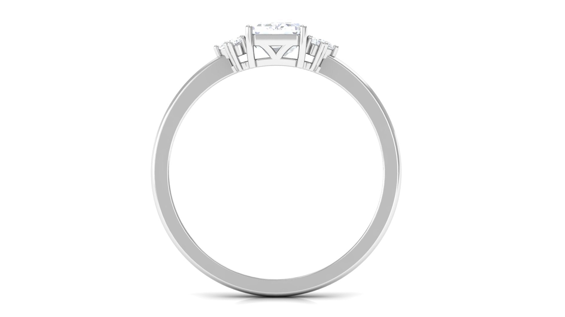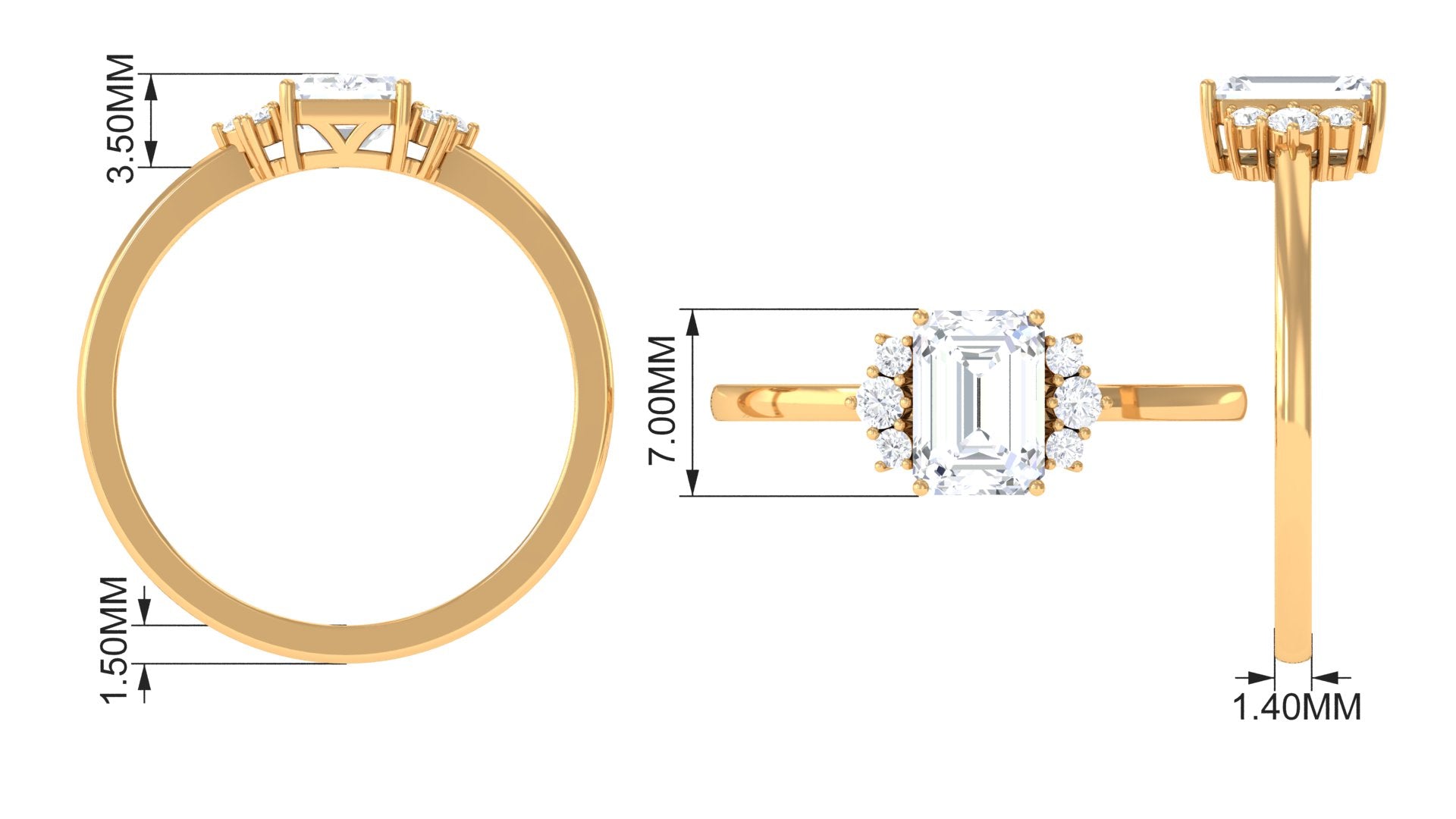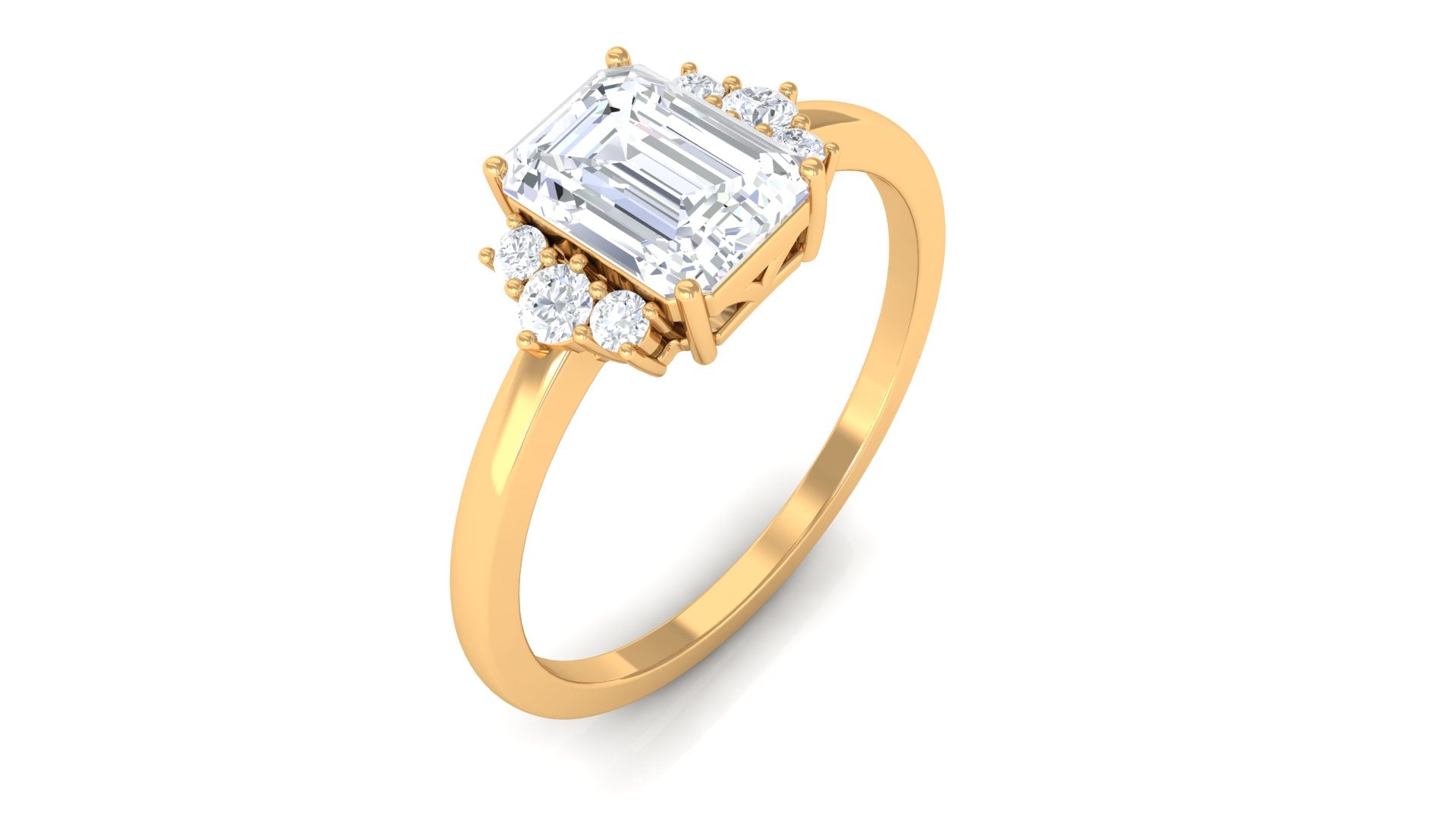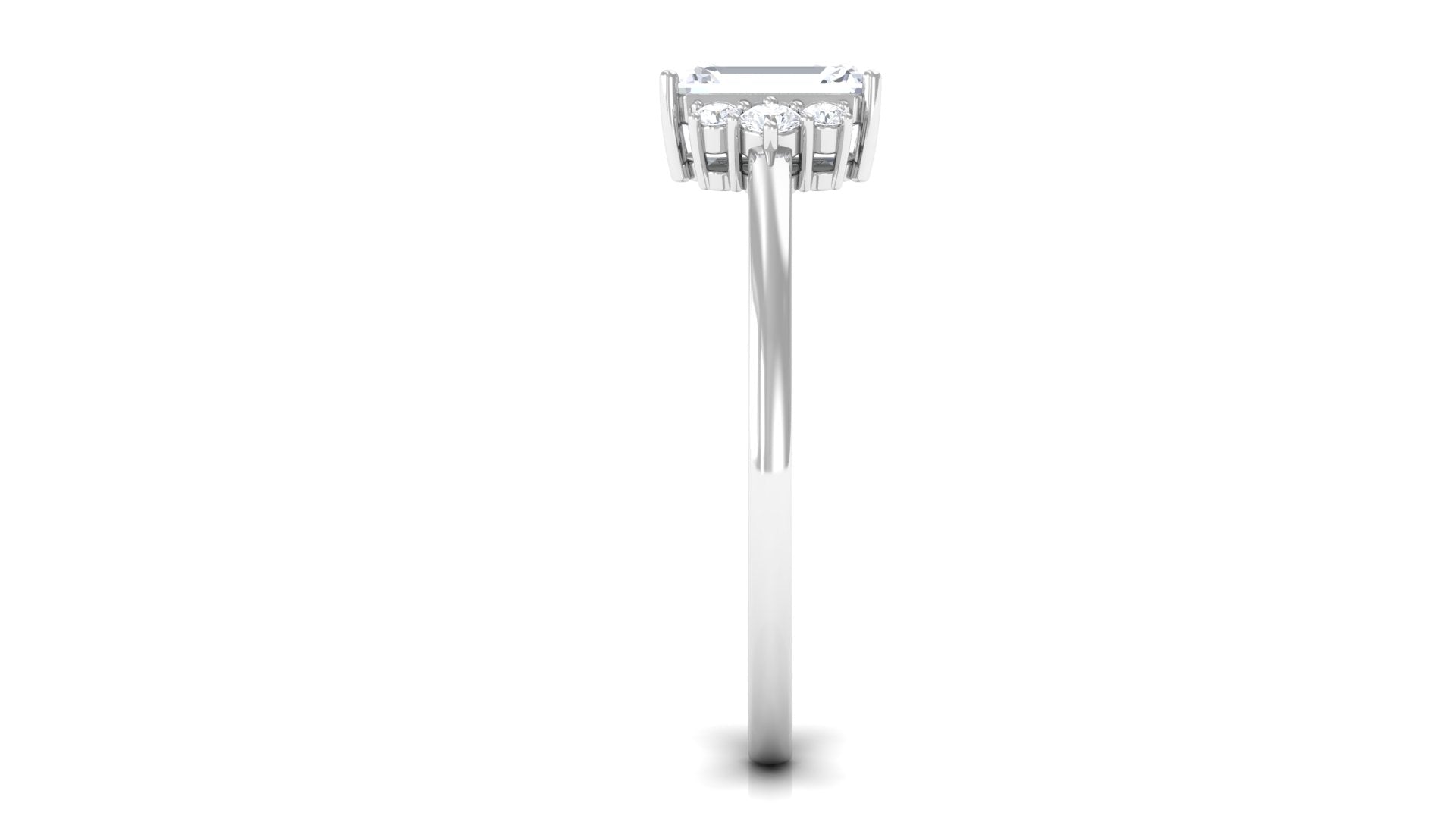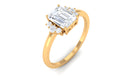 Whether worn as an Engagement Ring or simply a gorgeous gemstone addition, this shimmering Solitaire Engagement Ring is sure to make a standout addition to any jewelry collection. This modern and sophisticated Zircon Engagement Ring is crafted in gold, features an octagon cut simulated diamond set in prong setting with round cut zircon trio on both side of the center stone.