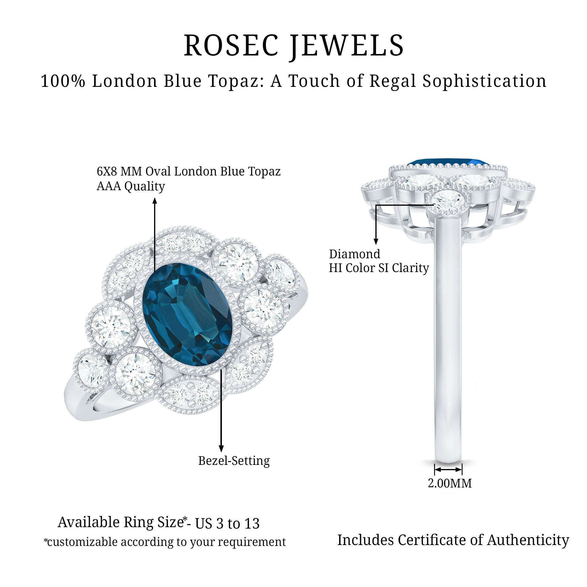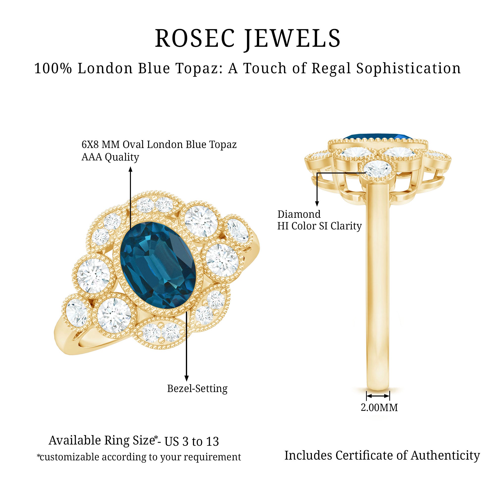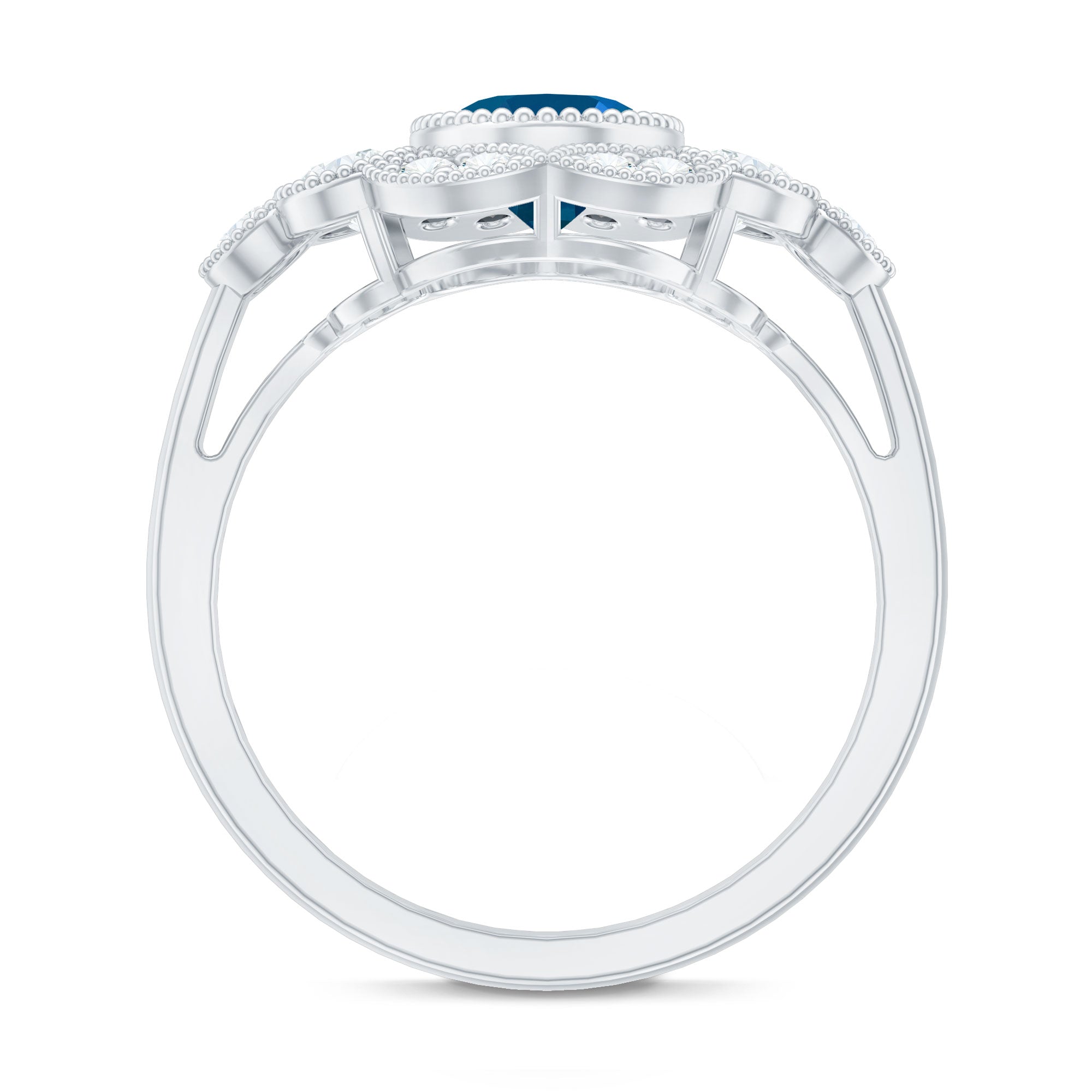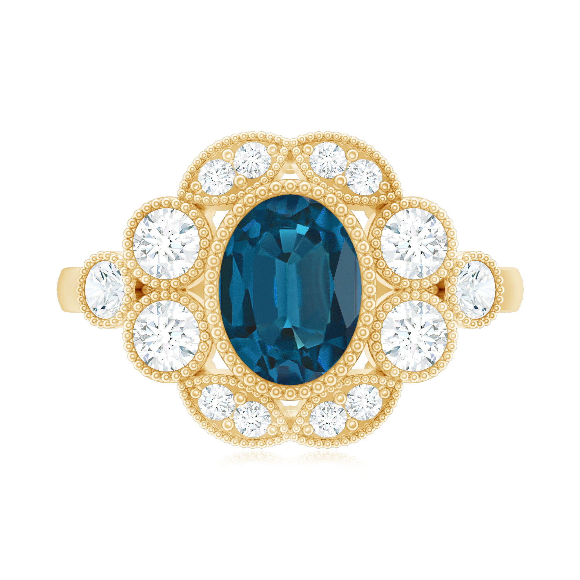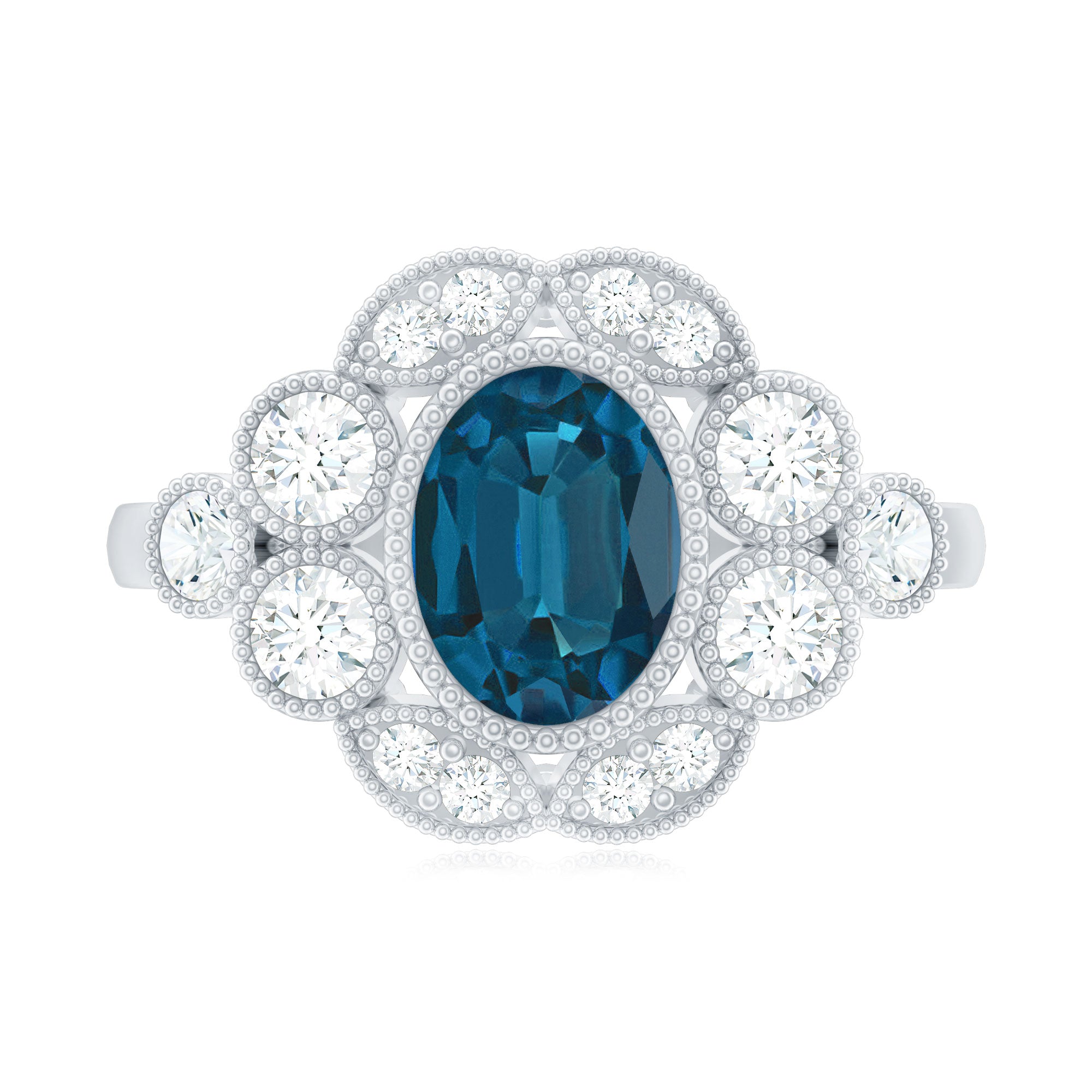 Real Oval London Blue Topaz Vintage Engagement Ring with Diamond