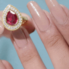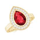 Enhance your Look with this beautiful Solitaire Ring. The Pear Cut Created Ruby as Solitaire in Bezel Setting encircled with Round Shape Diamond stud in Halo. This Ring is Mounted in Solid Gold. Grab This Beautiful Halo Ring for your love as Valentine Gift