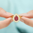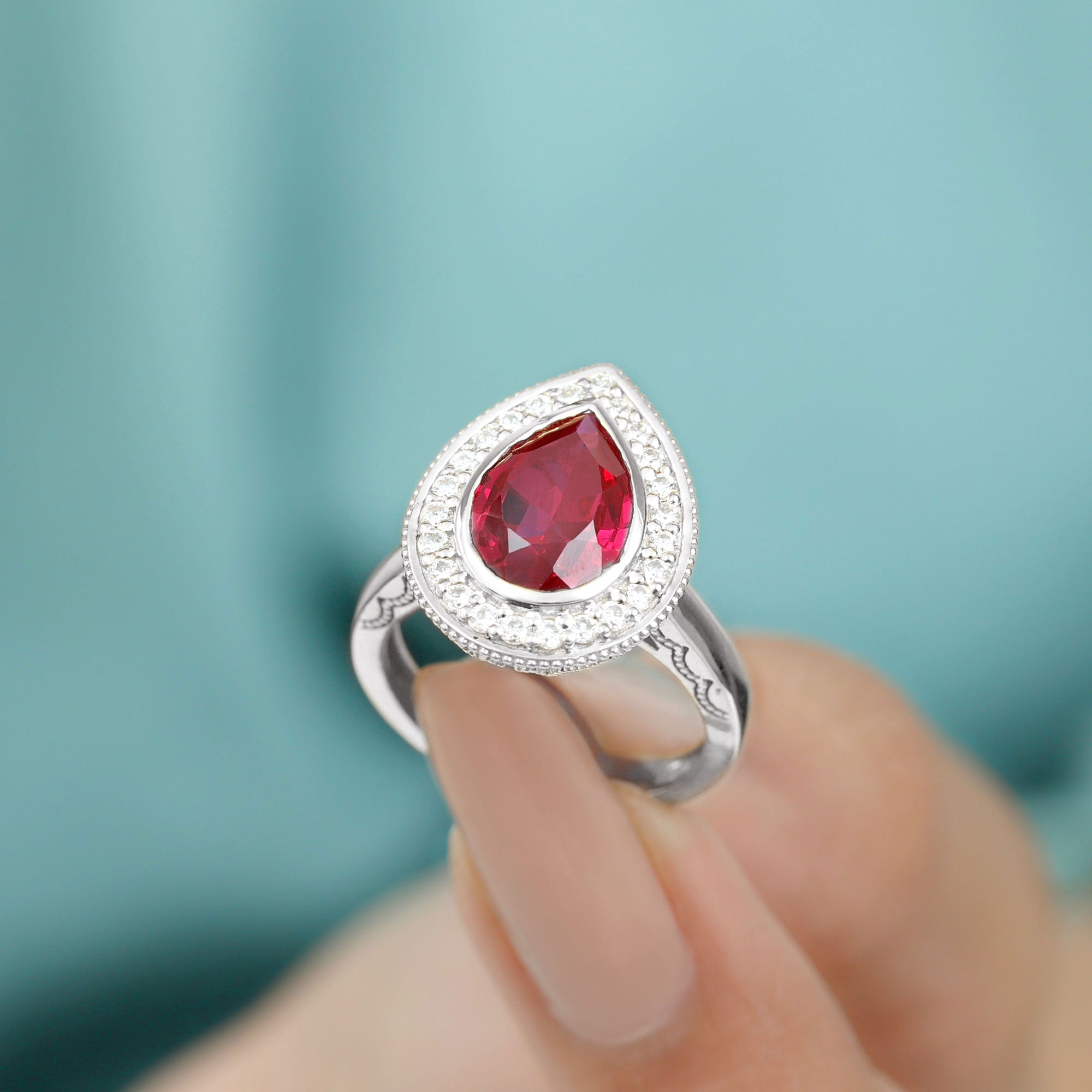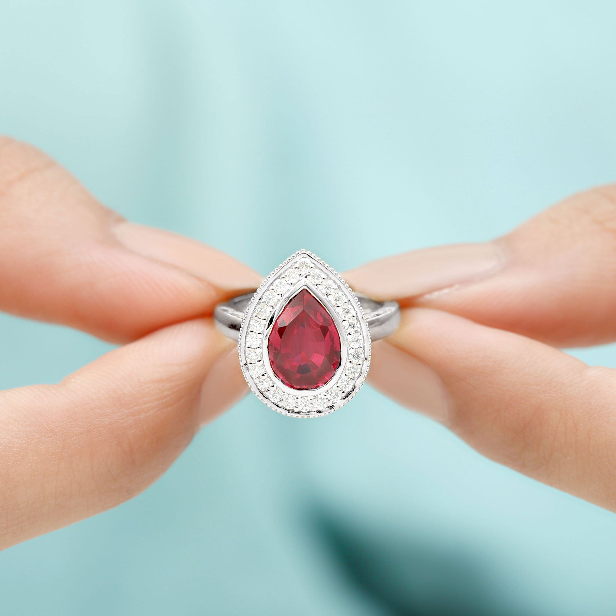 2 CT Pear Cut Created Ruby Solitaire Engagement Ring with Diamond Halo