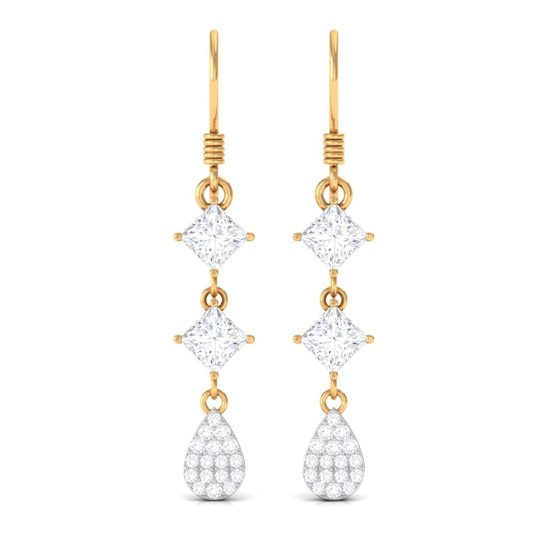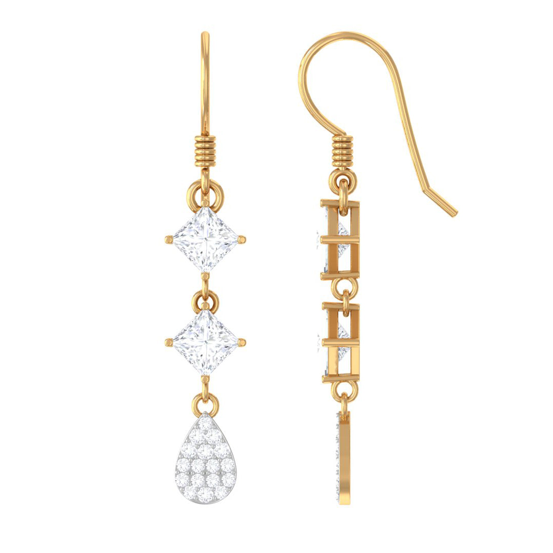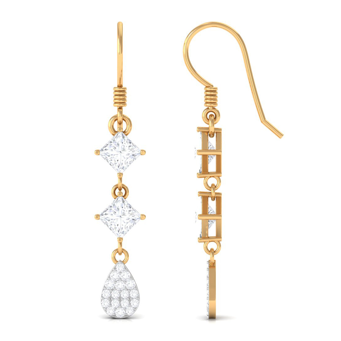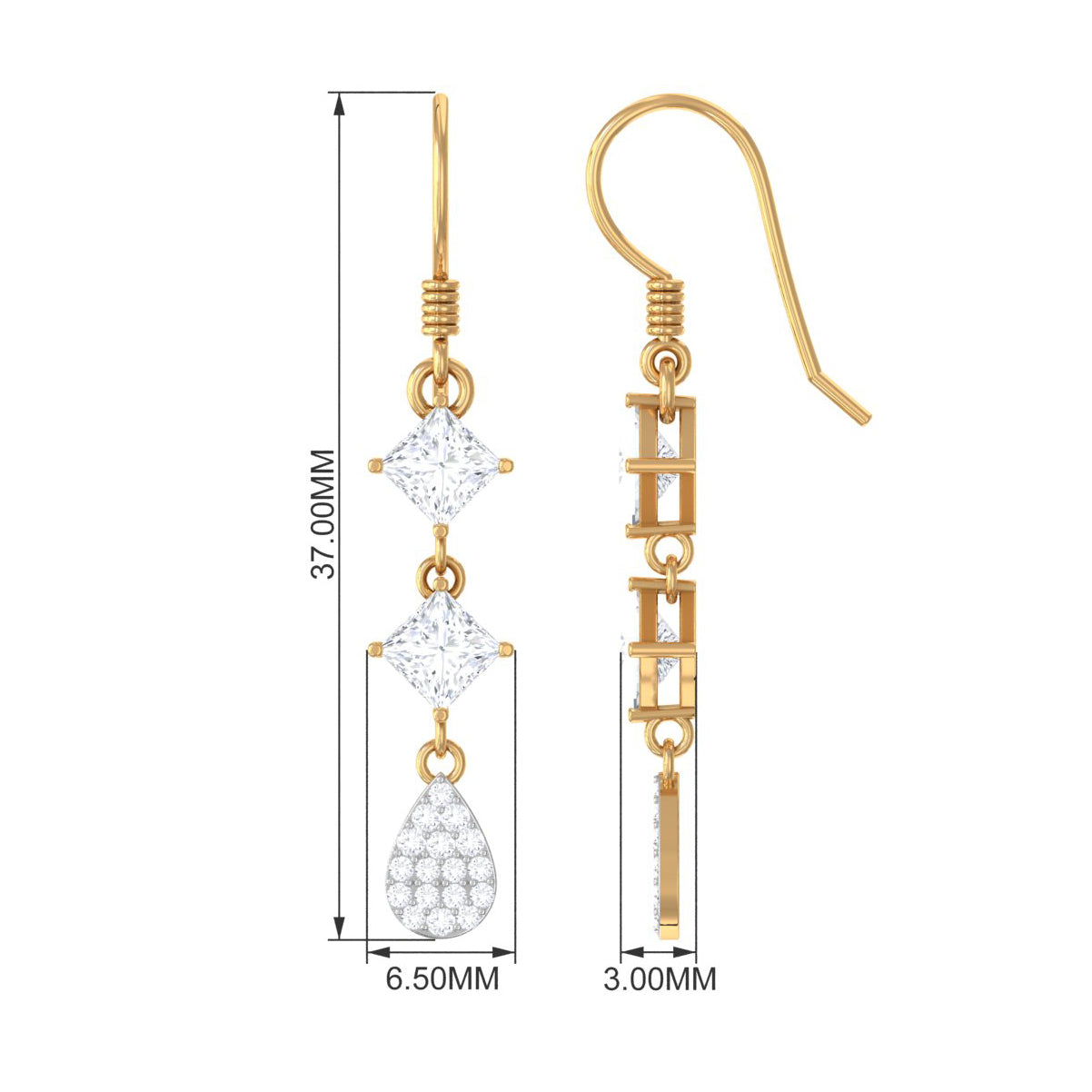 Enhance your elegance with these stunning Moissanite Dangle Earrings. Featuring princess cut Moissanite arranged in a dangle style with more round moissanite on a pear-shaped drop, these dangler earrings exude sophistication. Made from gold, they are the perfect accessory for your lovely women and will elevate any look. Adorn yourself with these radiant moissanite earrings and exude wealth and style.