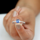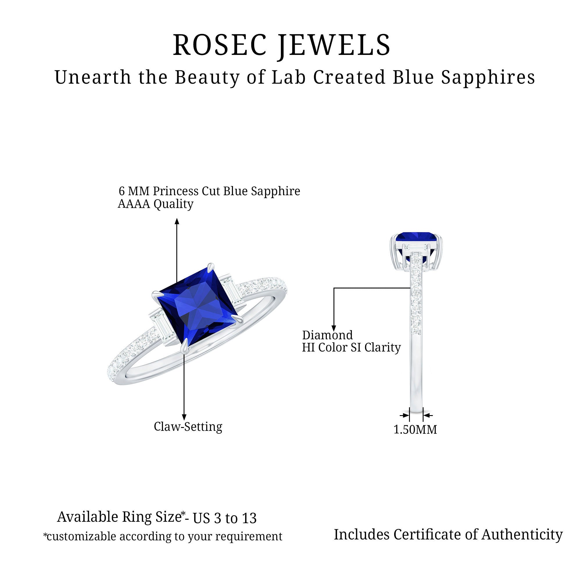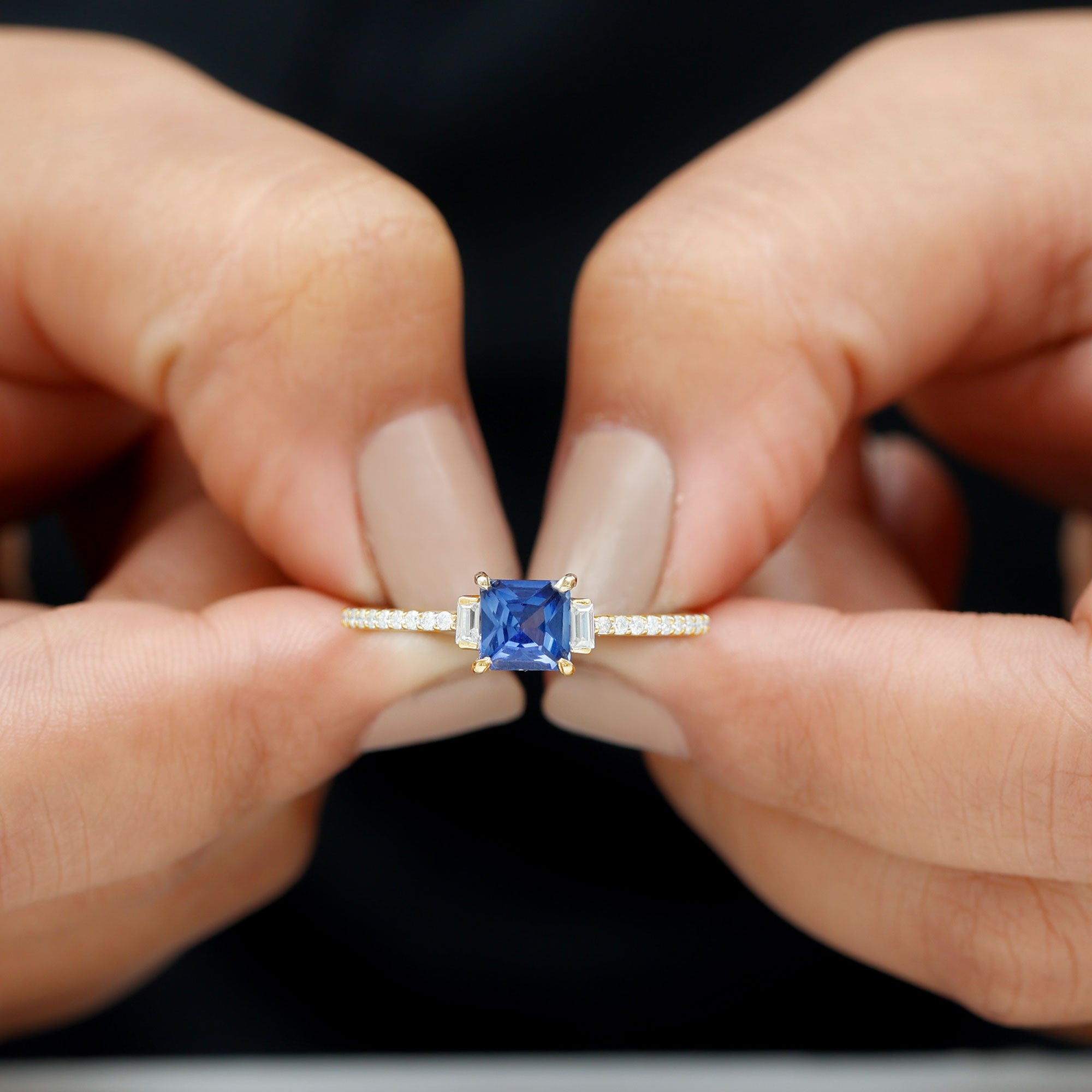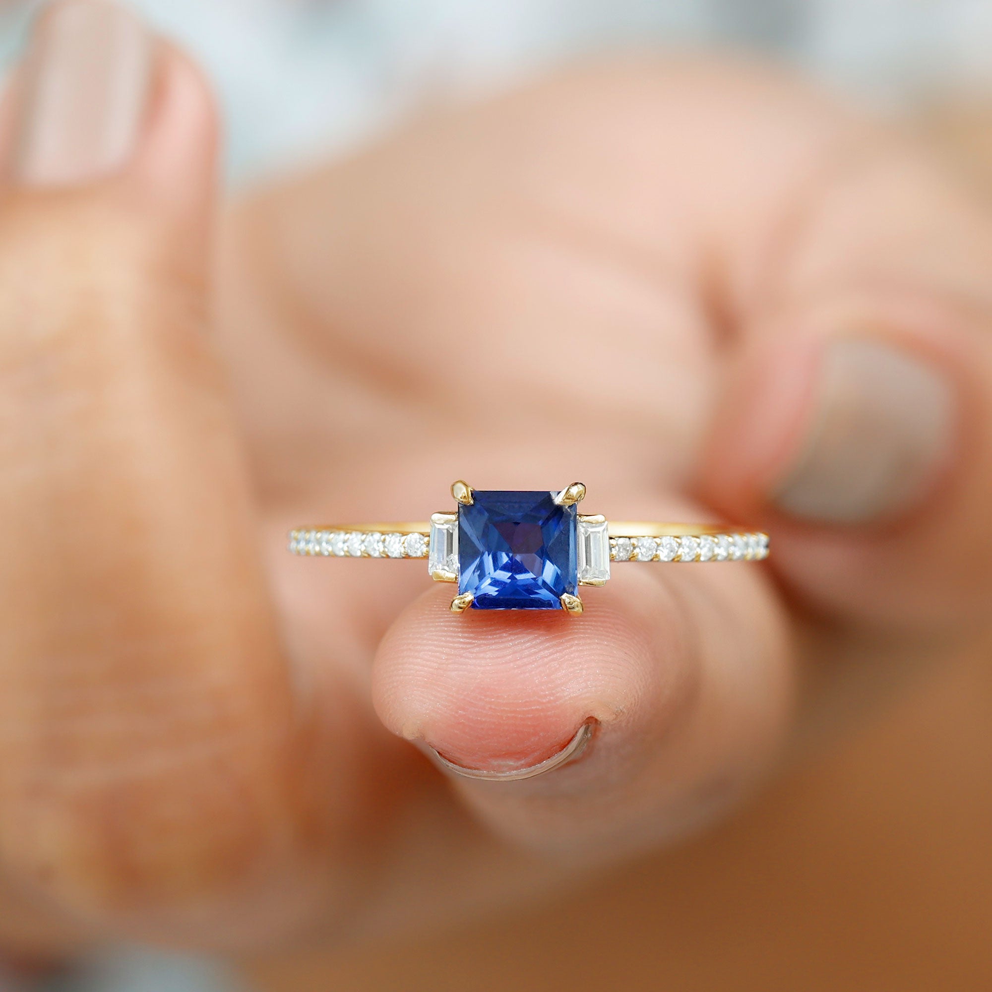 Express your love on a special day with this minimal Promise Ring featuring a Princess Cut Created Blue Sapphire as the solitaire stone, accented with Round and Baguette Cut Diamond side stones. Crafted with Solid Gold, this Valentines Day Ring for Women is a perfect gift to make your beloved feel truly loved.