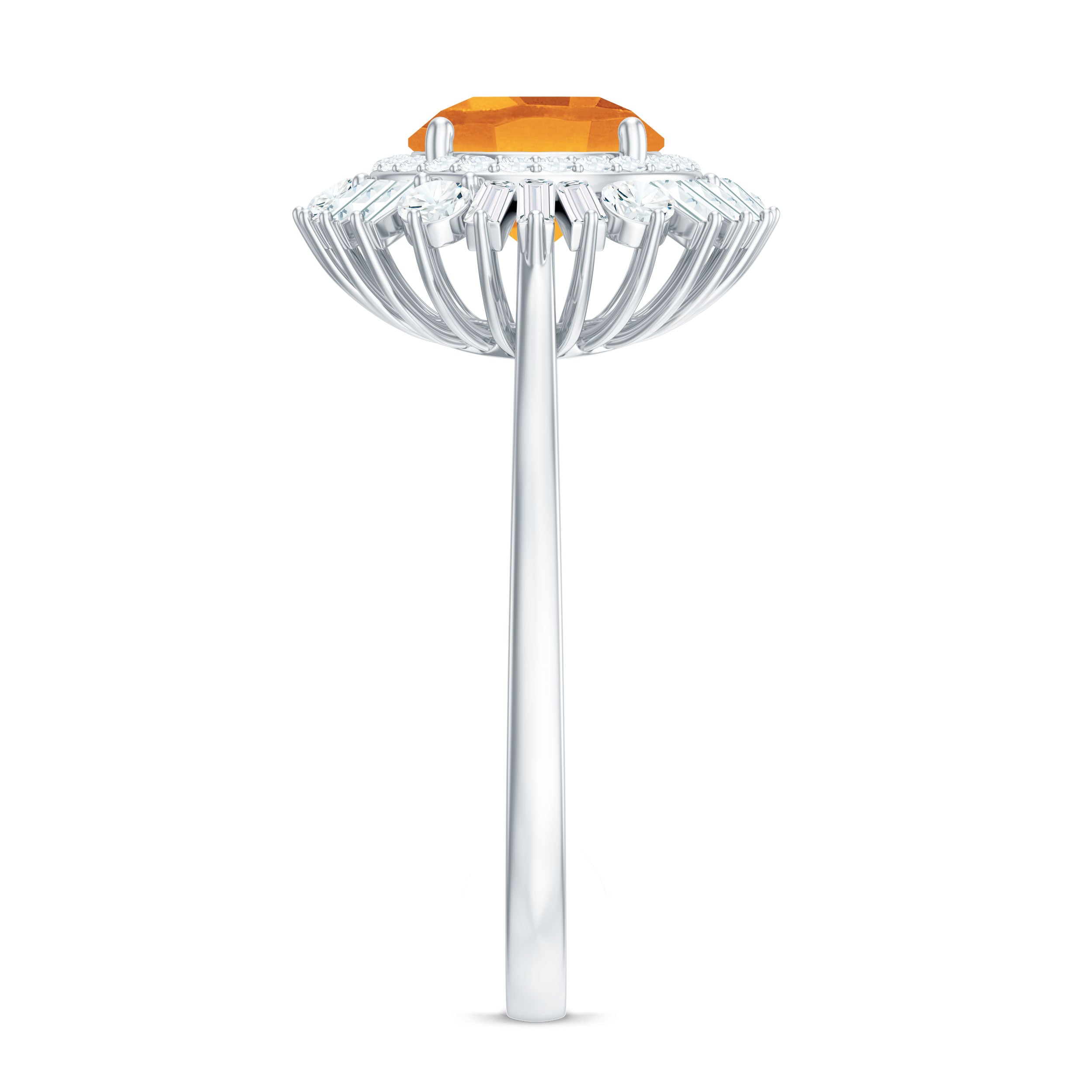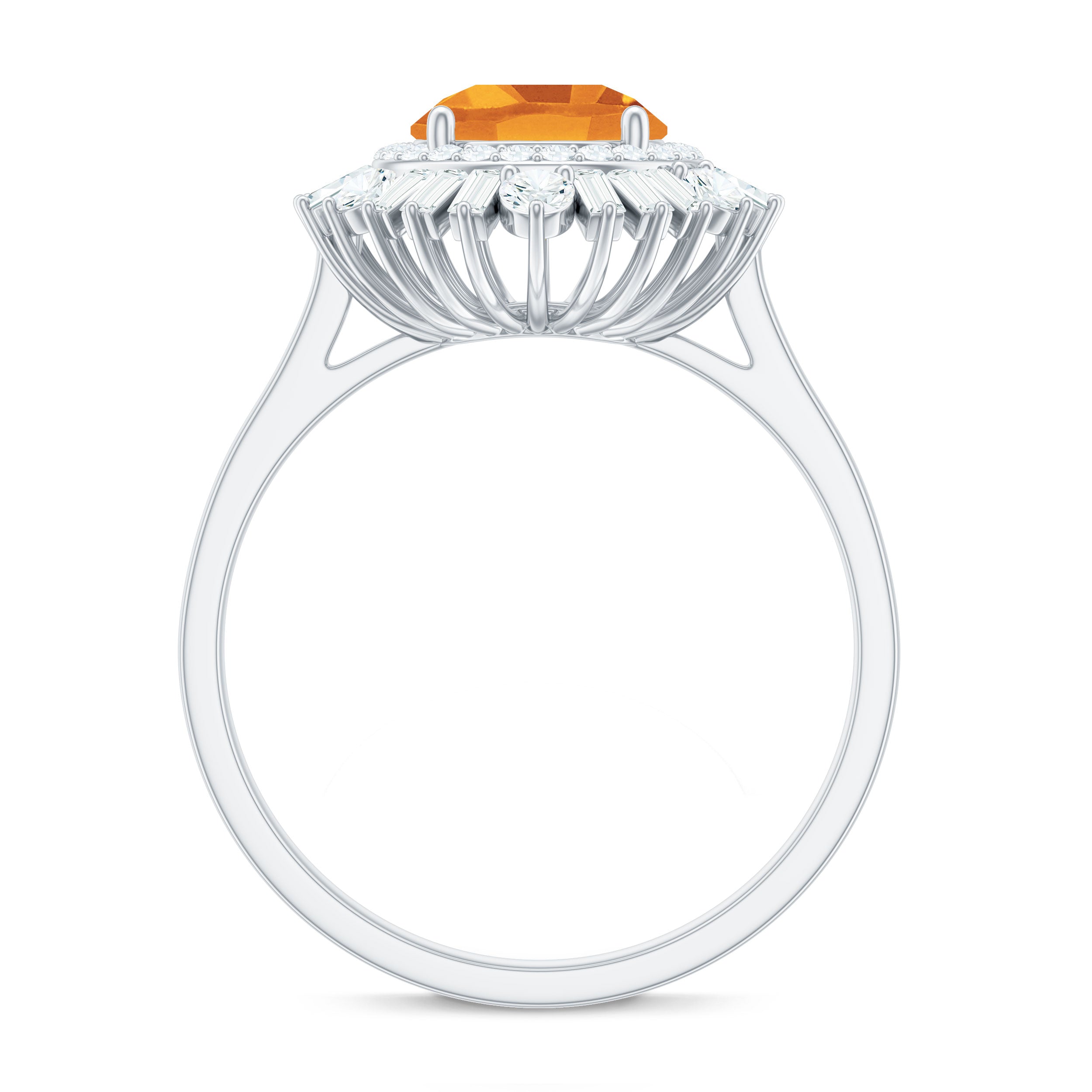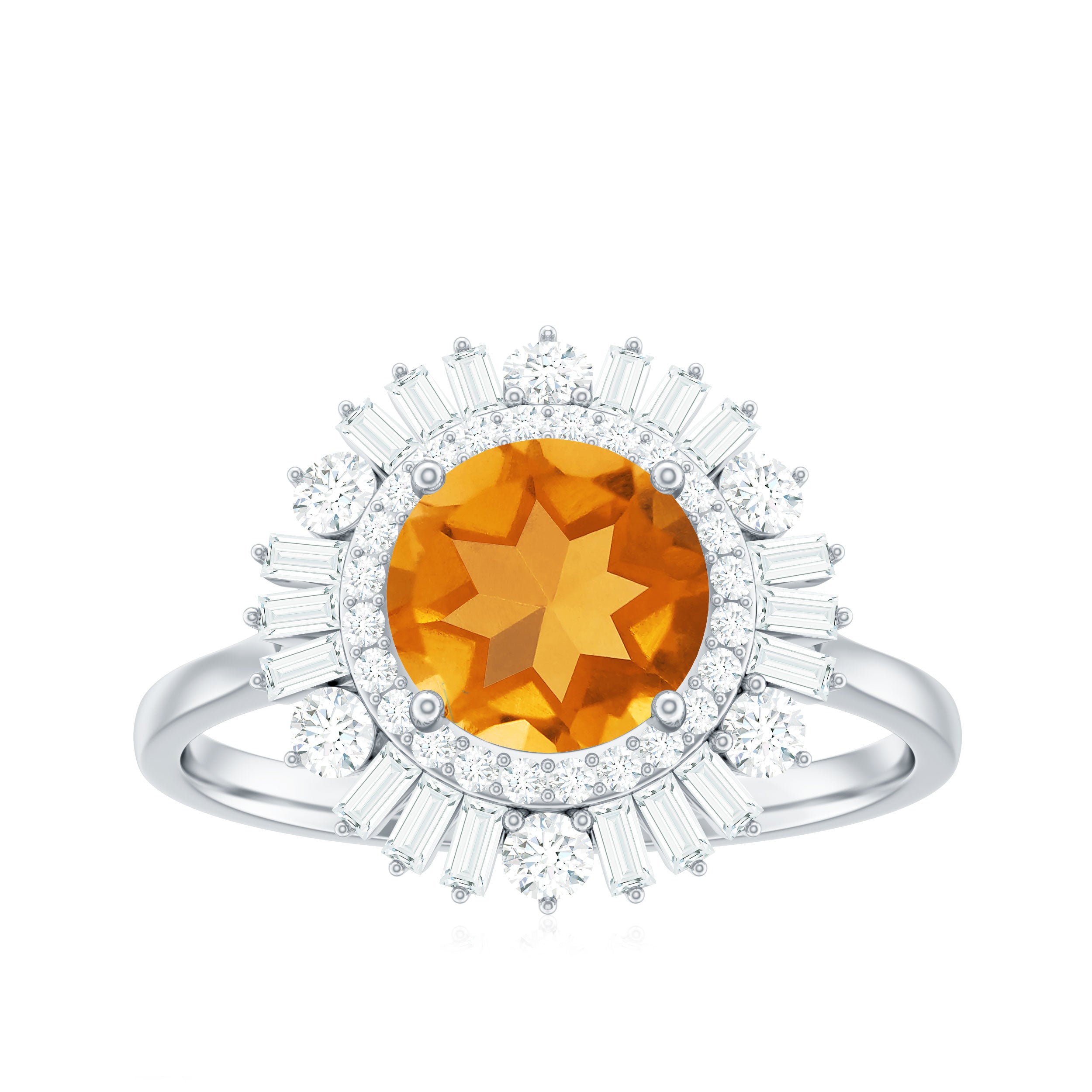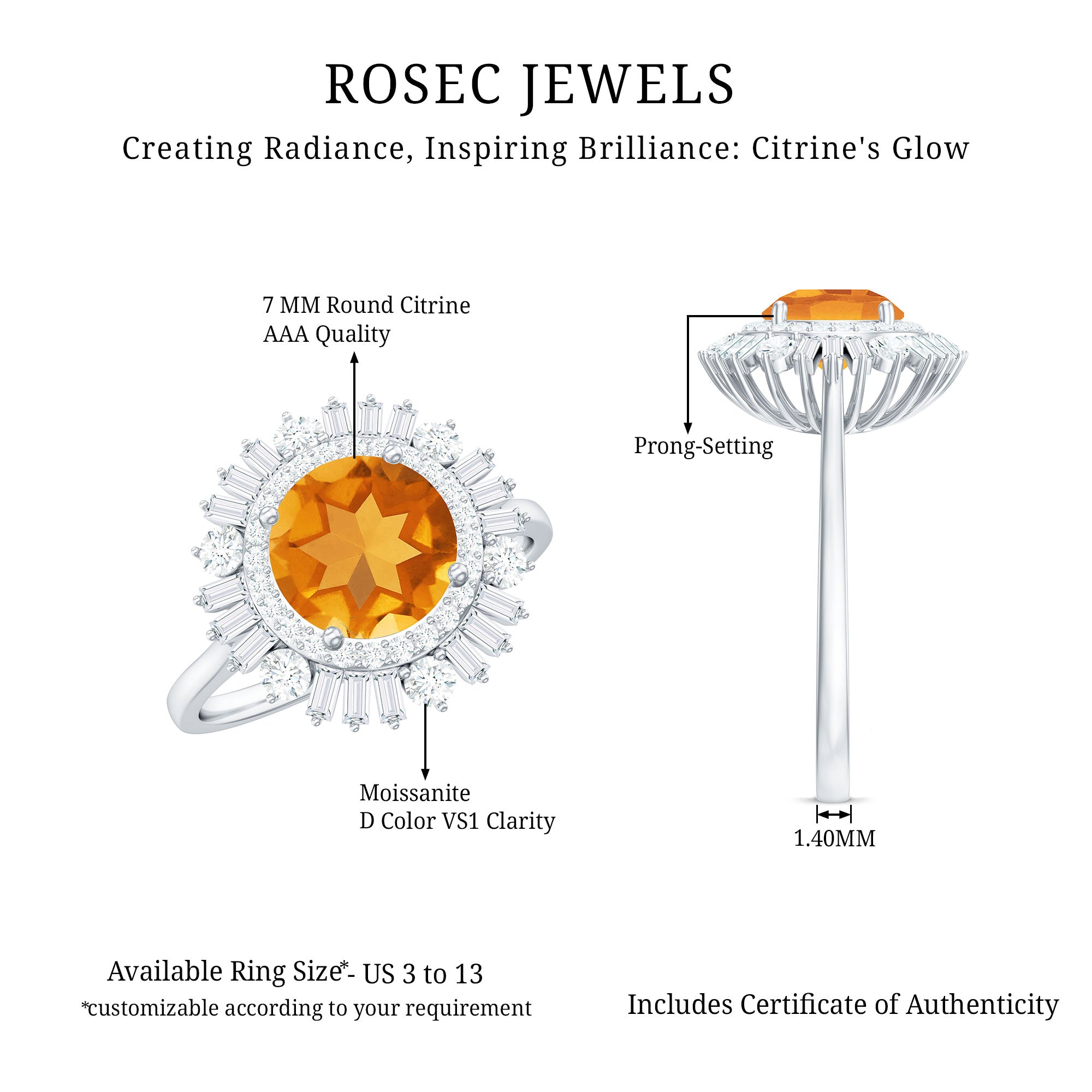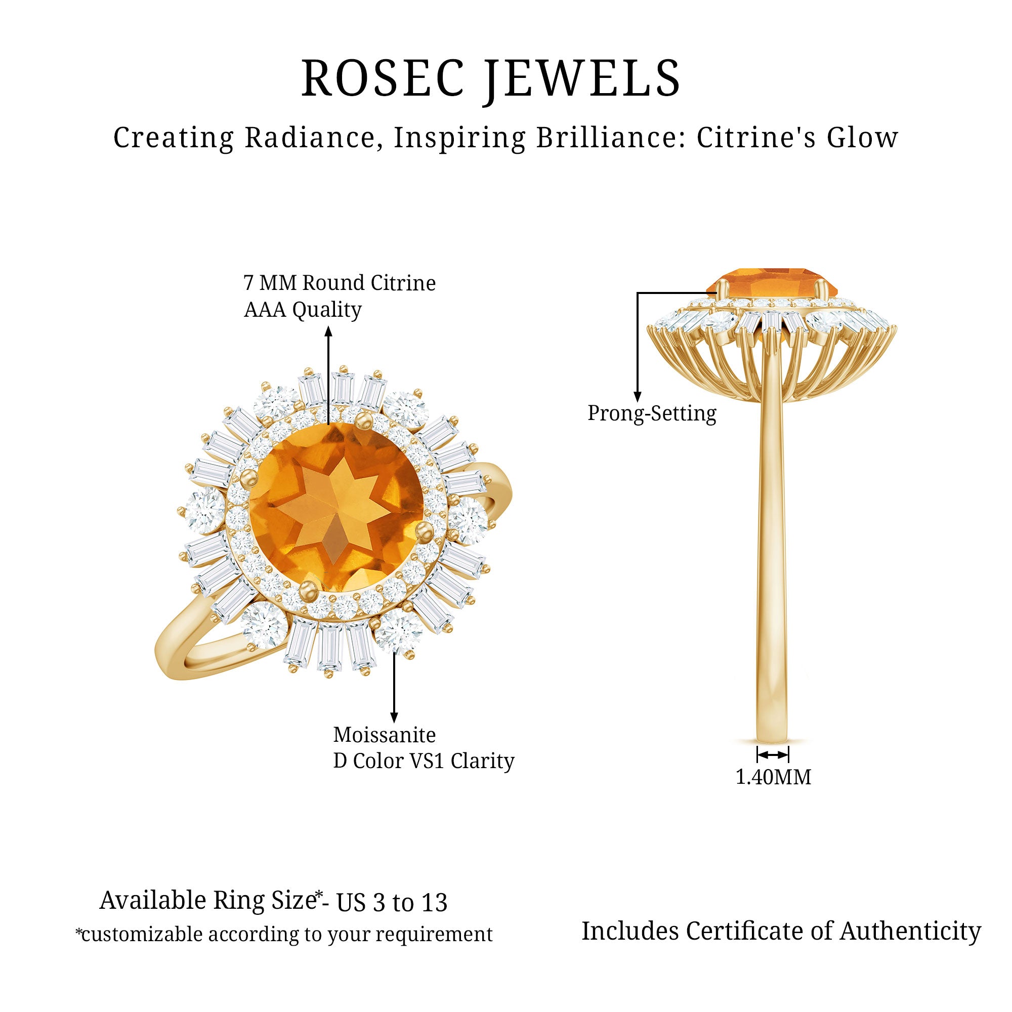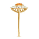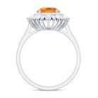 This stunning cocktail ring showcases a gorgeous 7 MM round cut Citrine in a prong setting, beautifully complemented by moissanite stones arranged in a double halo design. Perfect for any occasion, this unique piece of jewelry stands out on its own. Its classic and timeless appeal also makes it a wonderful gift for your loved ones. With a total weight of 2 carats and AAA quality, the Citrine gemstone is of exceptional value, and all our gemstones are certified and undergo rigorous quality checks. Make a statement with this breathtaking Citrine engagement ring.
