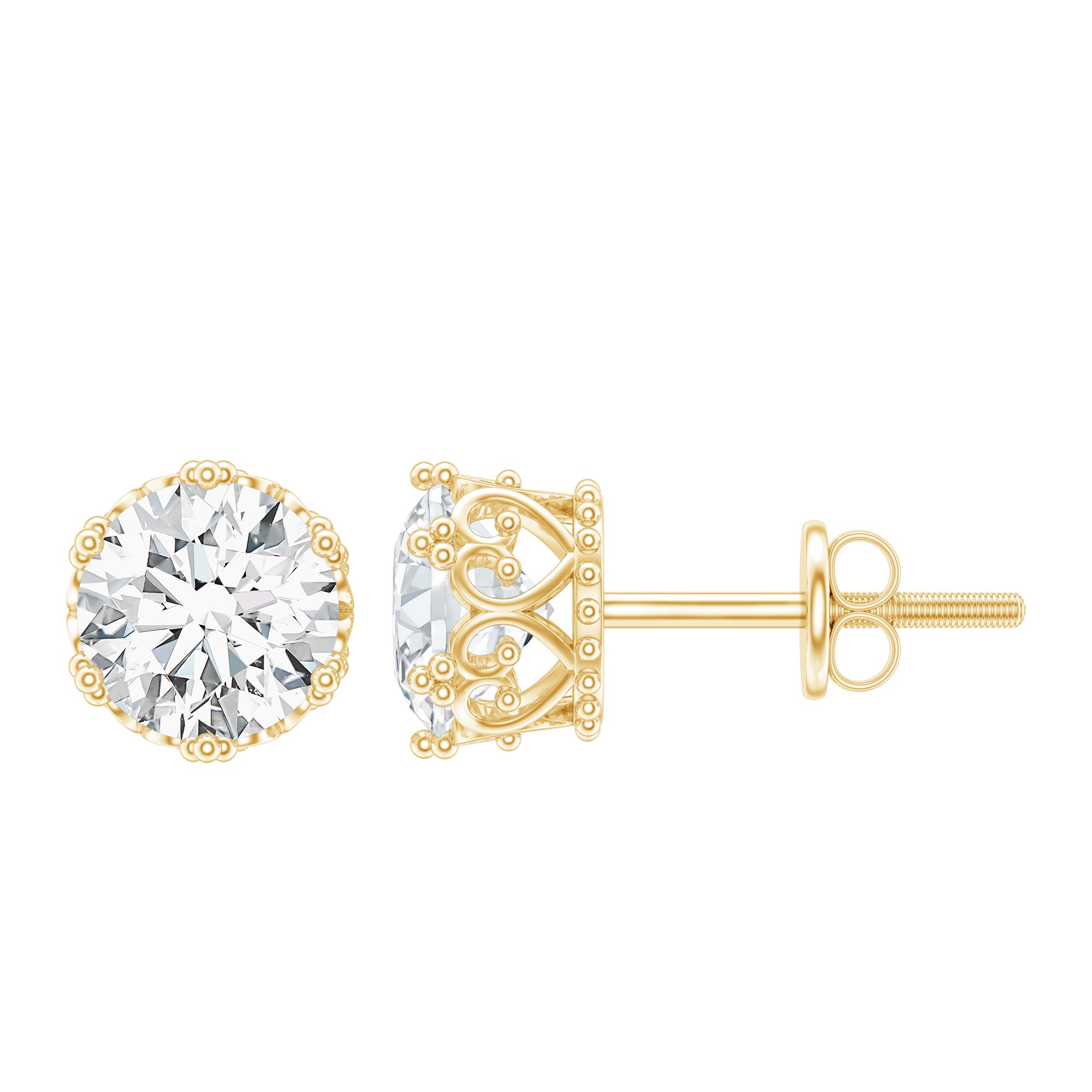 Turn heads wherever you go with these stunning Solitaire Stud Earrings that bring classic sparkle with a royal twist. Each earring features a brilliant 6 MM cubic zirconia of AAAAA quality, with a total weight of approximately 2 carats (1 carat per stud). The stones are designed to catch the light beautifully, giving off a dazzling shine that feels elegant and eye-catching. The crown style setting adds a regal touch, lifting the cubic zirconia just enough to enhance its brilliance and create that irresistible glow. Adding even more charm, the metal is finished with delicate beaded detailing that brings in a hint of traditional craftsmanship while keeping the overall look modern and stylish. It is a lovely blend of old-world inspiration and contemporary design. Designed for comfort and confidence, these Cubic Zirconia Earrings come with secure screw-back closures, making them ideal for all-day wear. Whether you are dressing up for a special occasion or adding a touch to your everyday outfits, these CZ Stud Earrings fit right in. Timeless, glamorous, and easy to love, these Everyday Earrings are a must-have for anyone who enjoys jewelry with a royal feel and lasting sparkle.