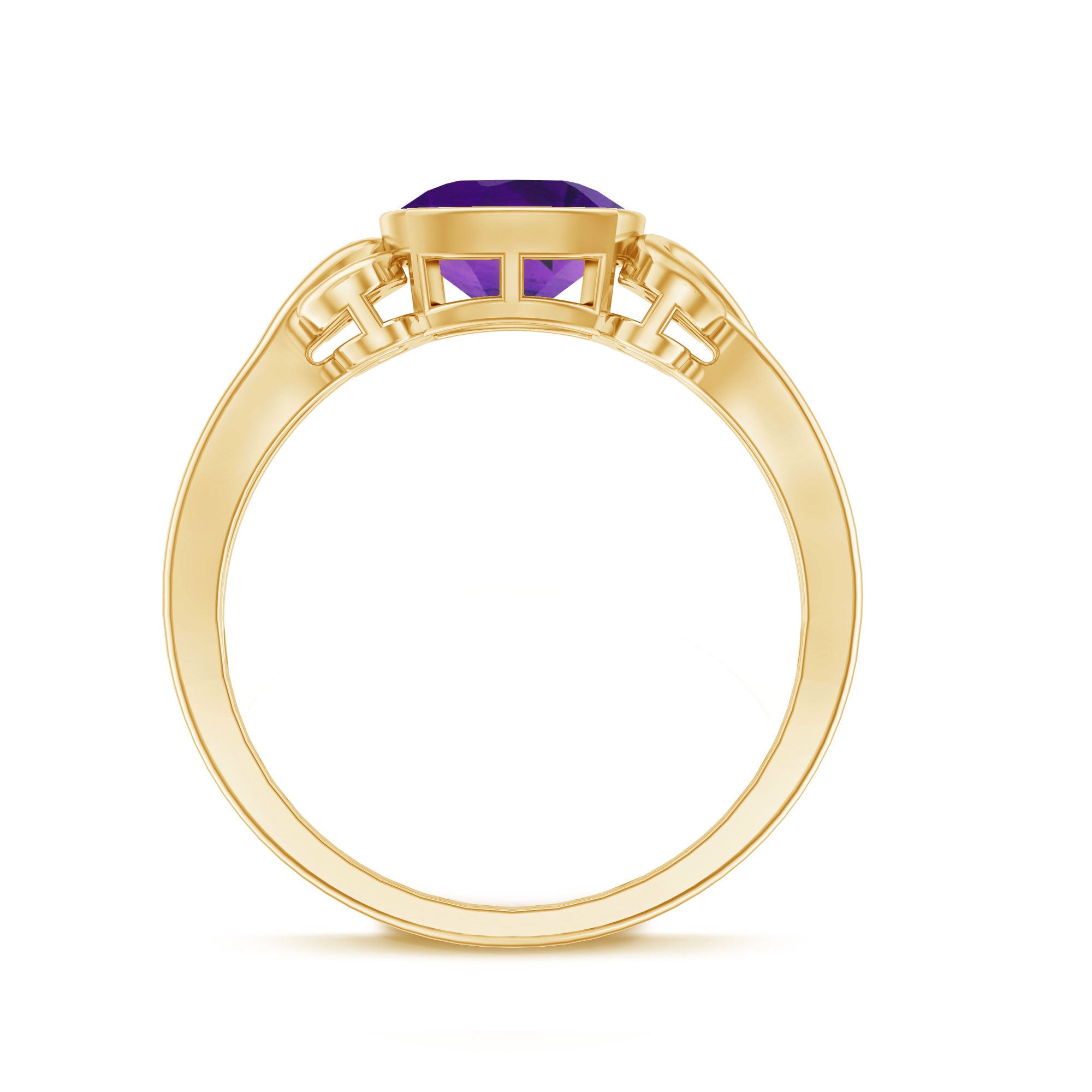 Featuring a charming gold mount, this Cushion Solitaire Ring is an exquisite piece of jewelry. The ring boasts a dazzling Cushion Cut Amethyst that is set in a bezel setting, creating a stunning solitaire design. The gold vintage design further adds to its magnificence. Give your special lady the gift of elegance with this gold bezel set amethyst ring this valentines.