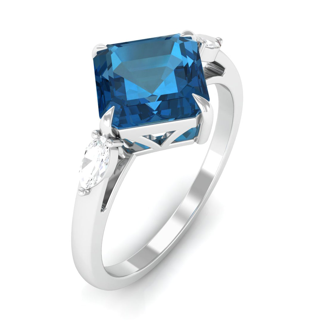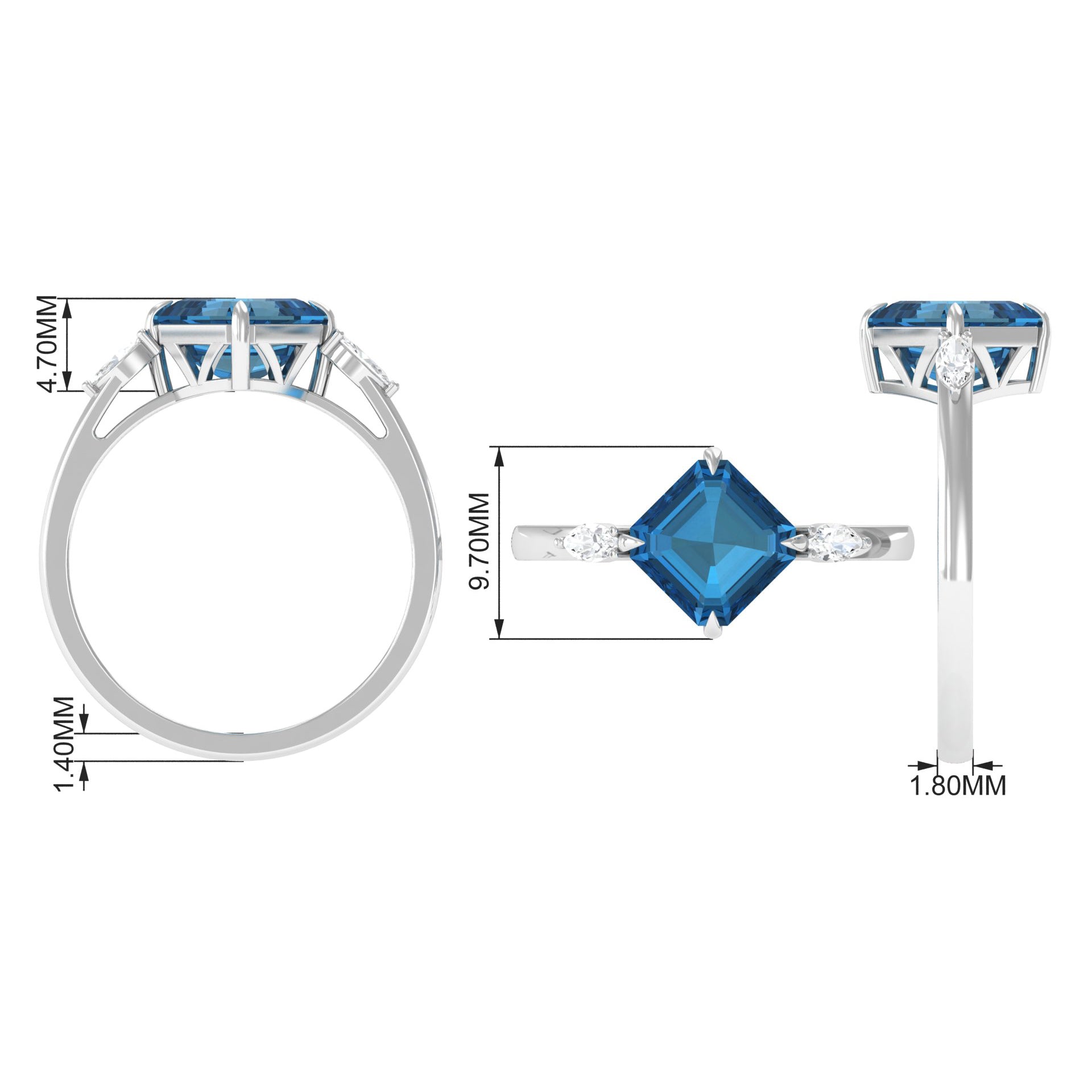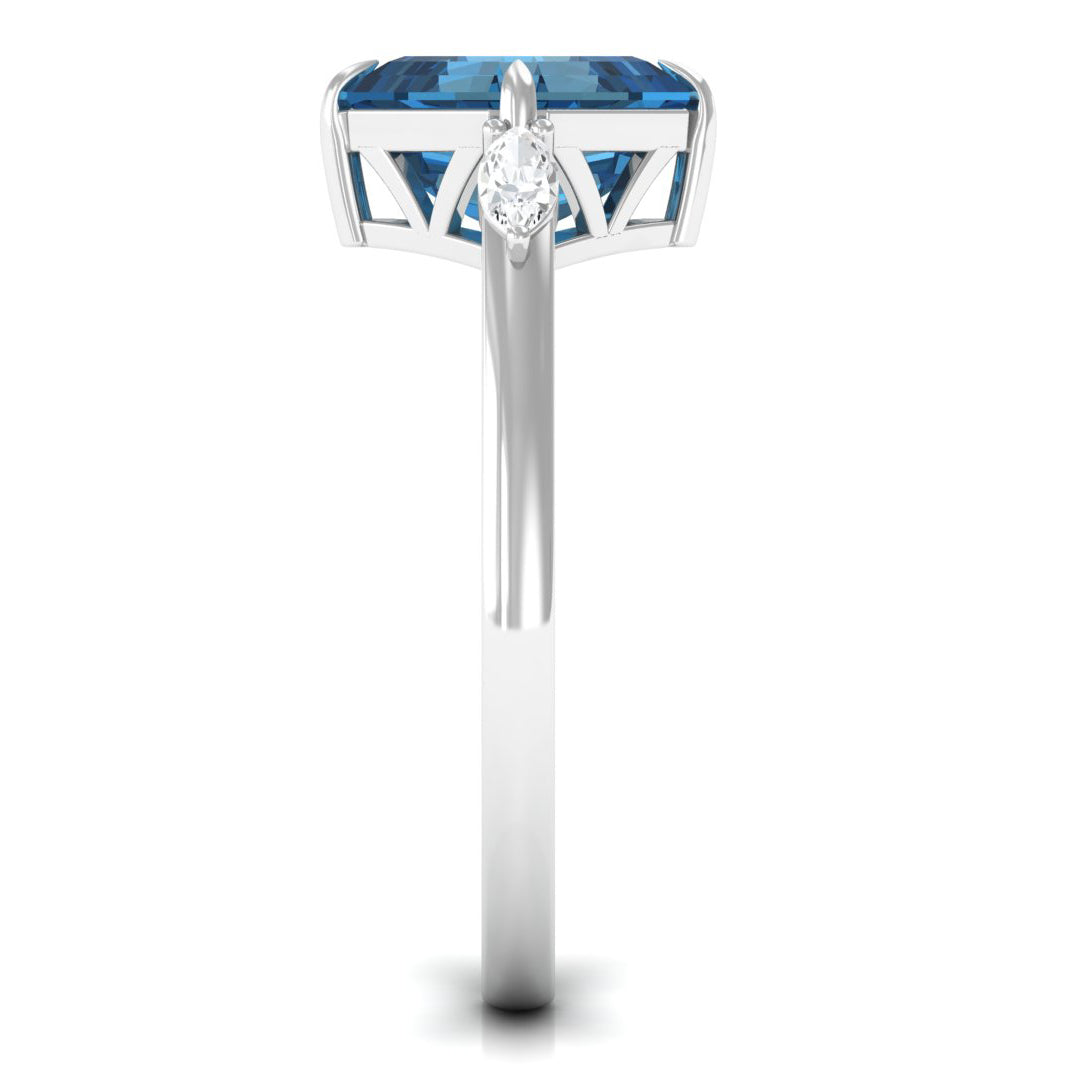8mm Asscher Cut London Blue Topaz Diagonal Solitaire Ring with Marquise Diamond