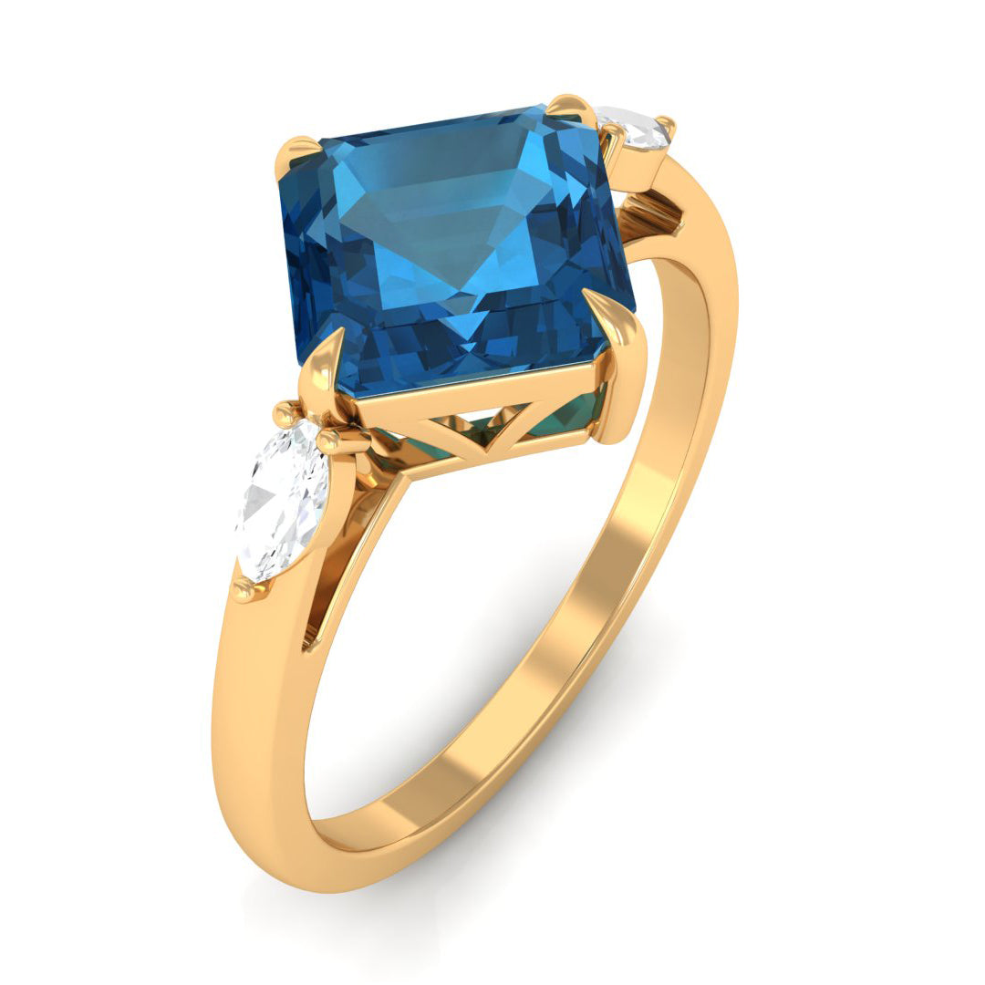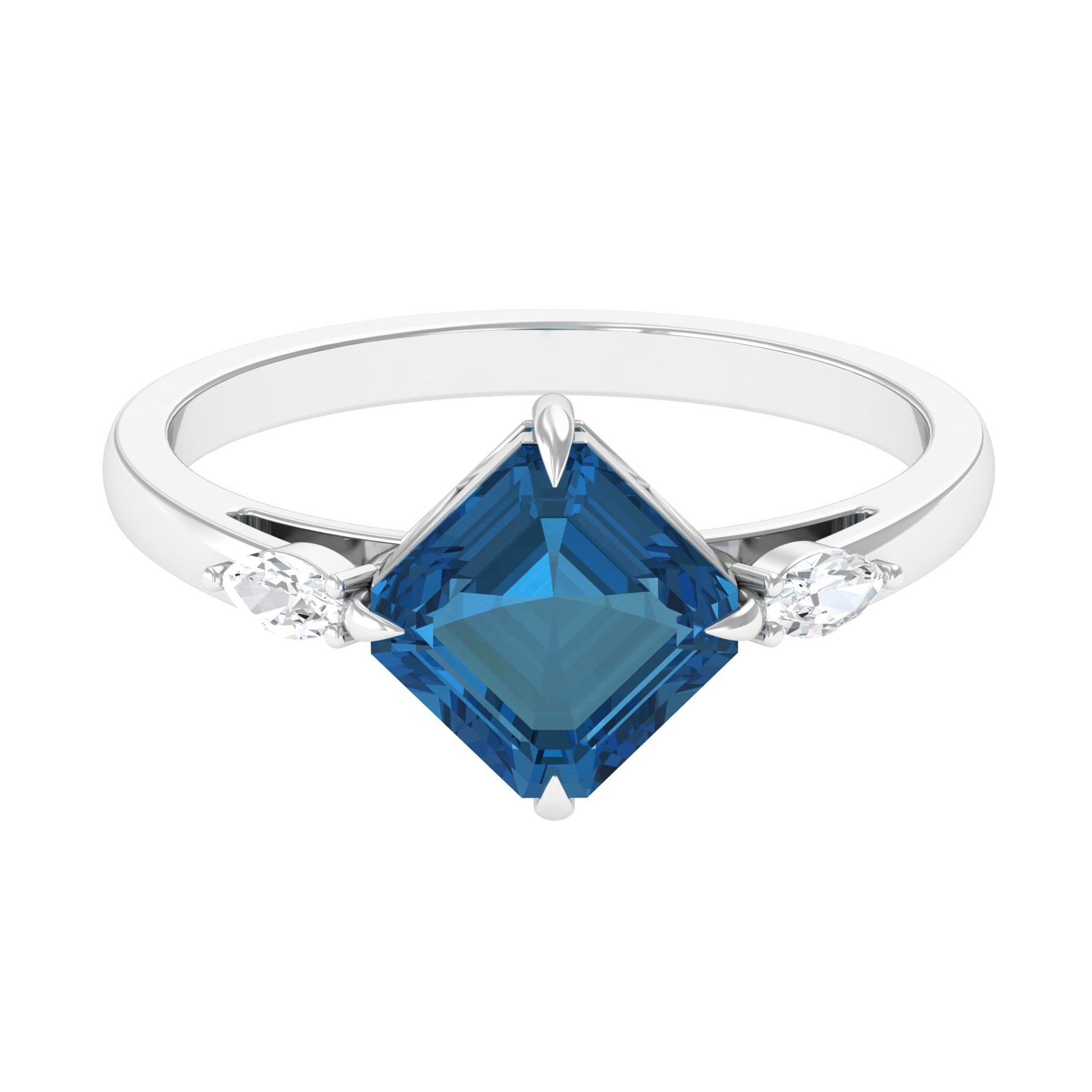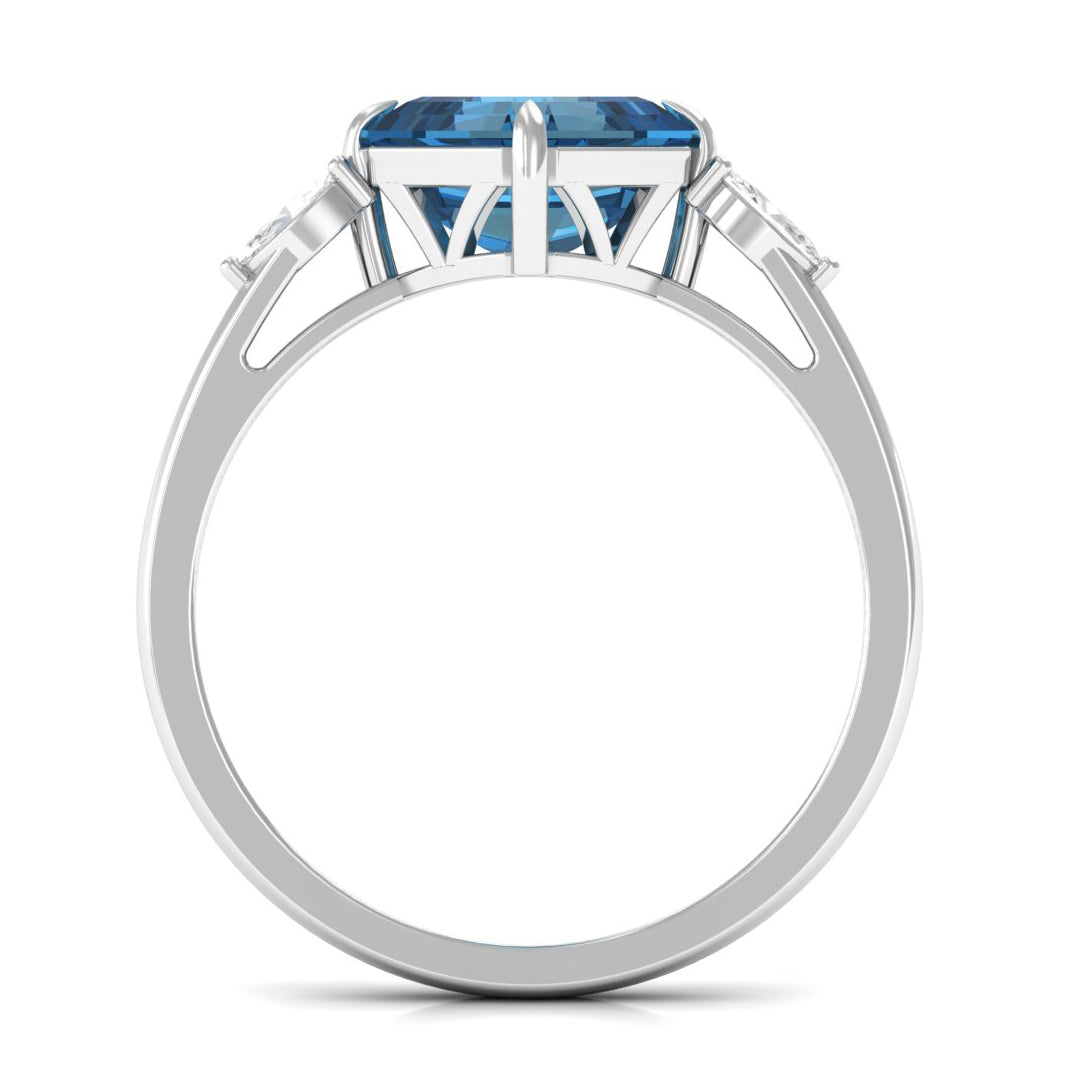 8mm Asscher Cut London Blue Topaz Diagonal Solitaire Ring with Marquise Diamond