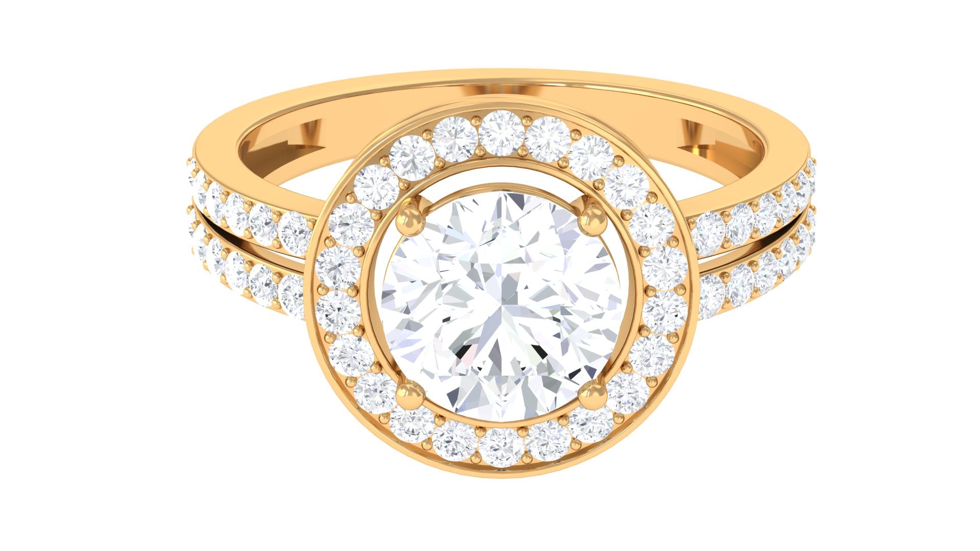 Featuring an elegant Cubic Zirconia Engagement Ring adorned with Round cut Zircon set at the center of the ring with double band shank in Prong Setting and round cut zircon halo and side stones creates an appealing look. This Classic Zircon Engagement Ring is crafted in Gold for an eye catching and appealing look.